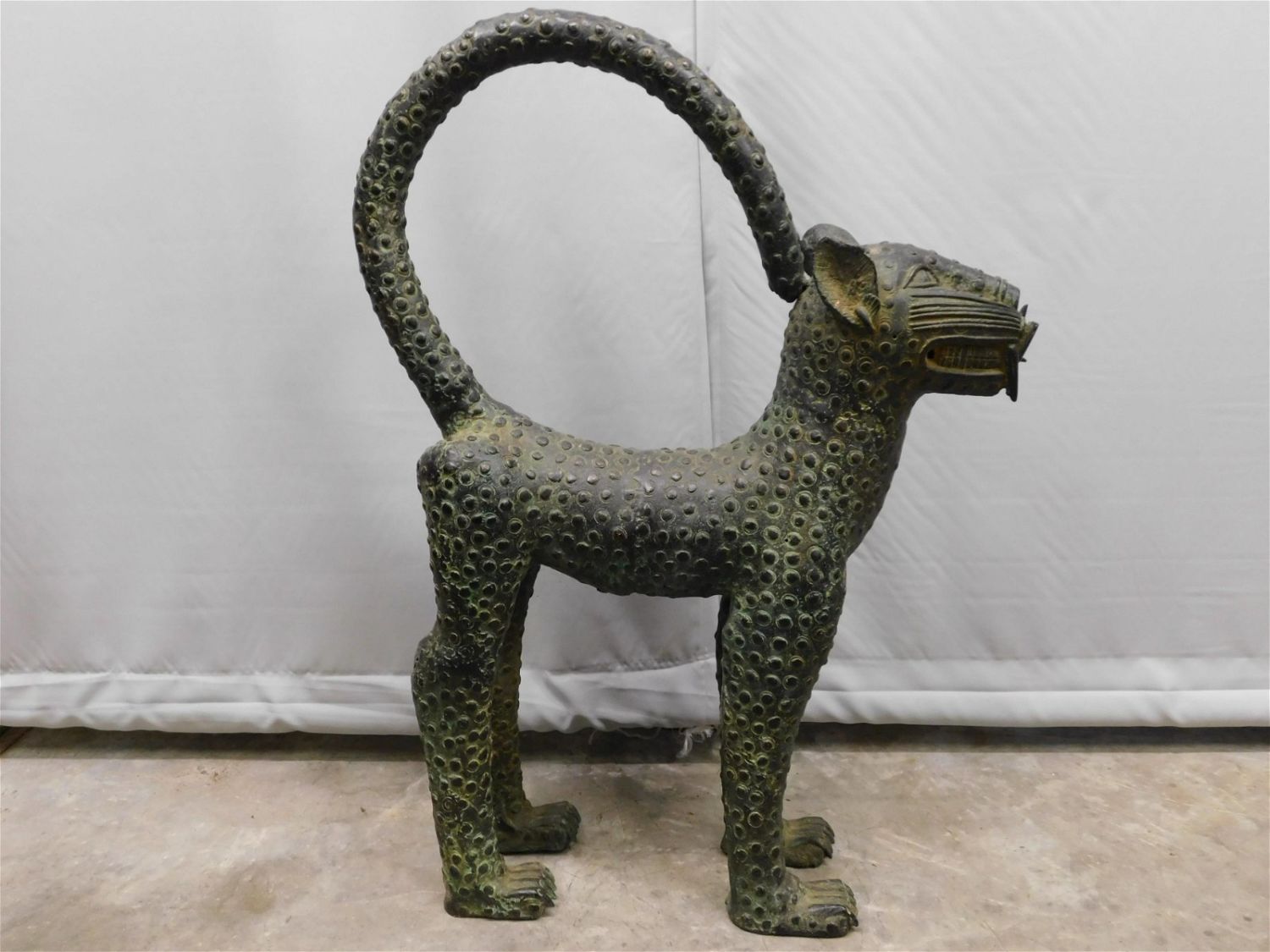 African Bronze Leopard. In the manner of Benin. Does have a break to 1 tooth but has patina like the rest of it. Measures 42.5" tall x 31" wide x 10" deep. Has wear consistent with age. Any questions, contact us. All invoices must be paid within 24 hours of the sale. There are 3 Shipping Options. Please read the Terms of Sale and Shipping Options in the Terms. If you don’t read the terms, you will be upset because you don’t know what is happening. Local pickups are at our Monmouth Junction location on Thursday, Friday, Saturday and Monday ONLY! All pickups are by appointment only. Any major condition issues will be listed in the description. Please read the terms for full information.