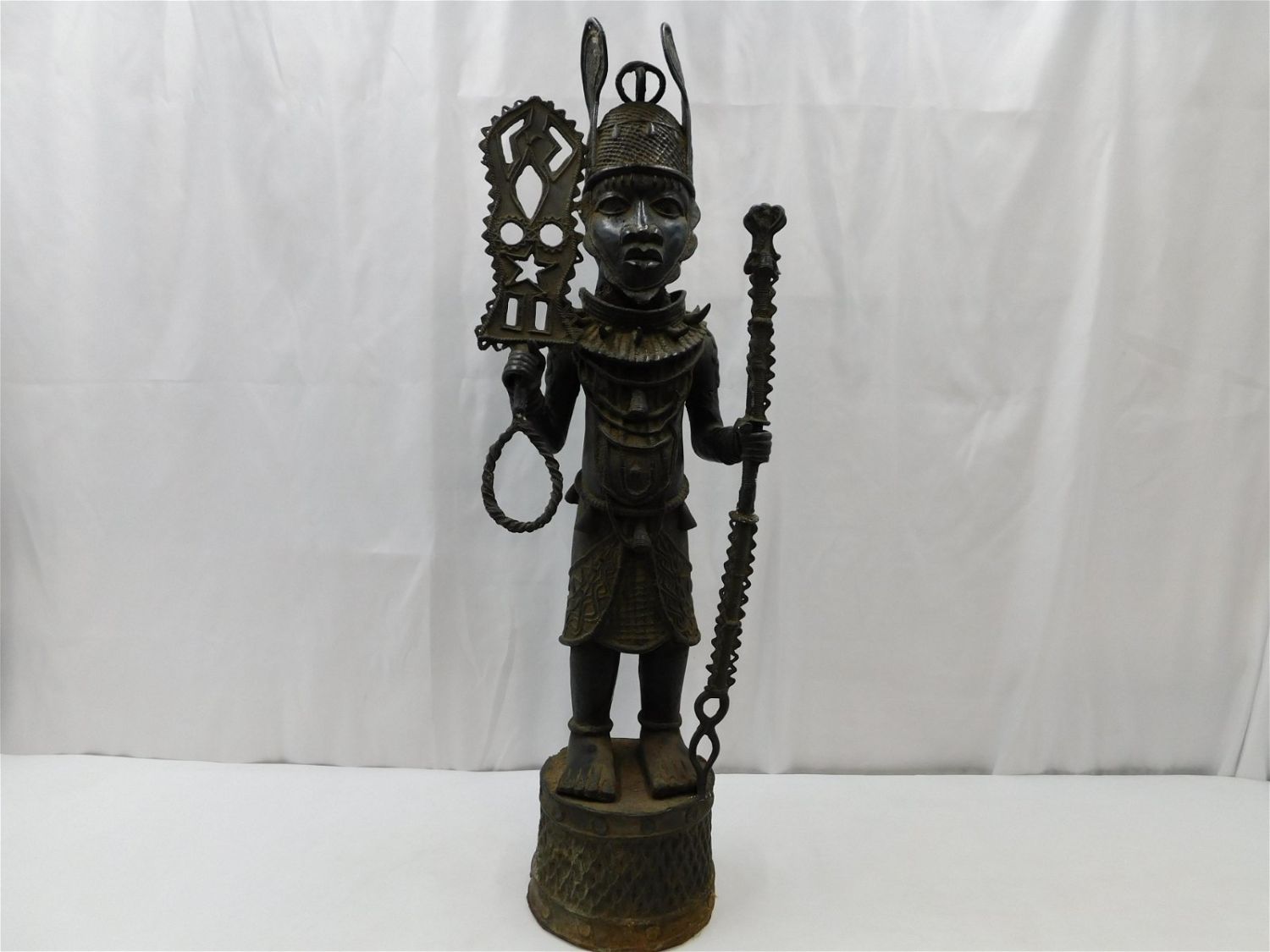 African Bronze Warrior Statue. In the manner of Benin. Measures 38" tall x 14" wide x 10" deep. Has wear consistent with age. Any questions, contact us. All invoices must be paid within 24 hours of the sale. There are 3 Shipping Options. Please read the Terms of Sale and Shipping Options in the Terms. If you don’t read the terms, you will be upset because you don’t know what is happening. Local pickups are at our Monmouth Junction location on Thursday, Friday, Saturday and Monday ONLY! All pickups are by appointment only. Any major condition issues will be listed in the description. Please read the terms for full information.
