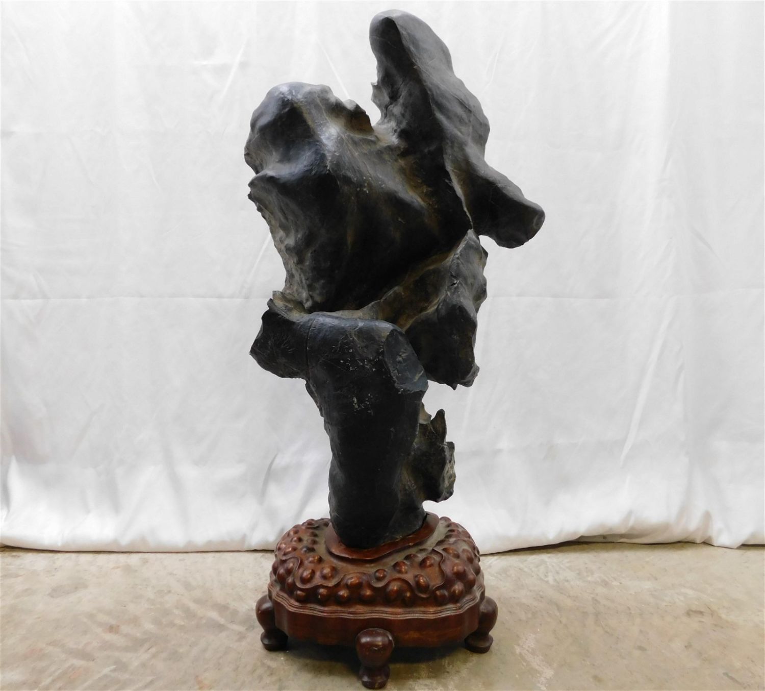 Chinese Lingbei Scholar Stone Sculpture on Teak Wood Base. Measures 39" tall x 29" wide x 12" deep. Has wear consistent with age. Any questions, contact us. All invoices must be paid within 24 hours of the sale. There are 3 Shipping Options. Please read the Terms of Sale and Shipping Options in the Terms. If you don’t read the terms, you will be upset because you don’t know what is happening. Local pickups are at our Monmouth Junction location on Thursday, Friday, Saturday and Monday ONLY! All pickups are by appointment only. Any major condition issues will be listed in the description. Please read the terms for full information.
