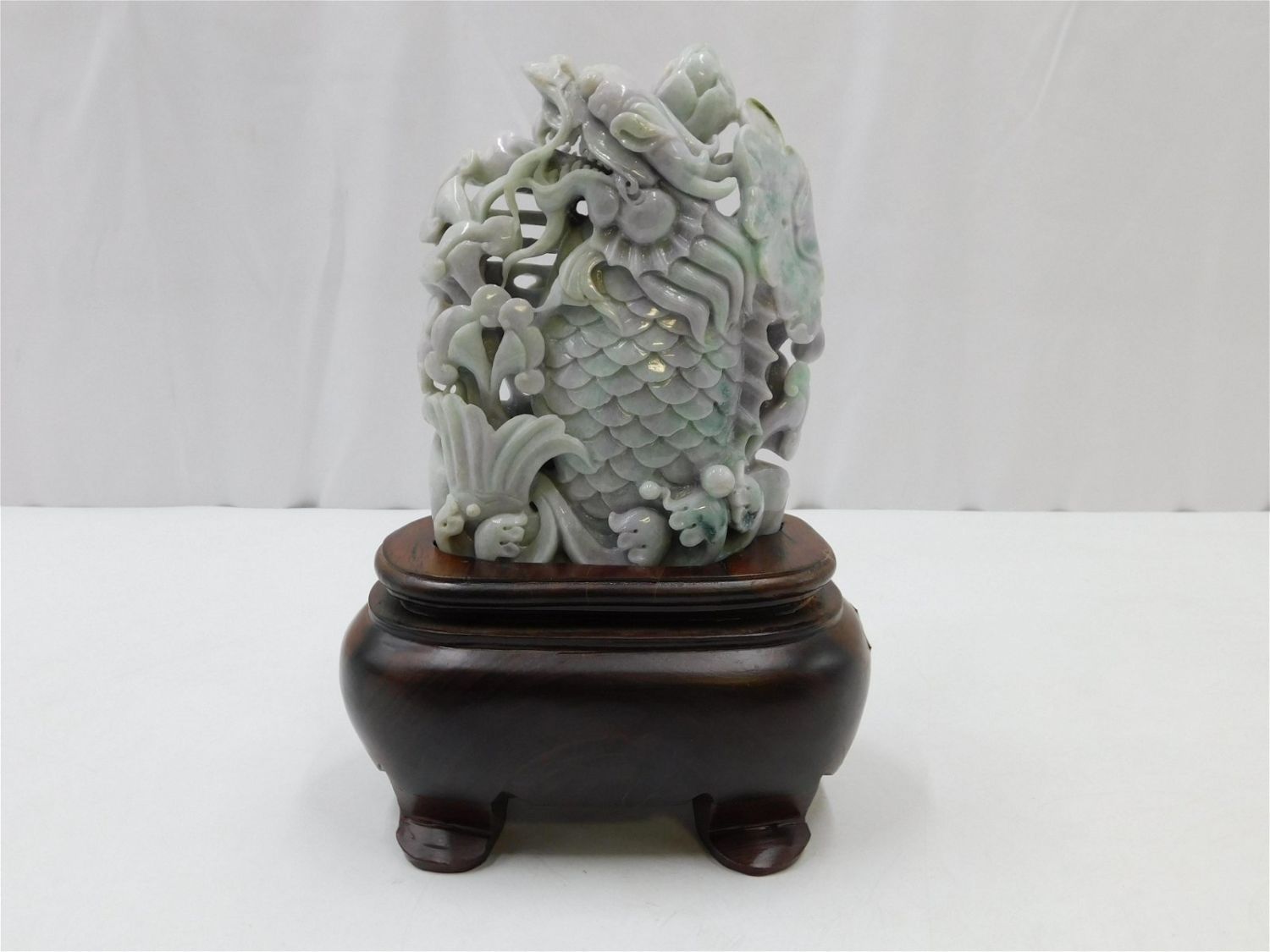 Hand Carved Chinese Hard Stone Mythological Fish with Flowers Figure. Comes on wooden stand. Either soapstone or jade. Measures 11" tall x 8" wide x 4" deep. Has wear consistent with age. Any questions, contact us. All invoices must be paid within 24 hours of the sale. There are 3 Shipping Options. Please read the Terms of Sale and Shipping Options in the Terms. If you don’t read the terms, you will be upset because you don’t know what is happening. Local pickups are at our Monmouth Junction location on Thursday, Friday, Saturday and Monday ONLY! All pickups are by appointment only. Any major condition issues will be listed in the description. Please read the terms for full information.