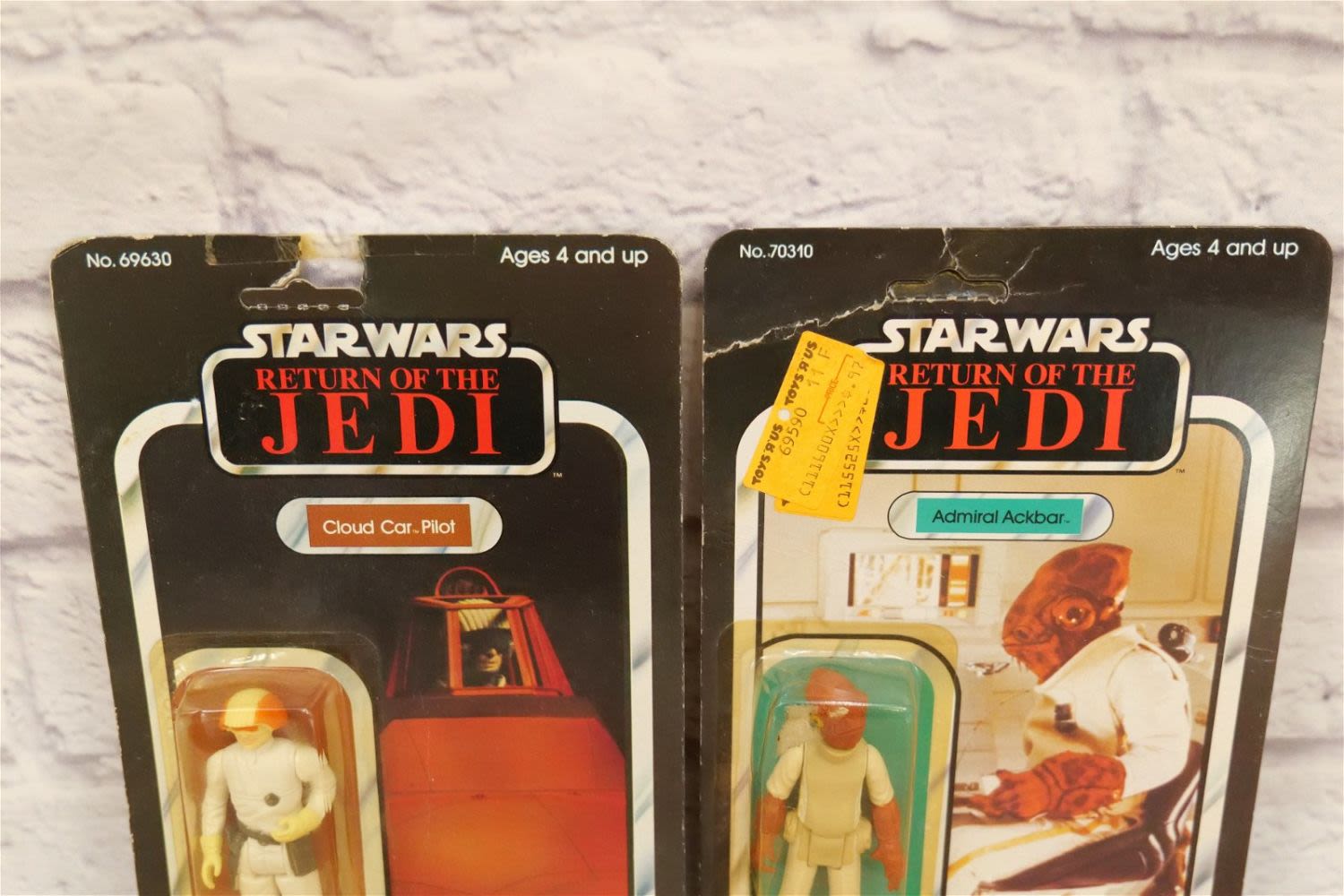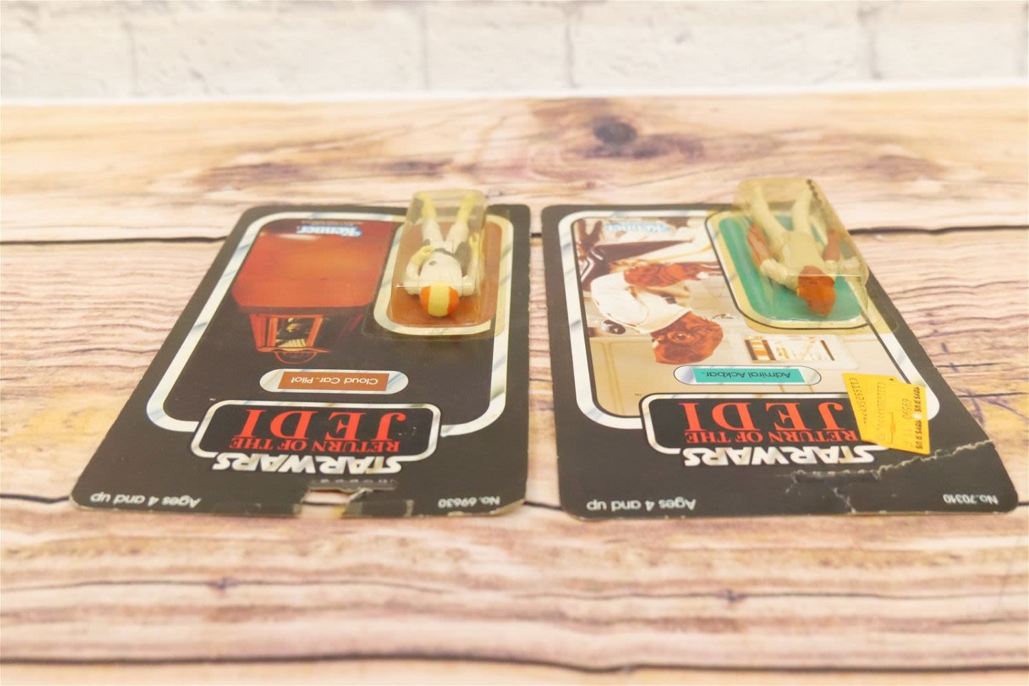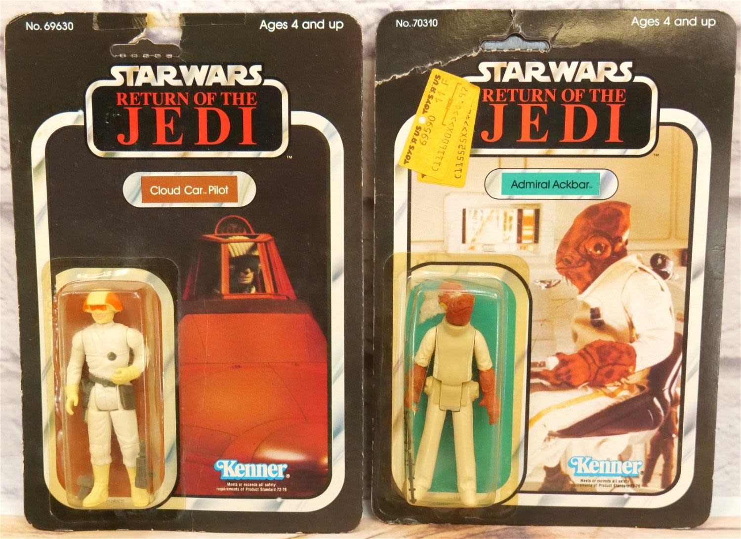 Lot of 2 Kenner ROTJ Return of the Jedi Action Figures including Cloud Car Pilot No. 69630 – 65 Card Back and Admiral Ackbar No. 70310 – 65 Card Back. Both Mint on Card. Cards have wear including heavy creasing. All invoices must be paid within 24 hours of the sale. We offer multiple shipping options, please read the terms as they have changed. We also offer Pick-Ups Thursday, Friday, Saturday, and Monday immediately following the sale. BY APPOINTMENT ONLY. PLEASE READ THE NEW TERMS!!!