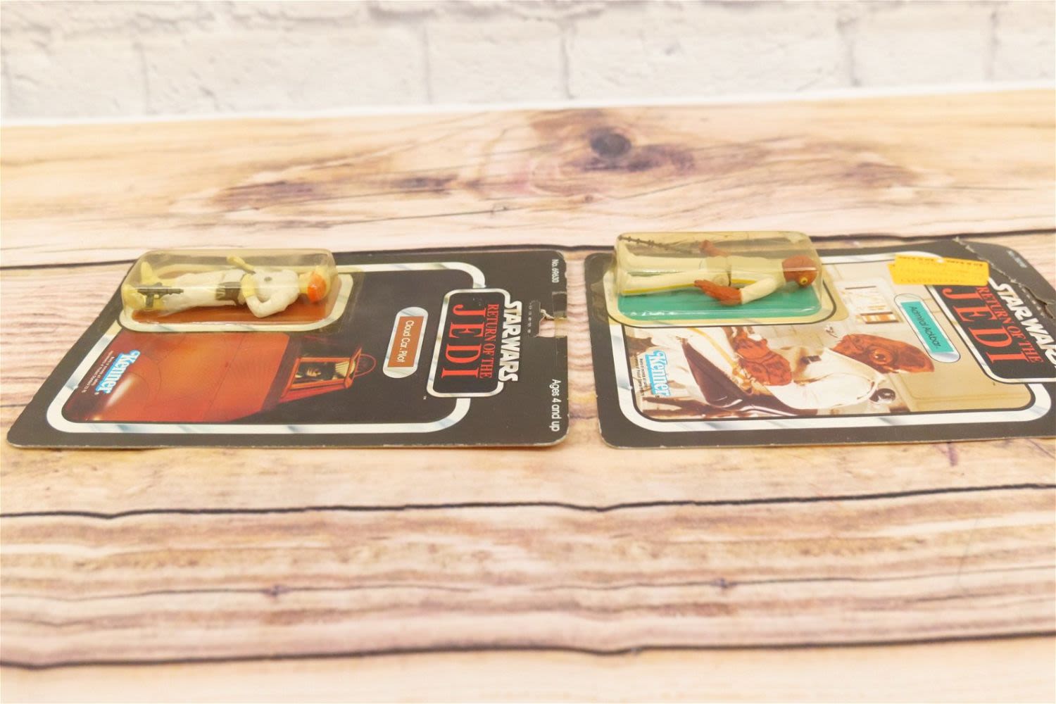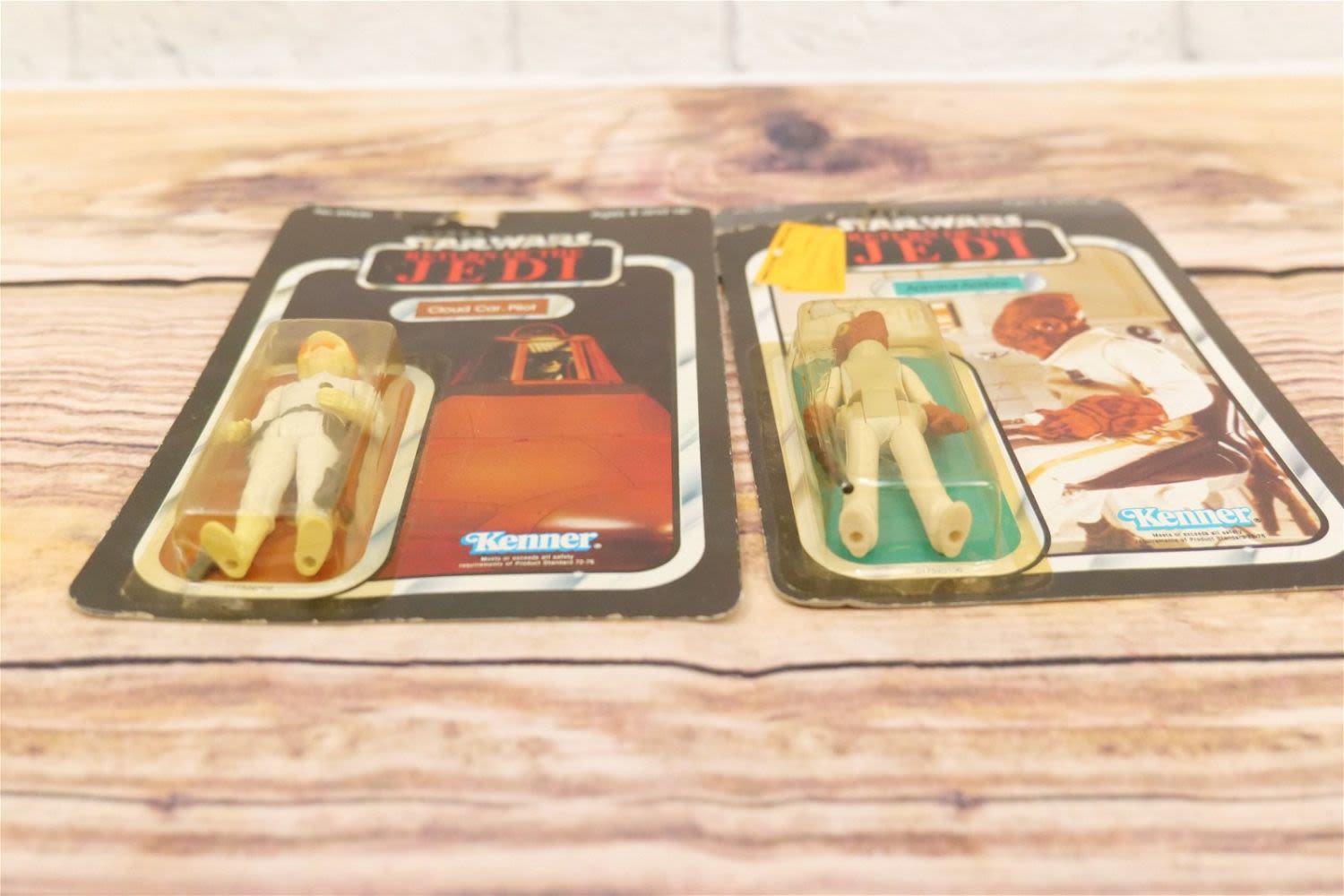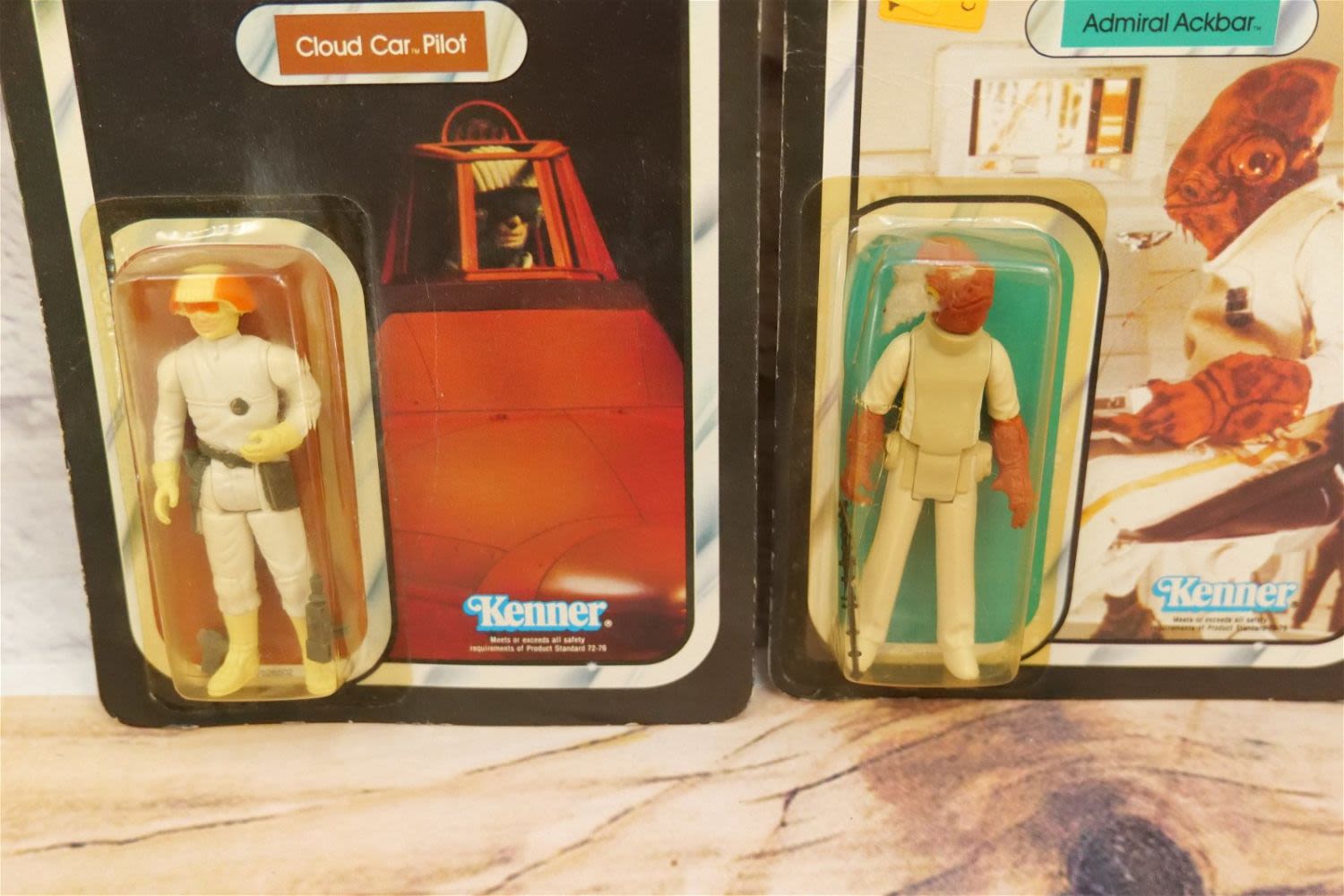 Lot of 2 Kenner ROTJ Return of the Jedi Action Figures including Cloud Car Pilot No. 69630 – 65 Card Back and Admiral Ackbar No. 70310 – 65 Card Back. Both Mint on Card. Cards have wear including heavy creasing. All invoices must be paid within 24 hours of the sale. We offer multiple shipping options, please read the terms as they have changed. We also offer Pick-Ups Thursday, Friday, Saturday, and Monday immediately following the sale. BY APPOINTMENT ONLY. PLEASE READ THE NEW TERMS!!!