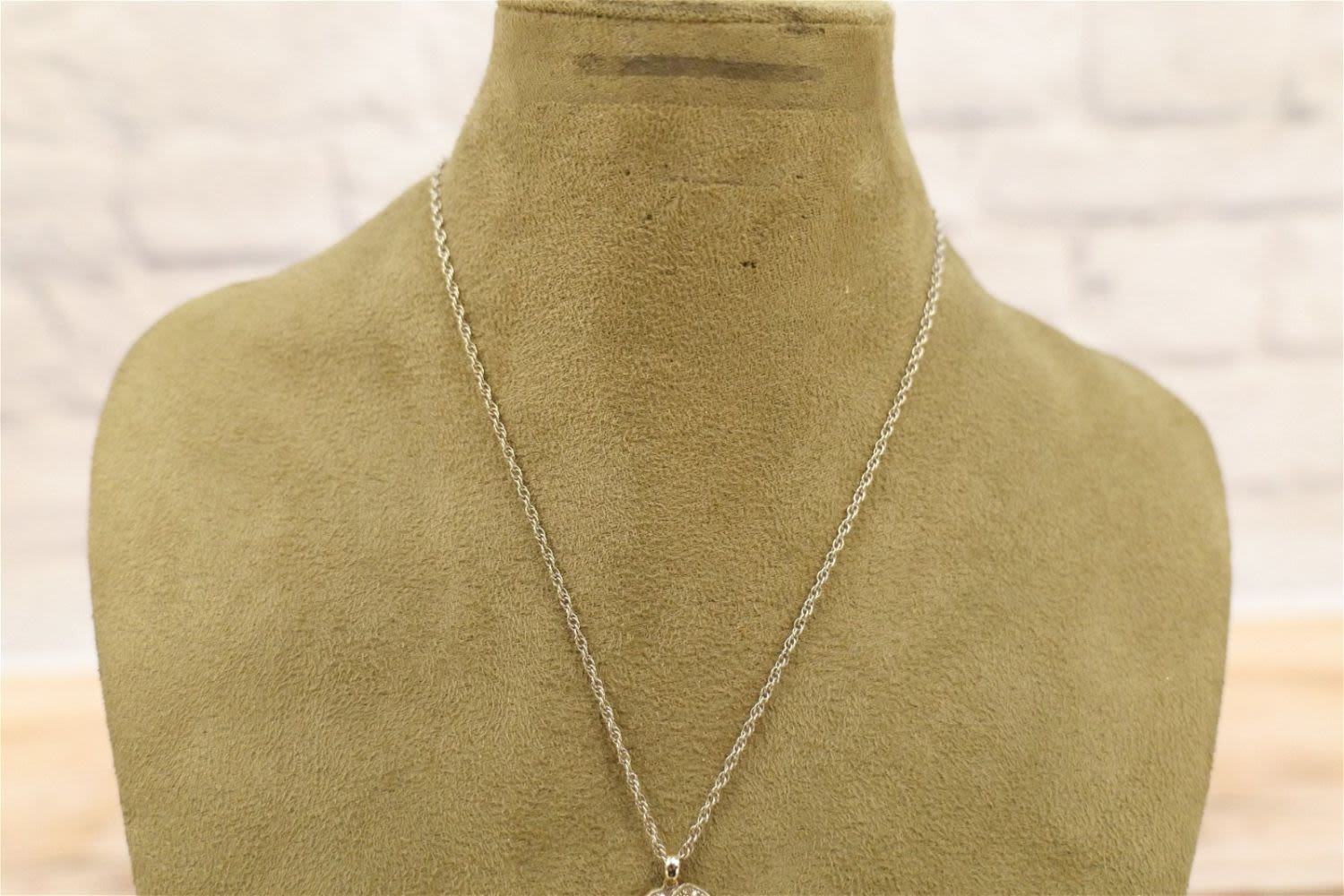 18kt and Diamond White Gold Floral Pendant with Larger Amber Colored Diamond in Center on Sterling Silver Chain. Pendant measures 1". Chain measures 15". All invoices must be paid within 24 hours of the sale. We offer multiple shipping options, please read the terms as they have changed. We also offer Pick-Ups Friday, Saturday, and Monday immediately following the sale. BY APPOINTMENT ONLY. PLEASE READ THE NEW TERMS!!!