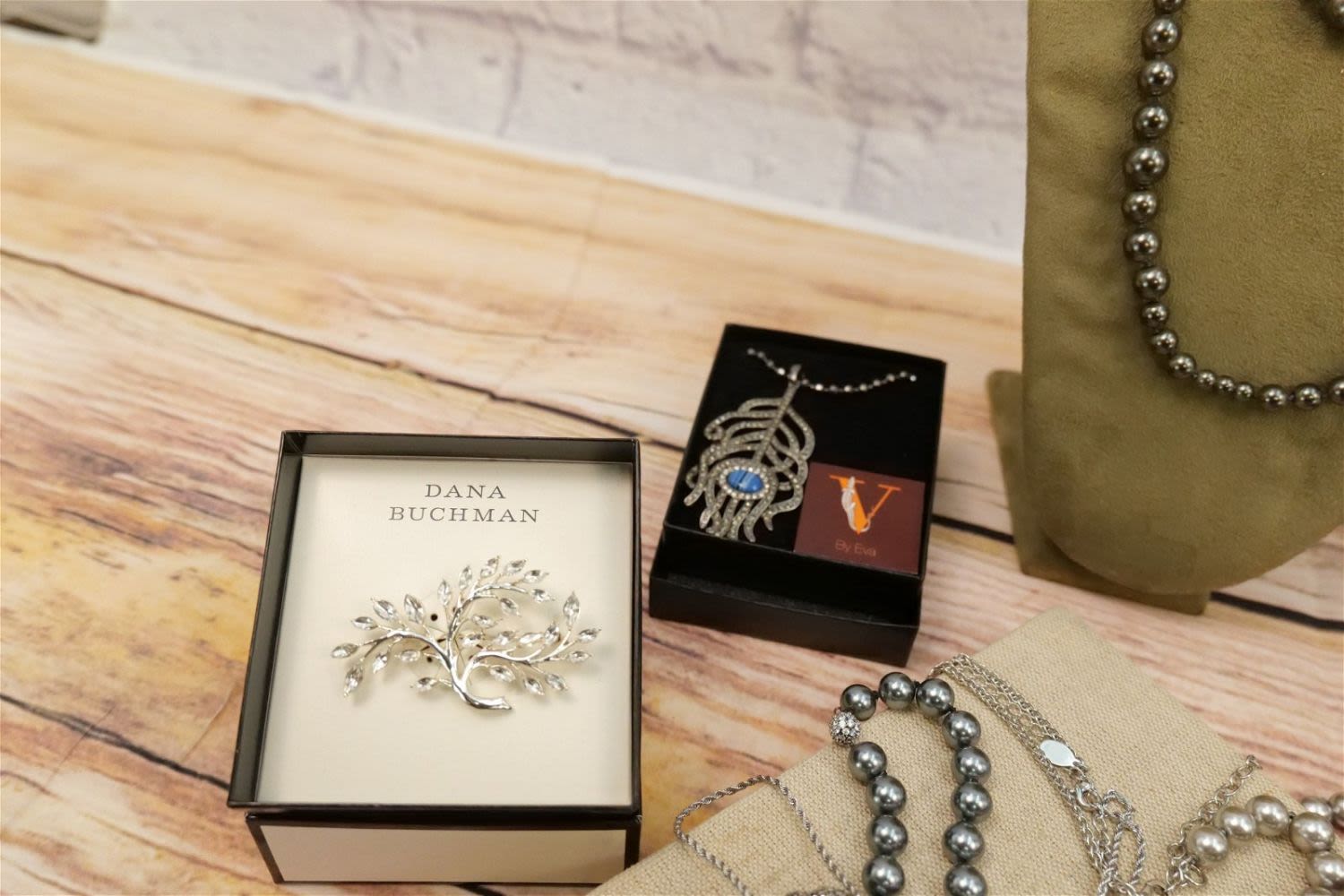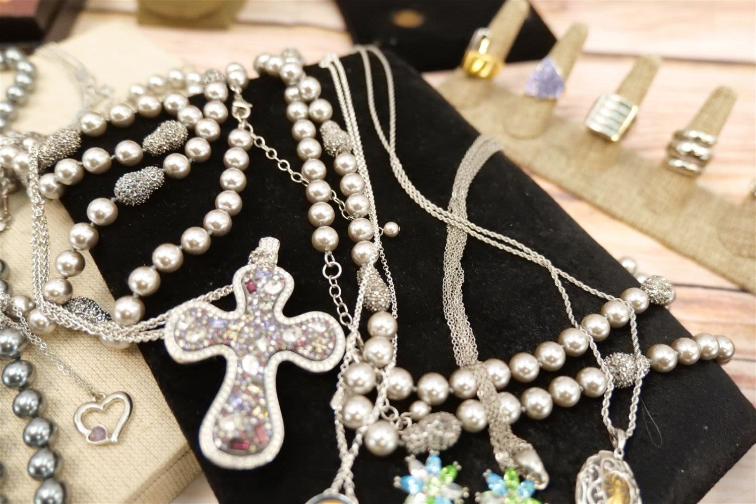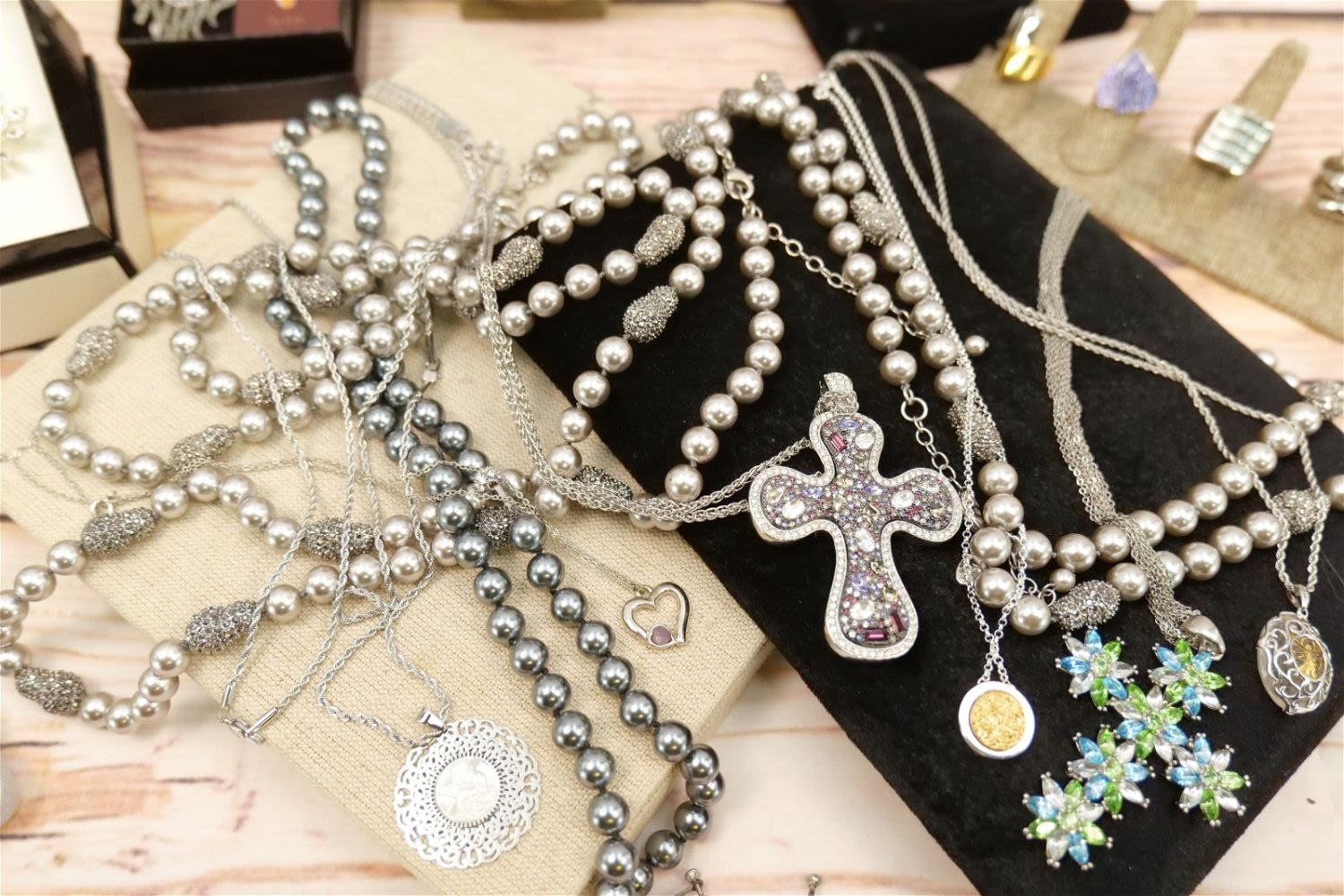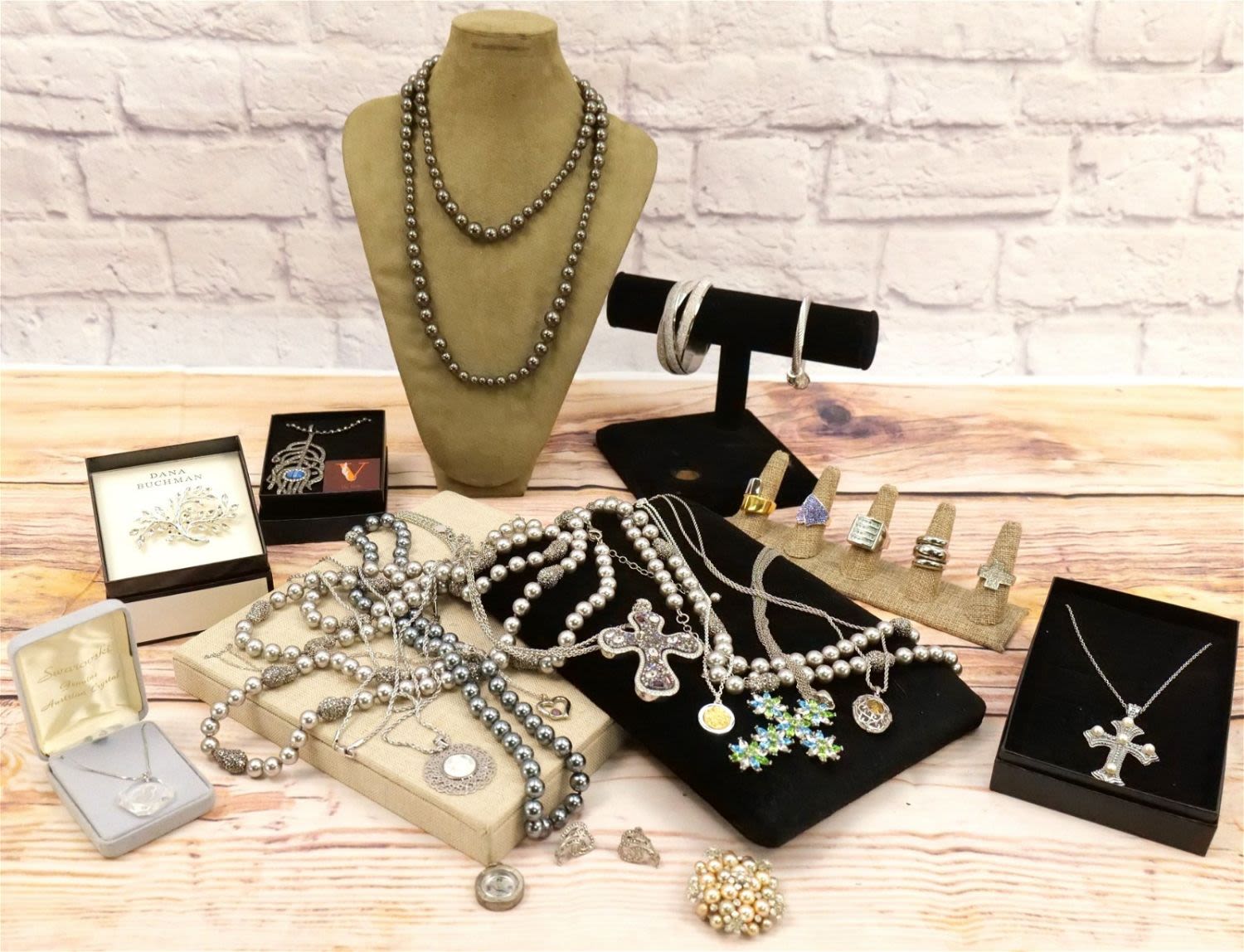 Lot of Silvertone Jewelry including Faux Pearls, Droozy Style bangles and Pendants, Oversized Crystal Cross, Rings, Dana Buchman Pin, Peacock Feather Pendant and More. All invoices must be paid within 24 hours of the sale. We offer multiple shipping options, please read the terms as they have changed. We also offer Pick-Ups Friday, Saturday, and Monday immediately following the sale. BY APPOINTMENT ONLY. PLEASE READ THE NEW TERMS!!!