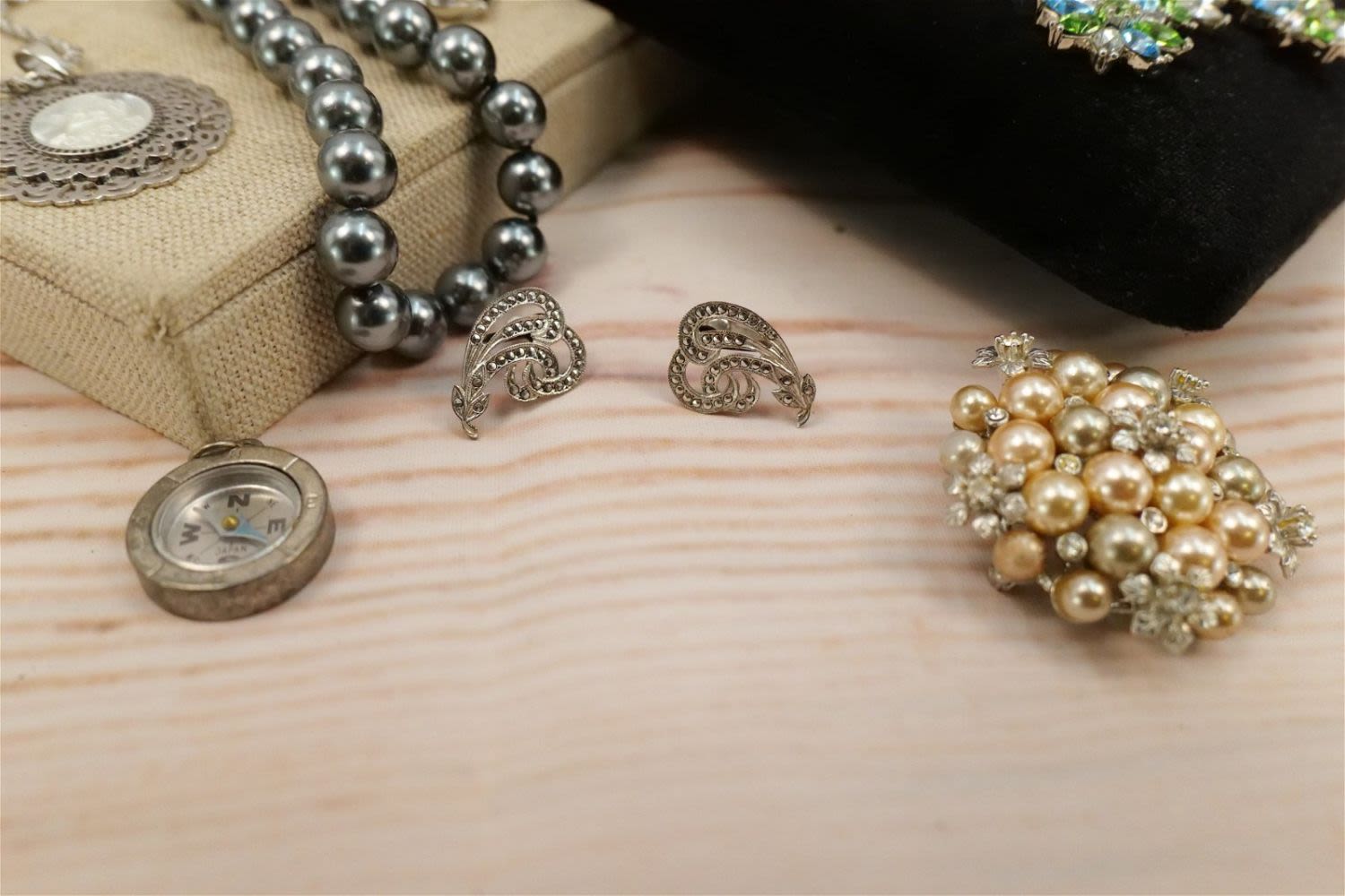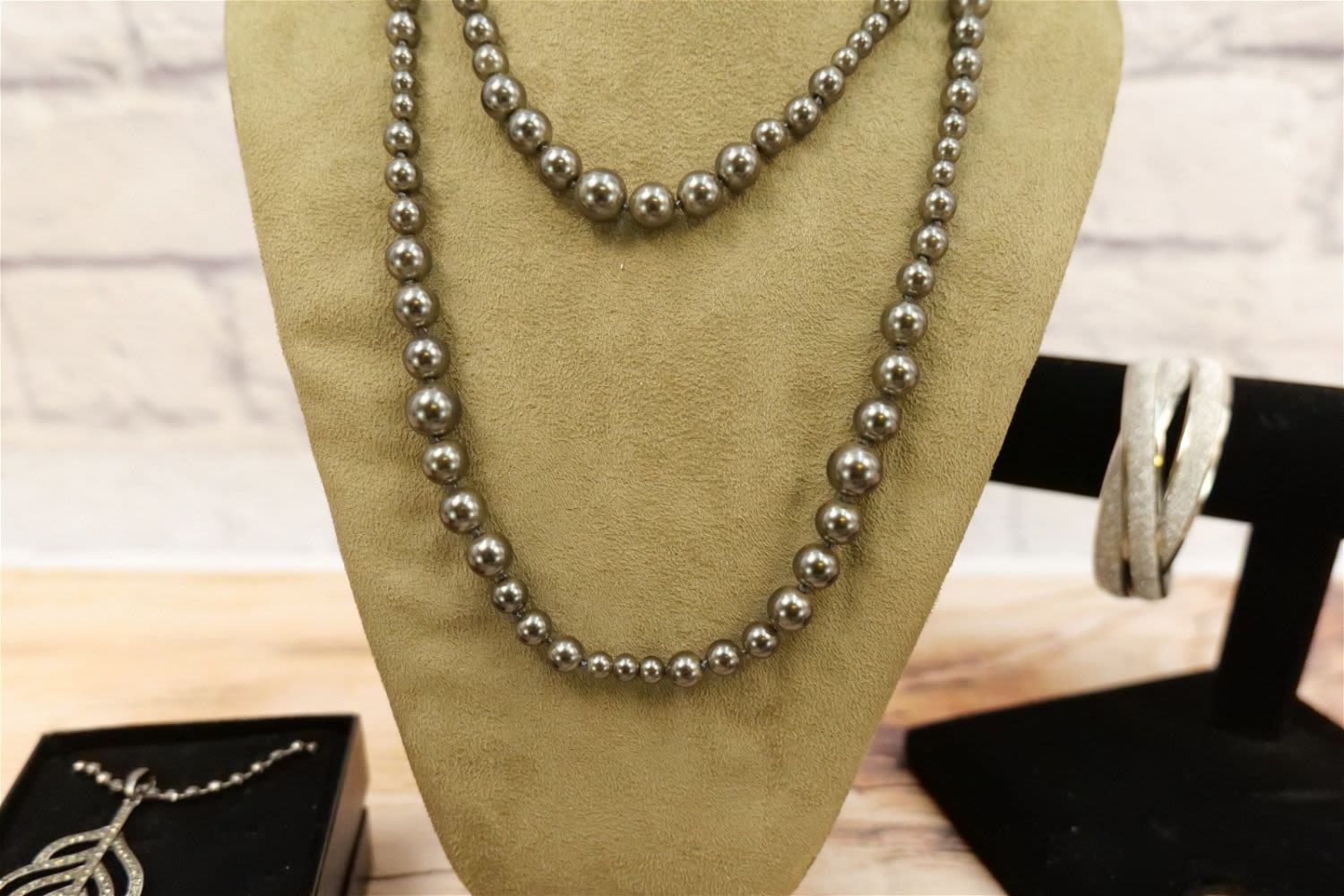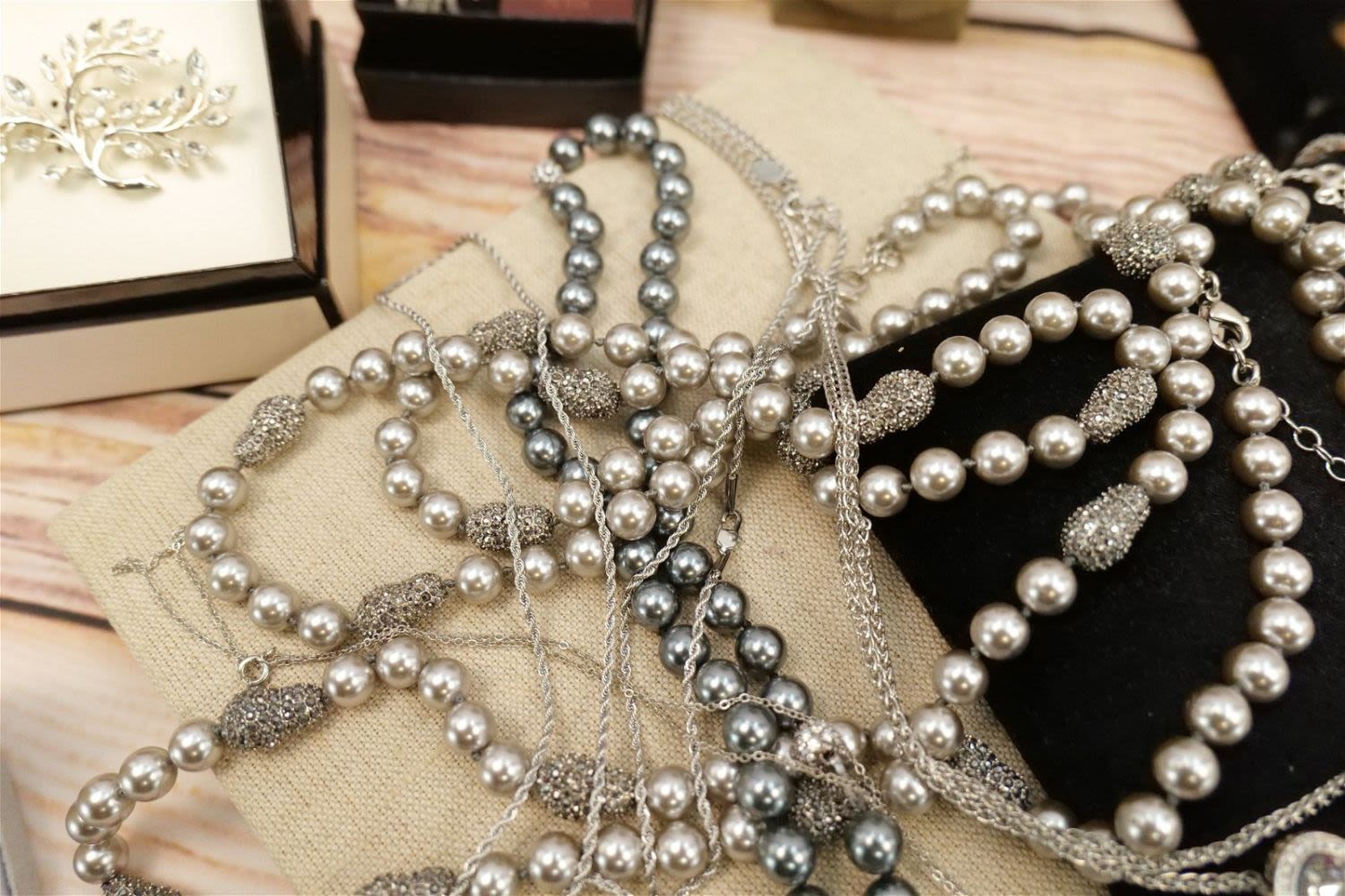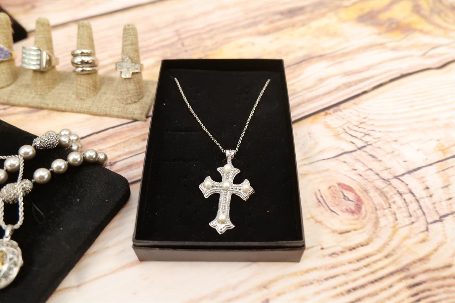 Lot of Silvertone Jewelry including Faux Pearls, Droozy Style bangles and Pendants, Oversized Crystal Cross, Rings, Dana Buchman Pin, Peacock Feather Pendant and More. All invoices must be paid within 24 hours of the sale. We offer multiple shipping options, please read the terms as they have changed. We also offer Pick-Ups Friday, Saturday, and Monday immediately following the sale. BY APPOINTMENT ONLY. PLEASE READ THE NEW TERMS!!!
