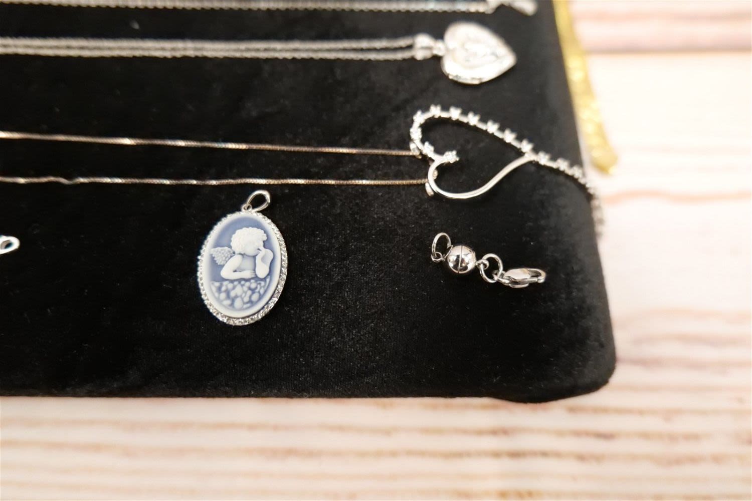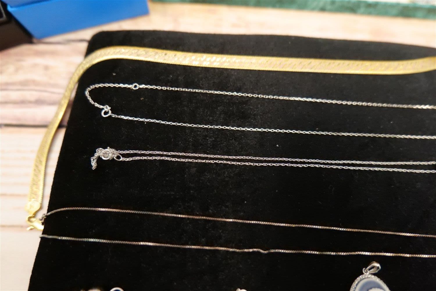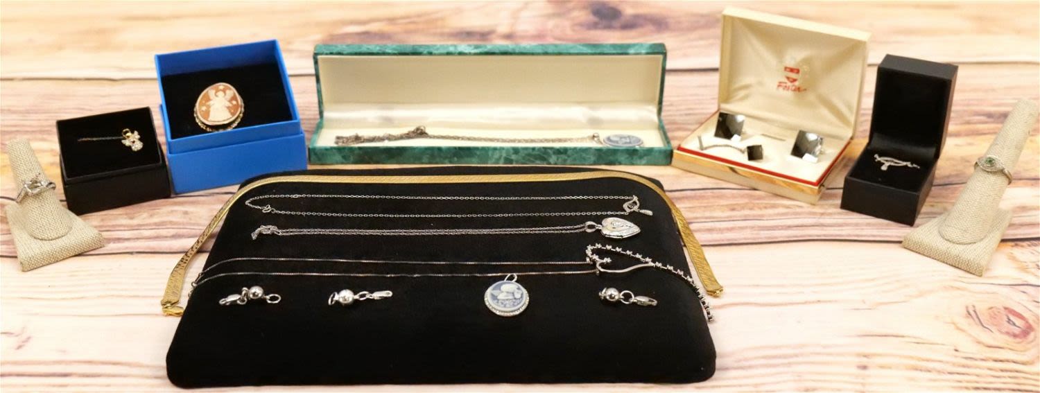 Lot of Sterling Jewelry including Magnetic Necklace Clasps, Angel Cameo, Pair of Men’s Cuff Links and Tie Bar, Evil Eye Pieces, Angel Pendants, Scrap Ring, and Herringbone Necklace. All invoices must be paid within 24 hours of the sale. We offer multiple shipping options, please read the terms as they have changed. We also offer Pick-Ups Friday, Saturday, and Monday immediately following the sale. BY APPOINTMENT ONLY. PLEASE READ THE NEW TERMS!!!