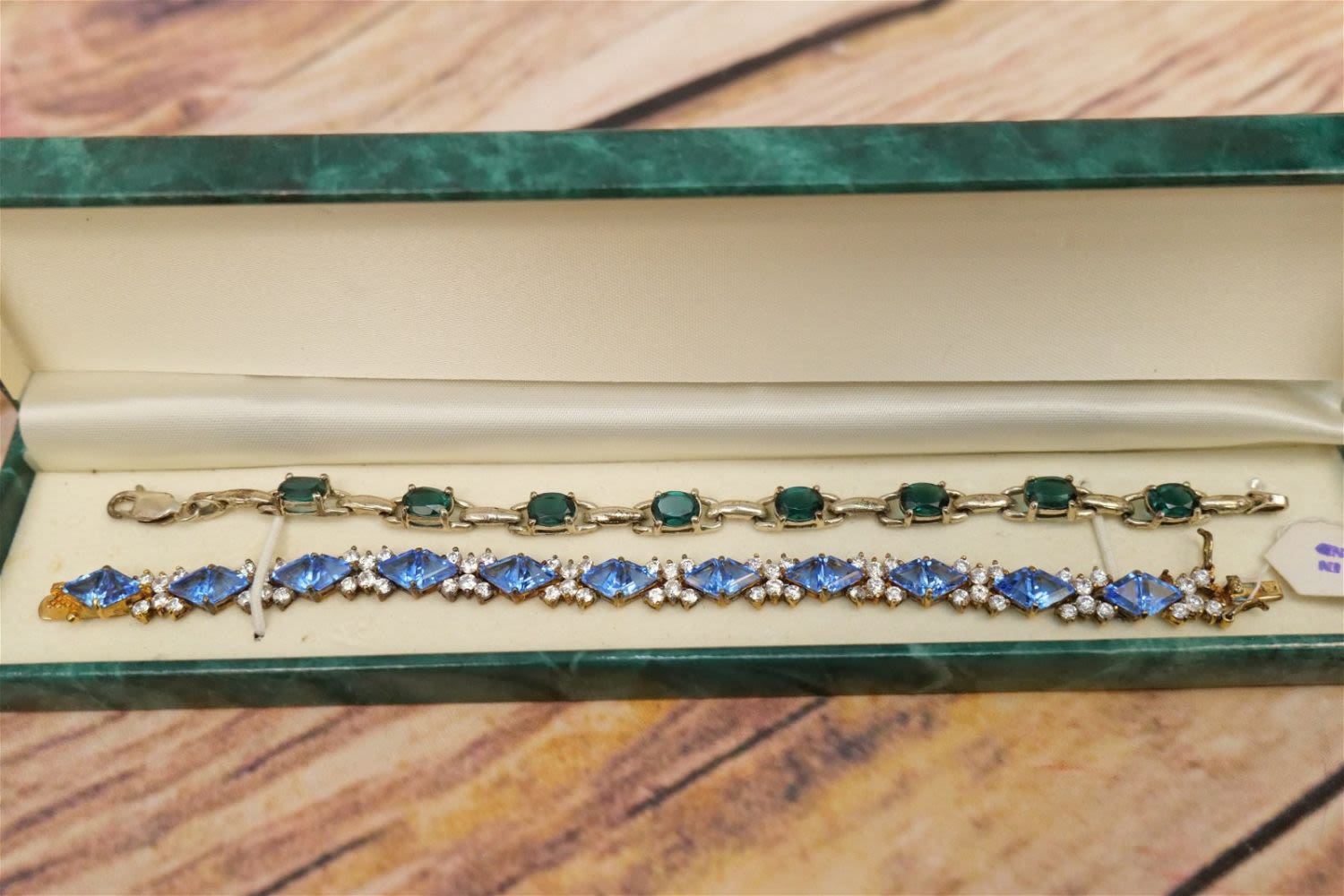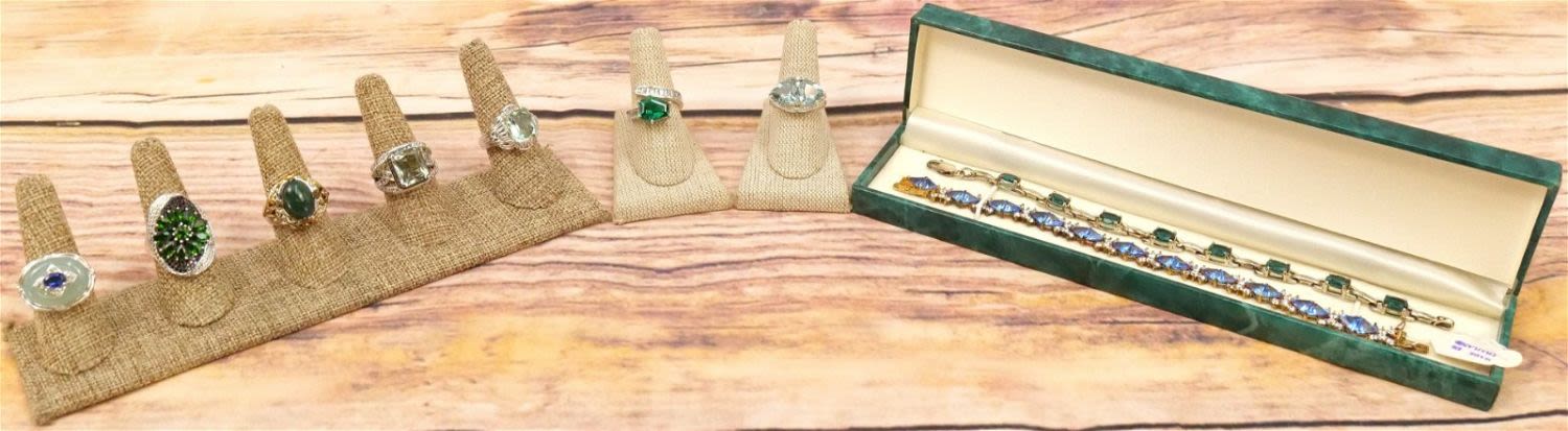 Lot of Sterling Silver Green and Blue Stone Jewelry including 2 Rhinestone Bracelets and 7 Rings. All invoices must be paid within 24 hours of the sale. We offer multiple shipping options, please read the terms as they have changed. We also offer Pick-Ups Friday, Saturday, and Monday immediately following the sale. BY APPOINTMENT ONLY. PLEASE READ THE NEW TERMS!!!