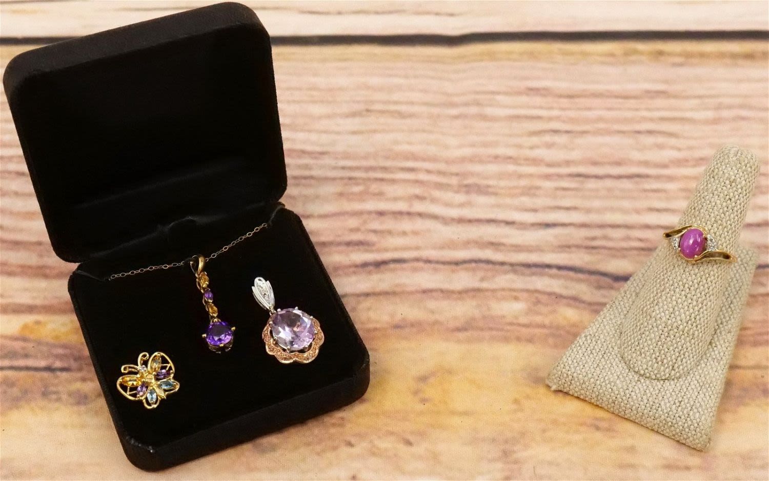 Lot of 10k Yellow and Rose Jewelry including 3 Gemstone Pendants (Butterfly, Amber/Purple, Amethyst) and Ladies Ring with what appears to be a cabochon star ruby. Ring Sizes 7. All invoices must be paid within 24 hours of the sale. We offer multiple shipping options, please read the terms as they have changed. We also offer Pick-Ups Friday, Saturday, and Monday immediately following the sale. BY APPOINTMENT ONLY. PLEASE READ THE NEW TERMS!!!