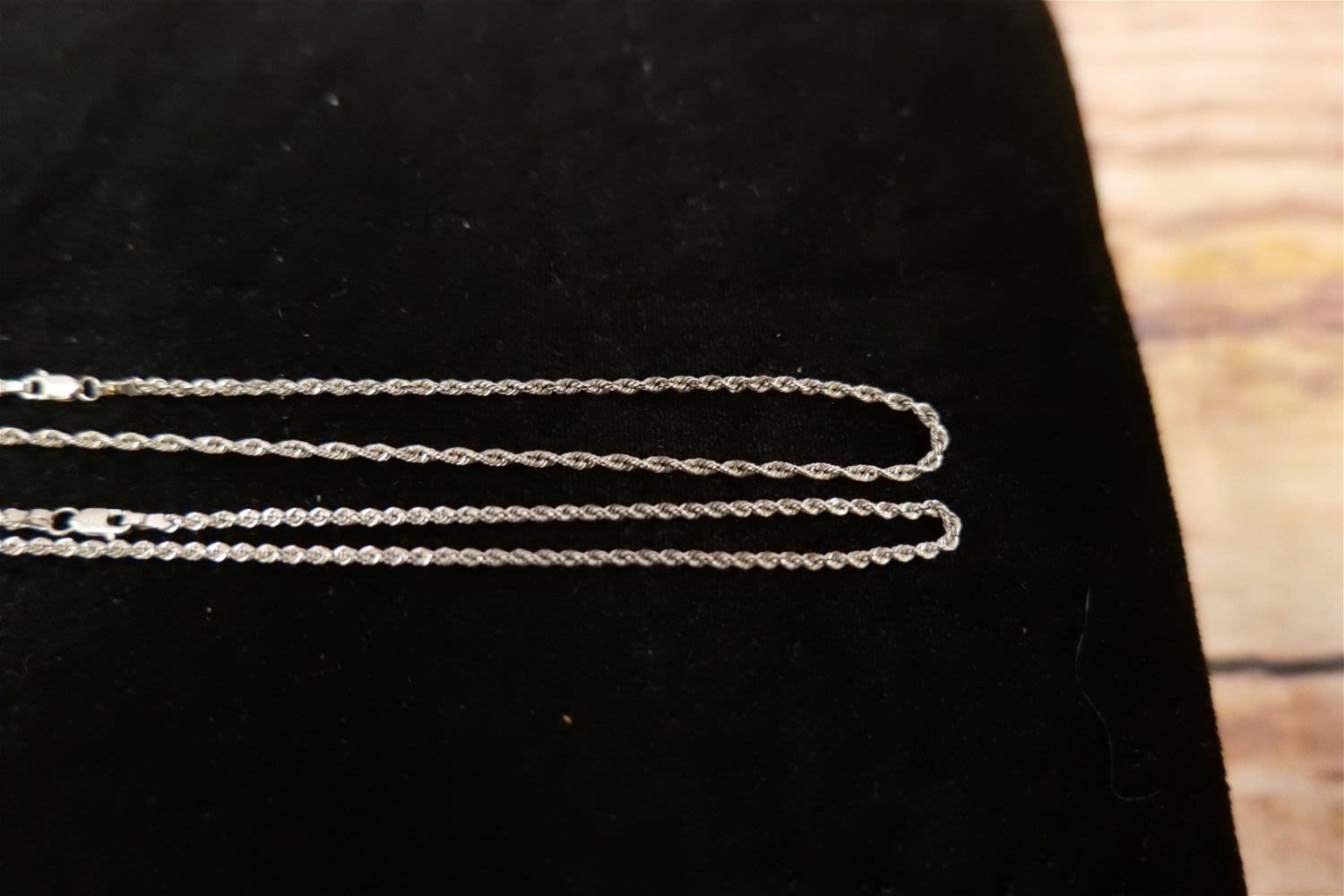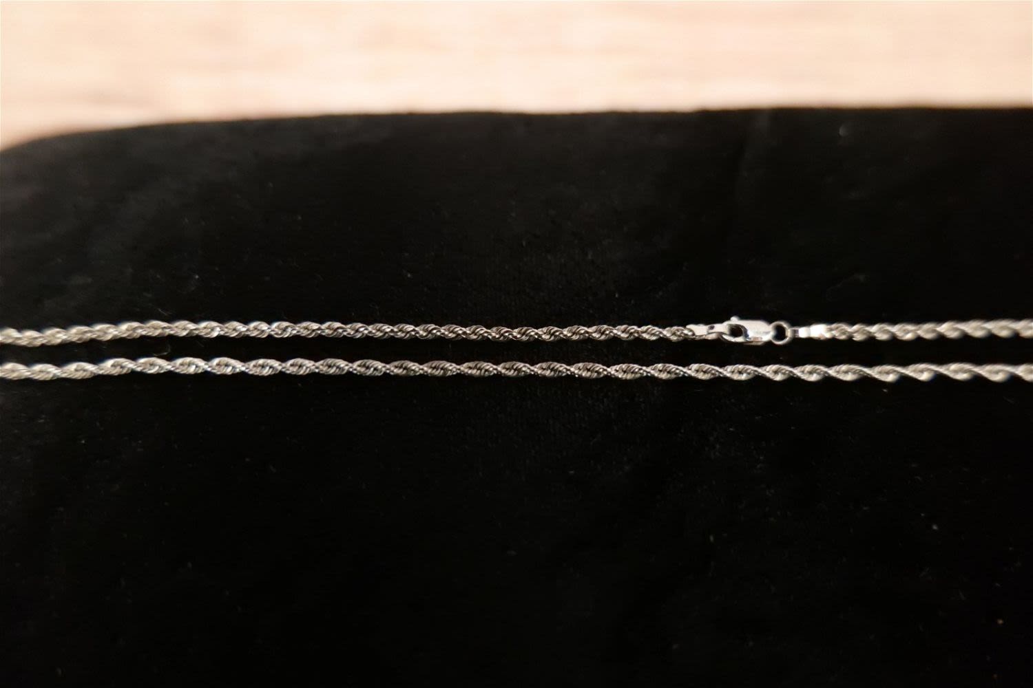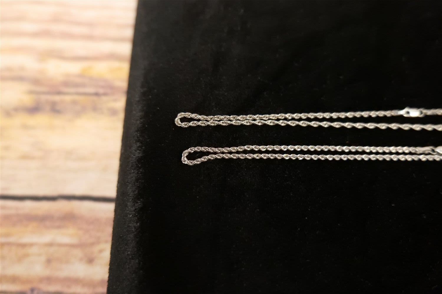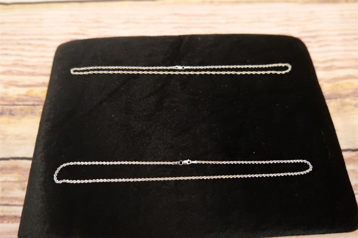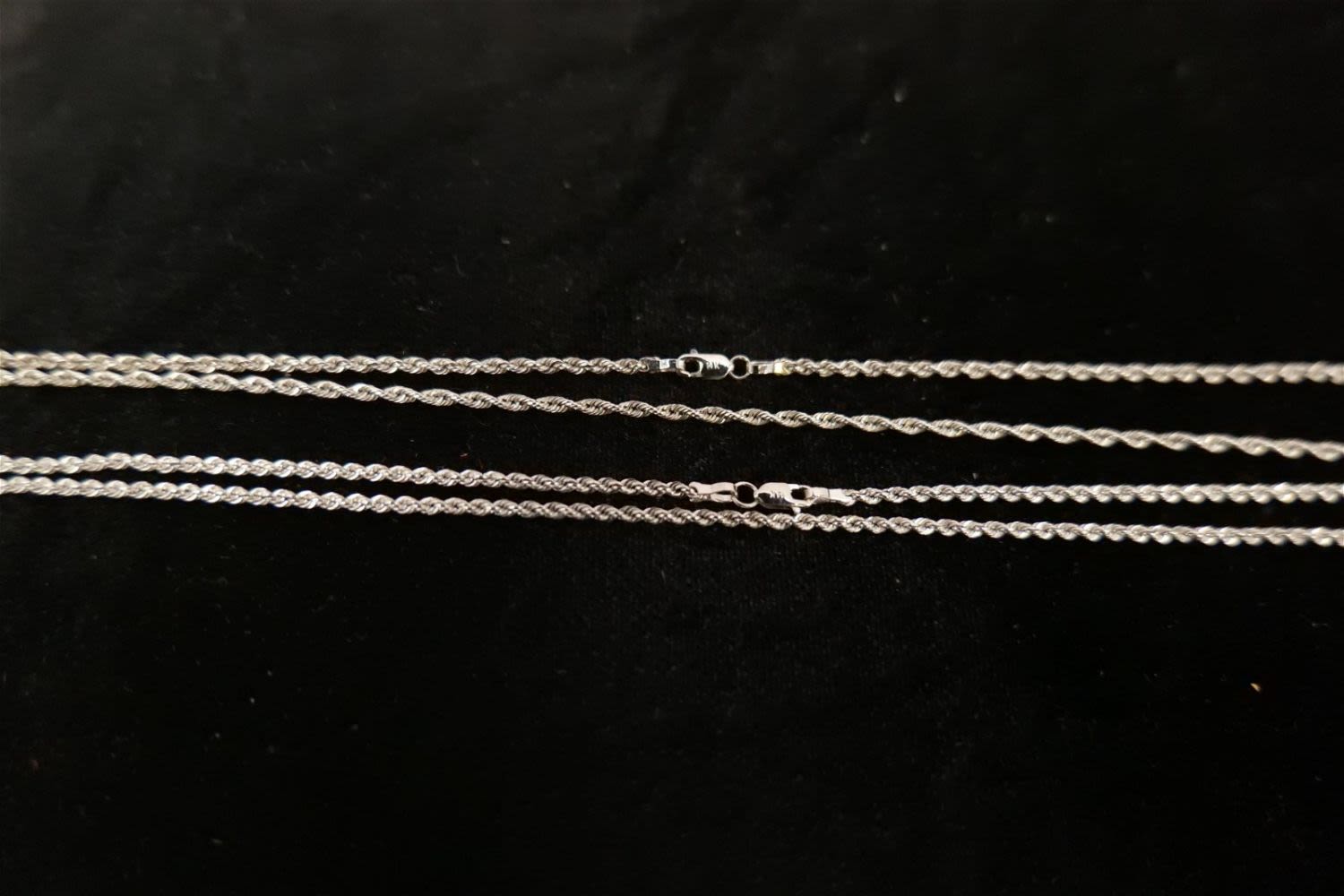 14k White Gold Jewelry Lot including (2) 14k Rope Chain and Pearl and Diamond Chip Pendant. All marked. Chains measure 14"-15". Pendant measures 1.75". All invoices must be paid within 24 hours of the sale. We offer multiple shipping options, please read the terms as they have changed. We also offer Pick-Ups Friday, Saturday, and Monday immediately following the sale. BY APPOINTMENT ONLY. PLEASE READ THE NEW TERMS!!!