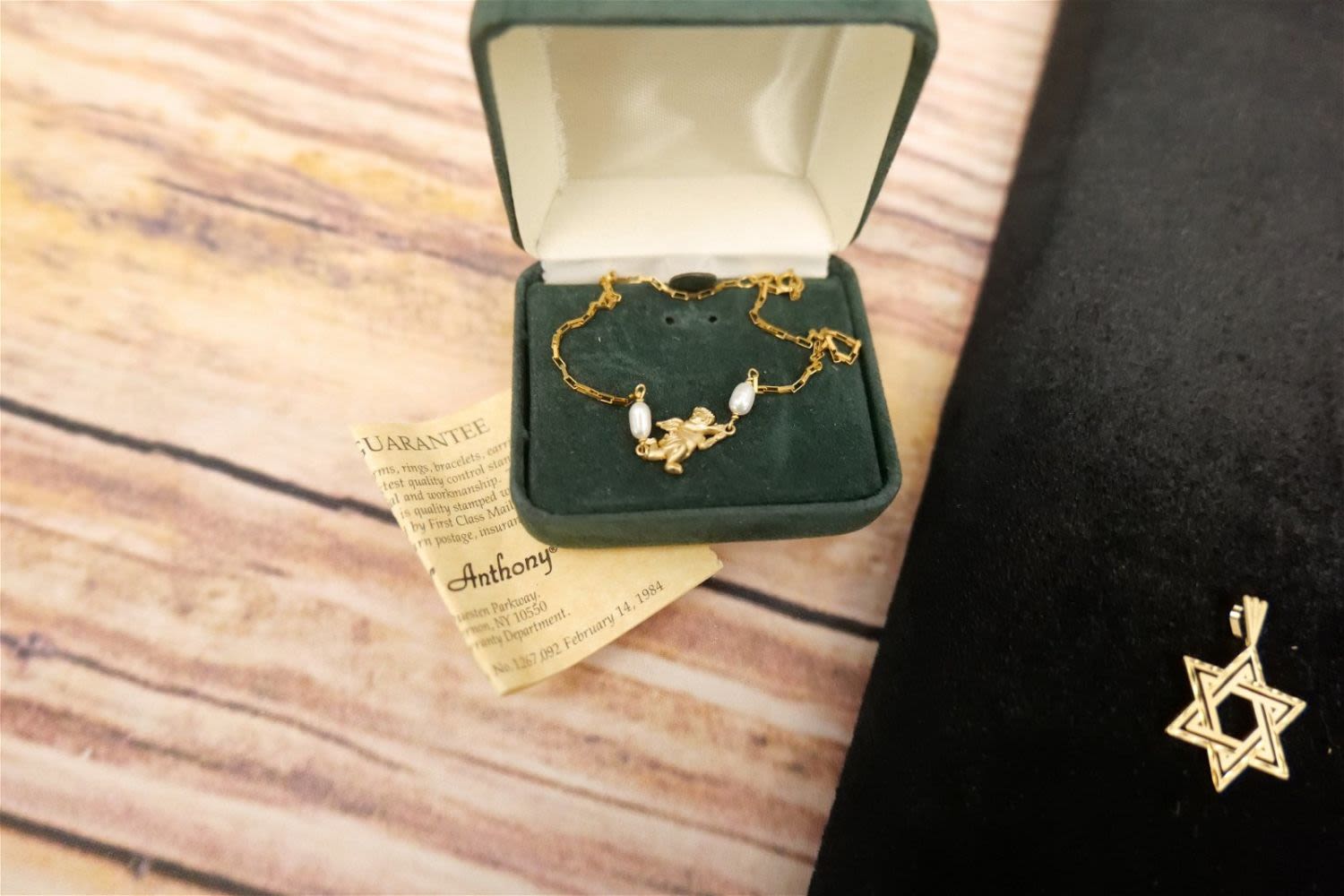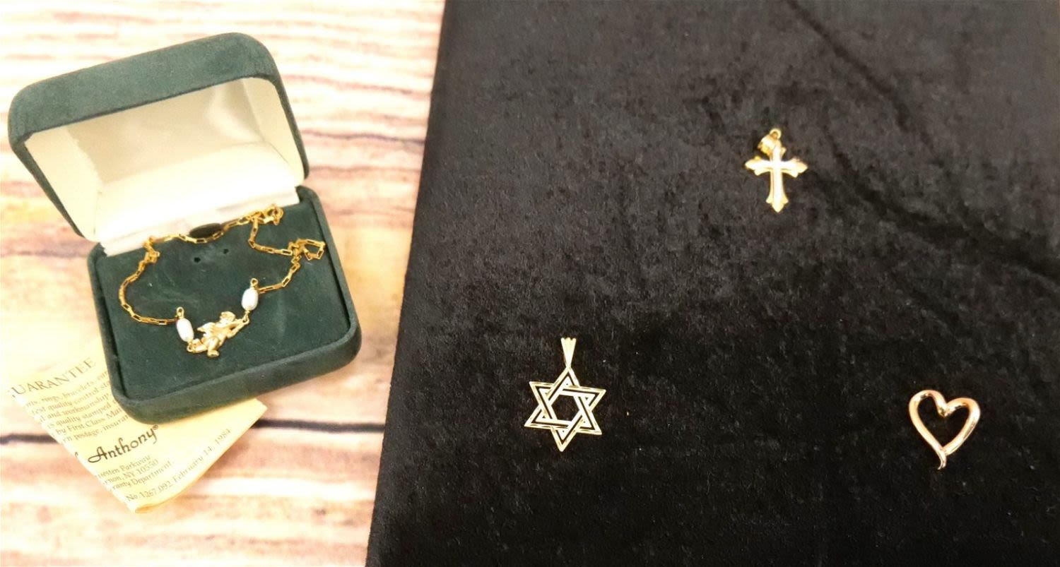 Lot of 14k Yellow Gold Jewelry including Rose Gold Heart Pendant, Cross Pendant, Star of David, and Paper Chip Box Link Angel Pearl and Gold Anklet. All marked except for the Star of David which tested. Anklet measures 9". Charms measures 1". Weighs approx. 5.1 grams. All invoices must be paid within 24 hours of the sale. We offer multiple shipping options, please read the terms as they have changed. We also offer Pick-Ups Friday, Saturday, and Monday immediately following the sale. BY APPOINTMENT ONLY. PLEASE READ THE NEW TERMS!!!