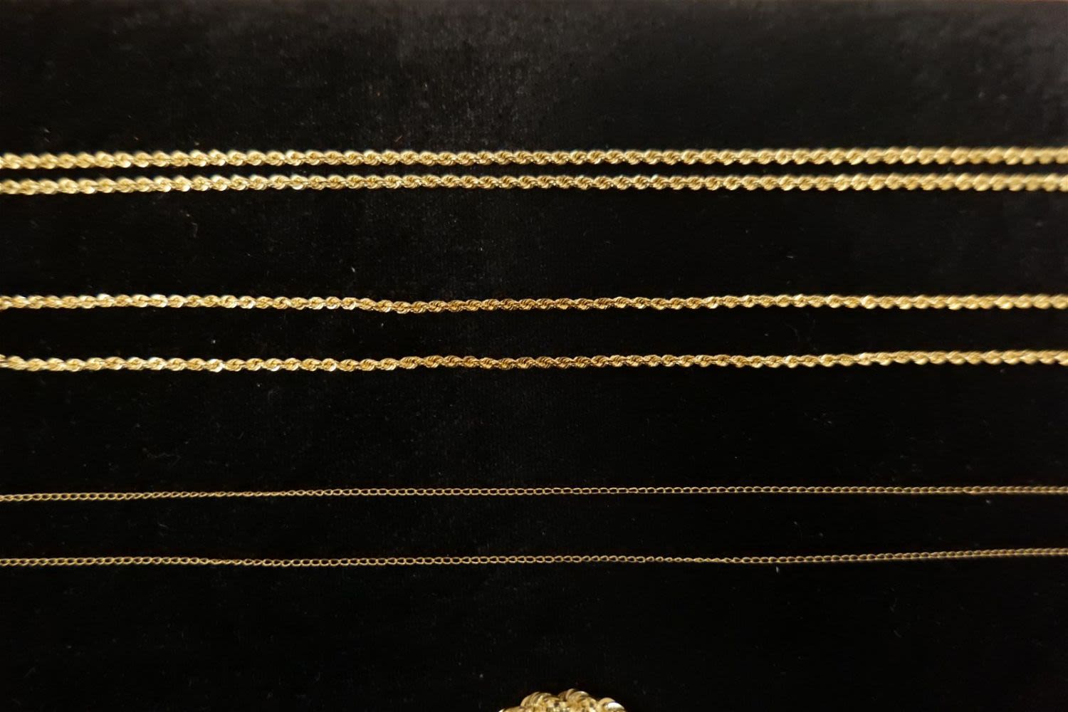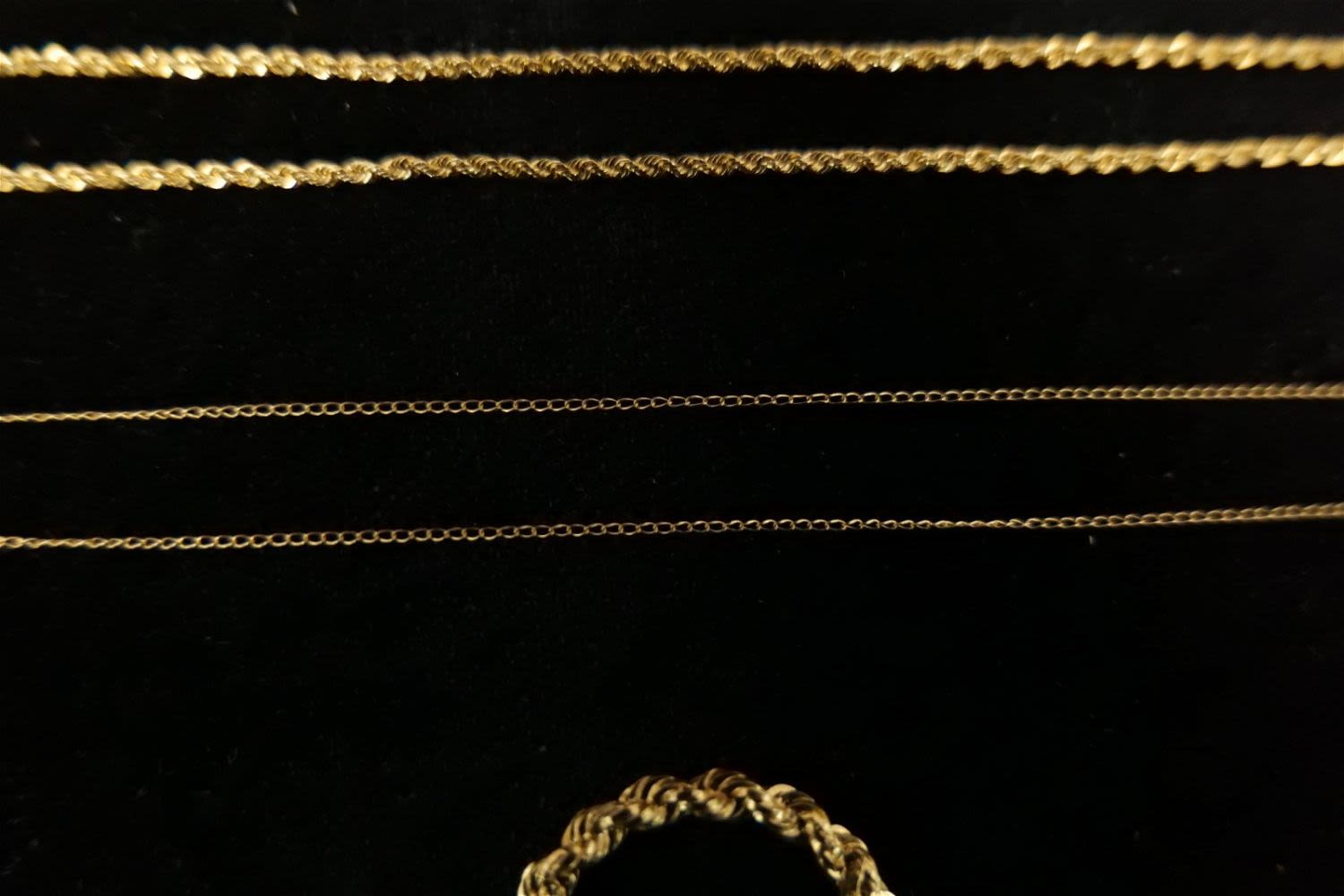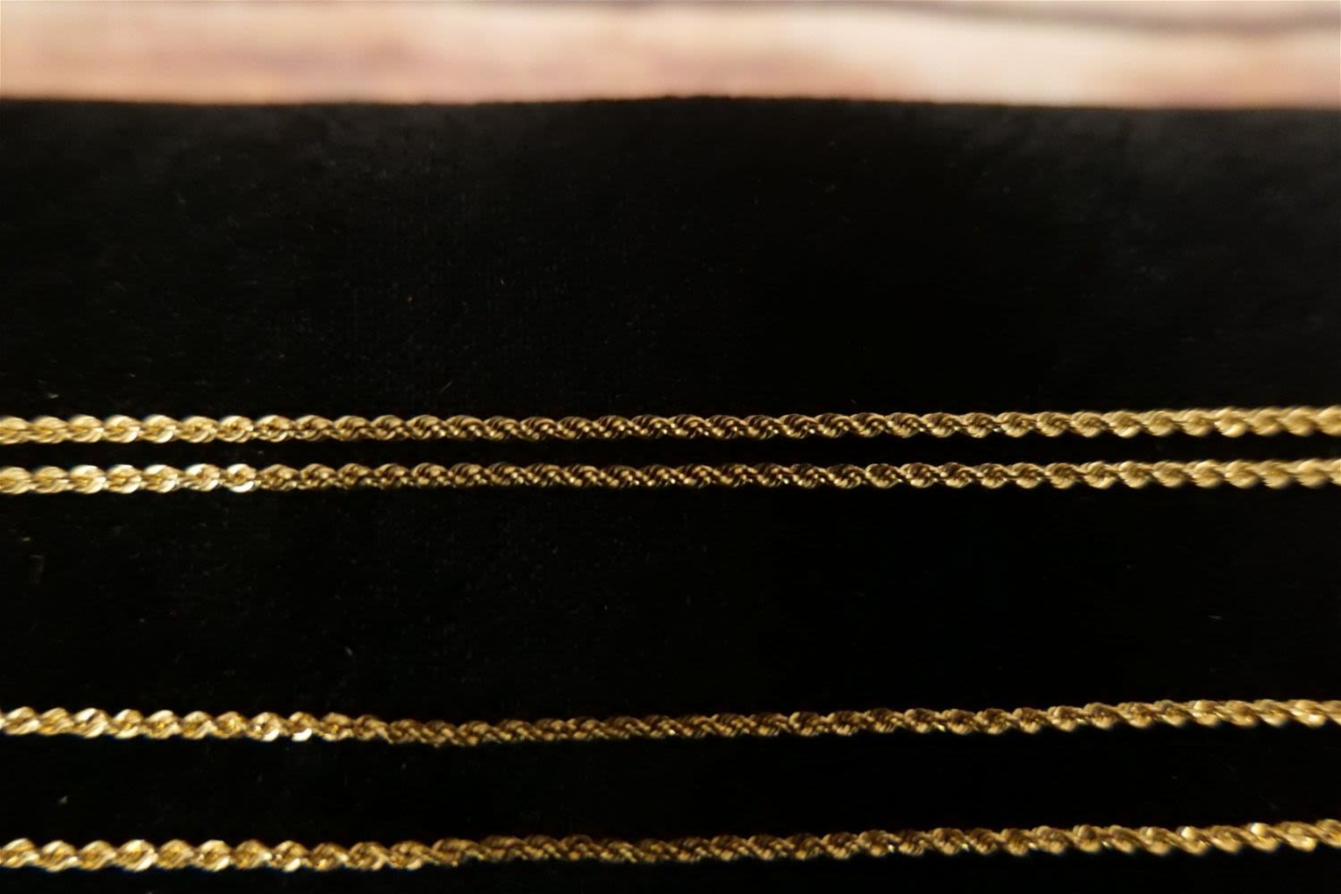 Lot of 14k Jewelry including (2) Rope Chains, Dainty Link Chain, and Scarf Ring. Ring has been tested. Necklaces are marked. Necklaces measure 14"-18". Scarf Ring is 1.25". Weighs approx. 5 grams. All invoices must be paid within 24 hours of the sale. We offer multiple shipping options, please read the terms as they have changed. We also offer Pick-Ups Friday, Saturday, and Monday immediately following the sale. BY APPOINTMENT ONLY. PLEASE READ THE NEW TERMS!!!