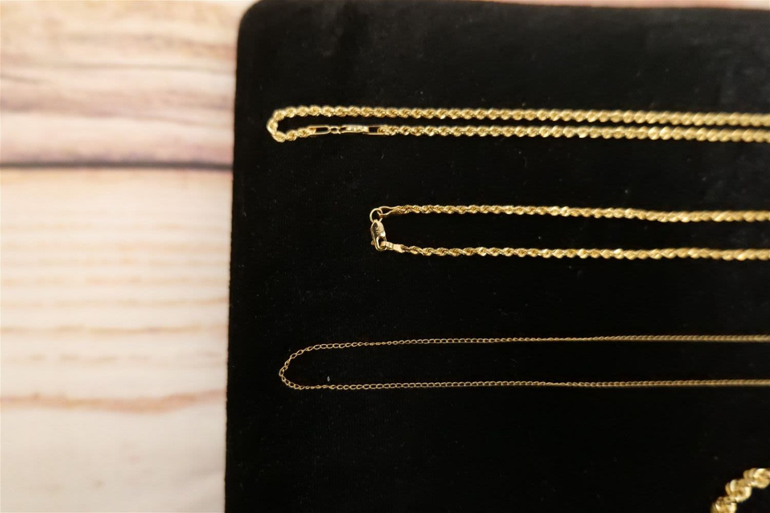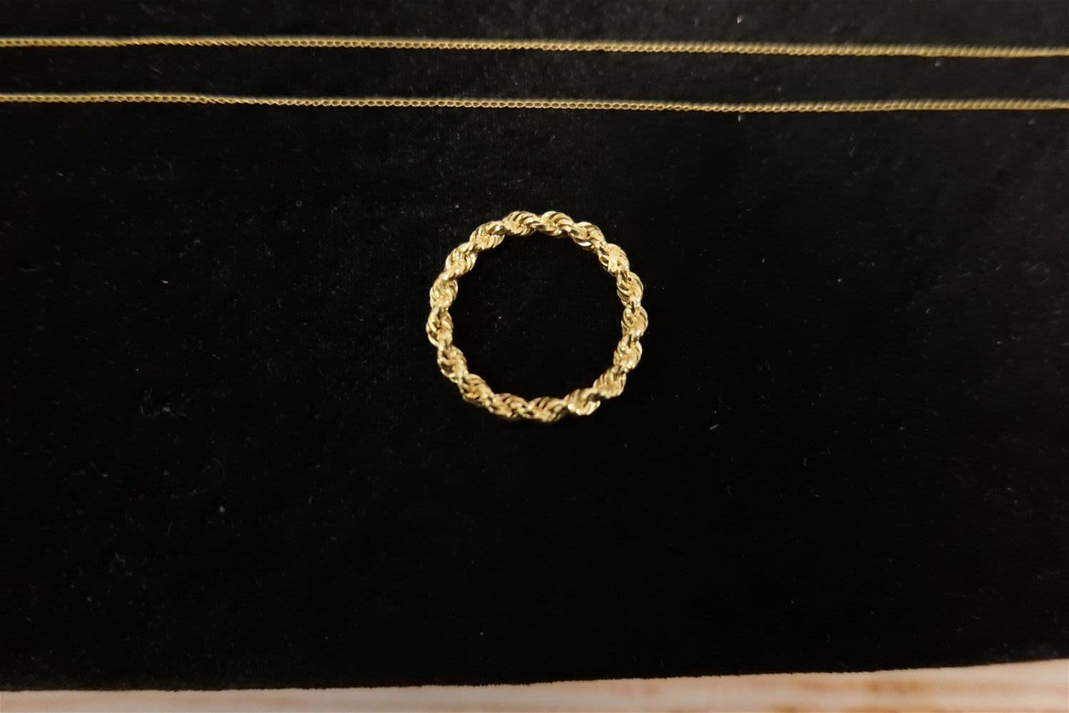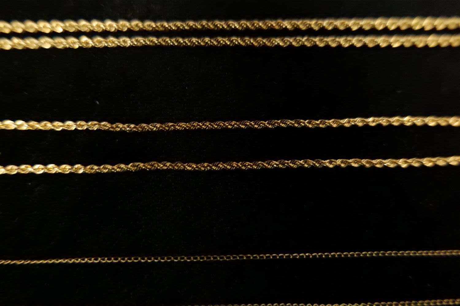 Lot of 14k Jewelry including (2) Rope Chains, Dainty Link Chain, and Scarf Ring. Ring has been tested. Necklaces are marked. Necklaces measure 14"-18". Scarf Ring is 1.25". Weighs approx. 5 grams. All invoices must be paid within 24 hours of the sale. We offer multiple shipping options, please read the terms as they have changed. We also offer Pick-Ups Friday, Saturday, and Monday immediately following the sale. BY APPOINTMENT ONLY. PLEASE READ THE NEW TERMS!!!
