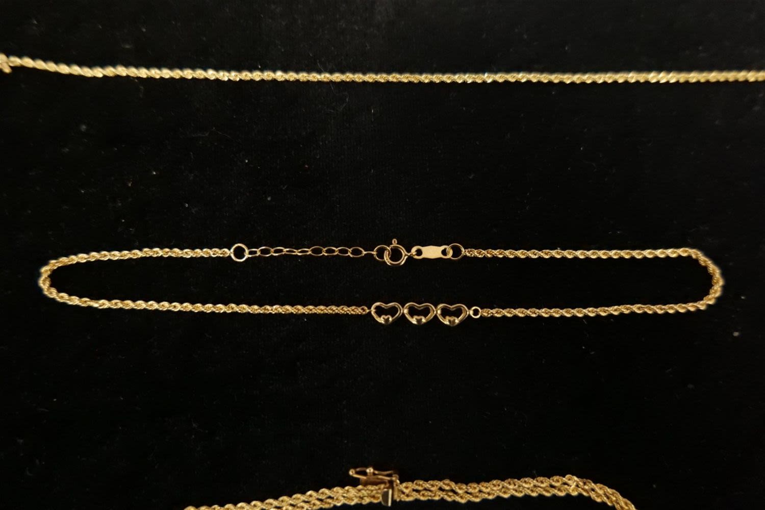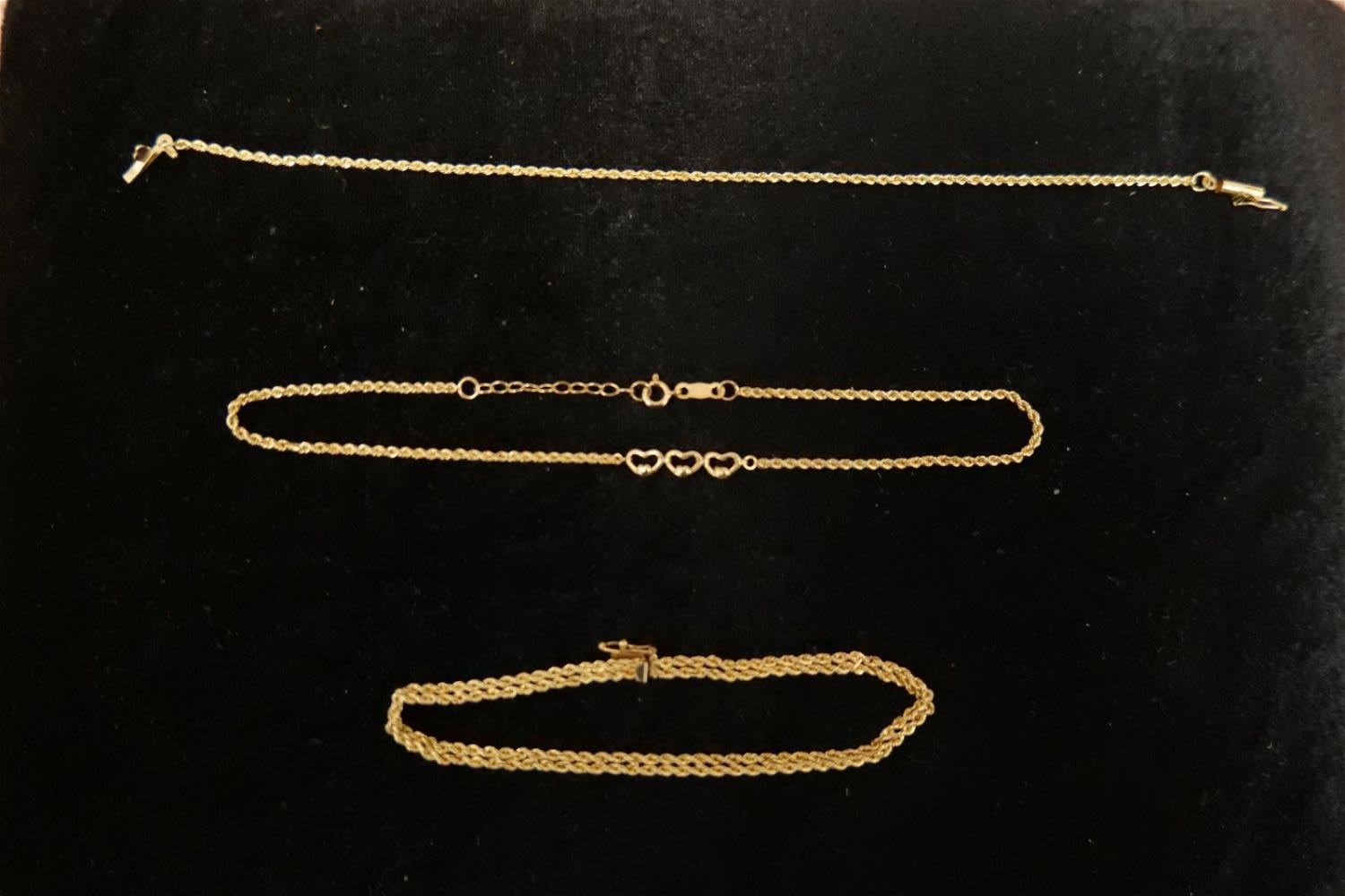 Lot of 3 14k Yellow Gold Rope Chain Bracelets/Anklets. All marked. Measures 7" – 10". Weighs approx. 7 grams. All invoices must be paid within 24 hours of the sale. We offer multiple shipping options, please read the terms as they have changed. We also offer Pick-Ups Friday, Saturday, and Monday immediately following the sale. BY APPOINTMENT ONLY. PLEASE READ THE NEW TERMS!!!