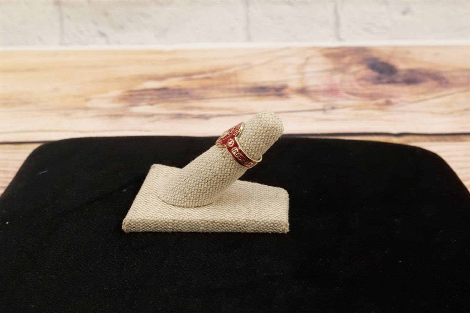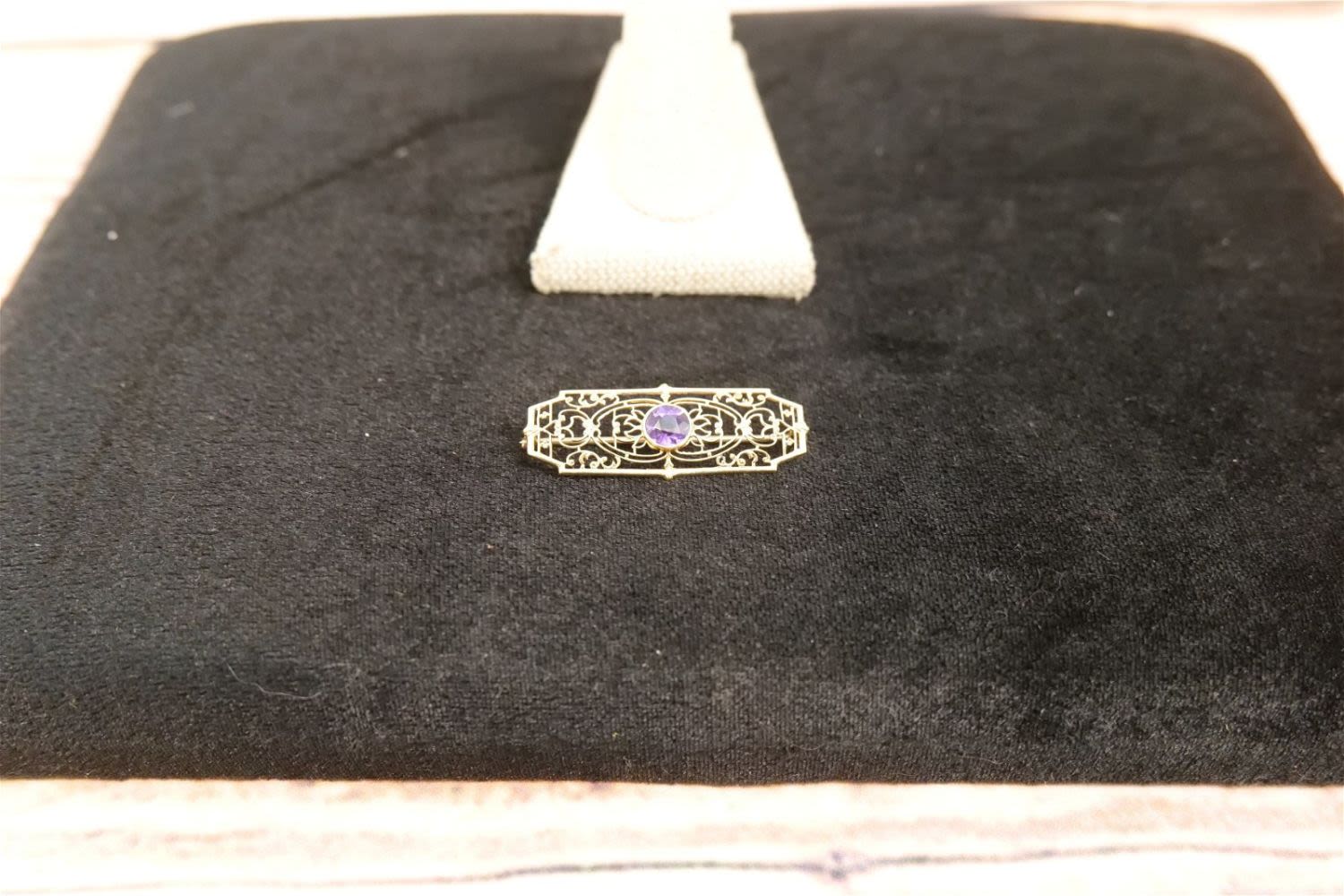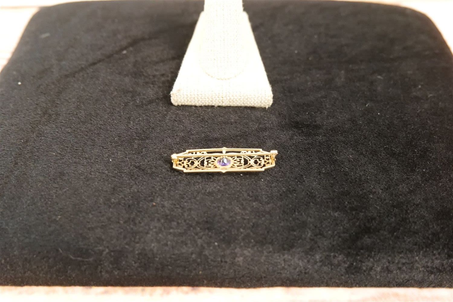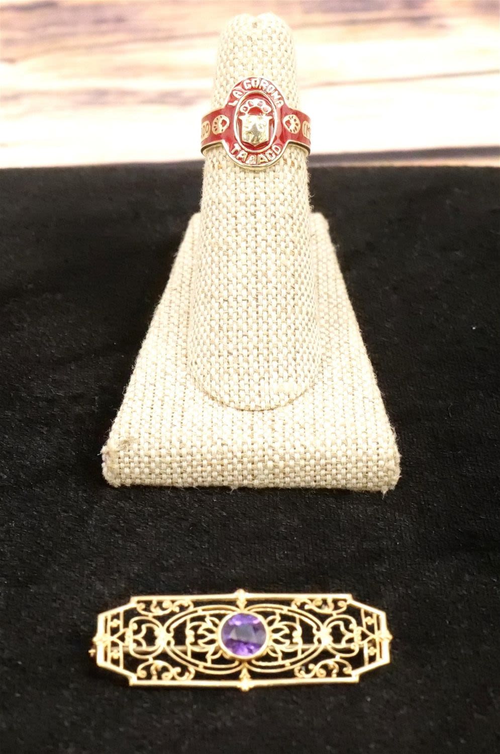 Lot of 10kt Jewelry including 10kt and Enamel Cigar Wrapper Ring and 10kt and Amethyst Bar Pin. Ring is Size 5. Bar Pin measures 1.5". Weighs Approx. 8.4 grams with the stone. All invoices must be paid within 24 hours of the sale. We offer multiple shipping options, please read the terms as they have changed. We also offer Pick-Ups Friday, Saturday, and Monday immediately following the sale. BY APPOINTMENT ONLY. PLEASE READ THE NEW TERMS!!!
