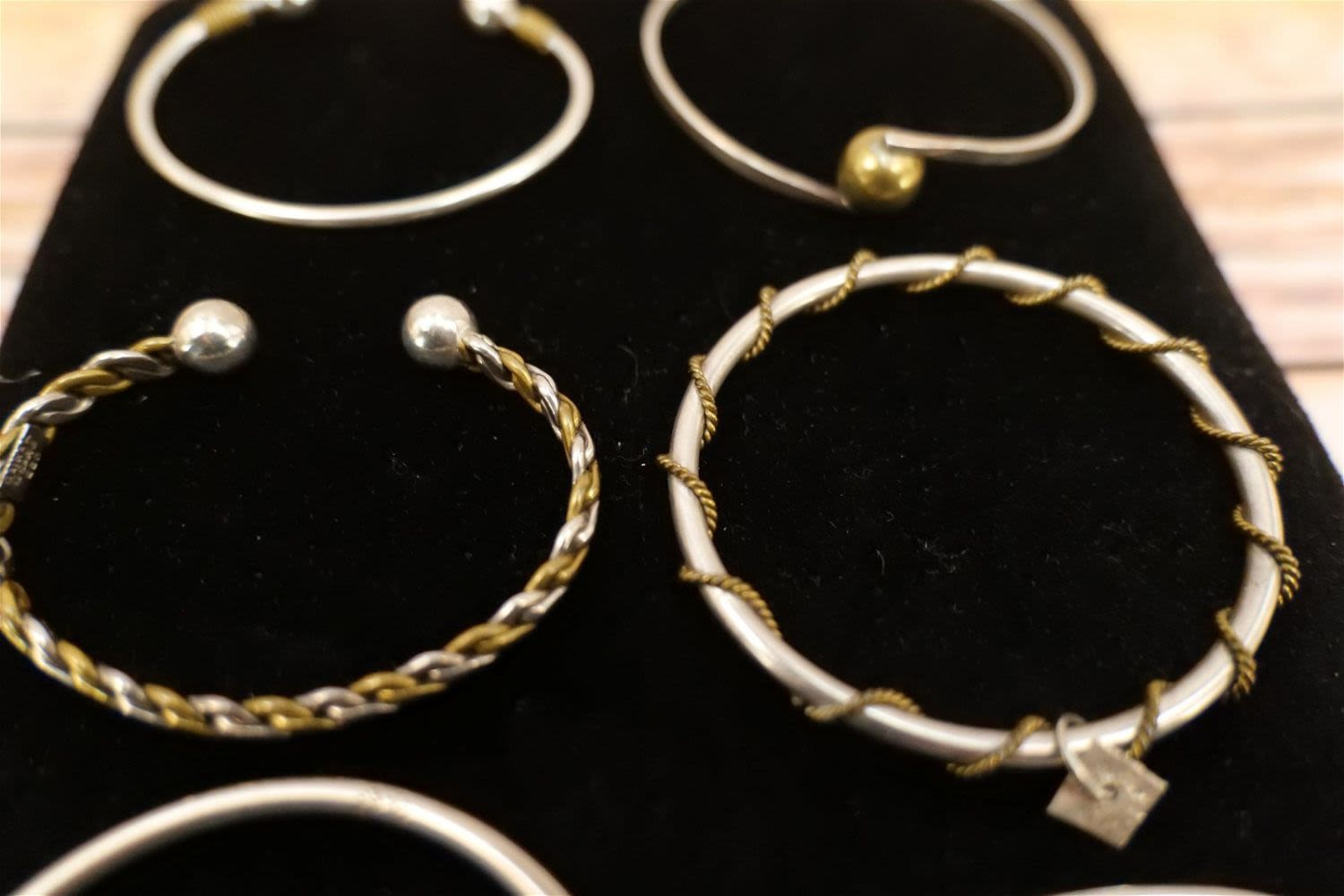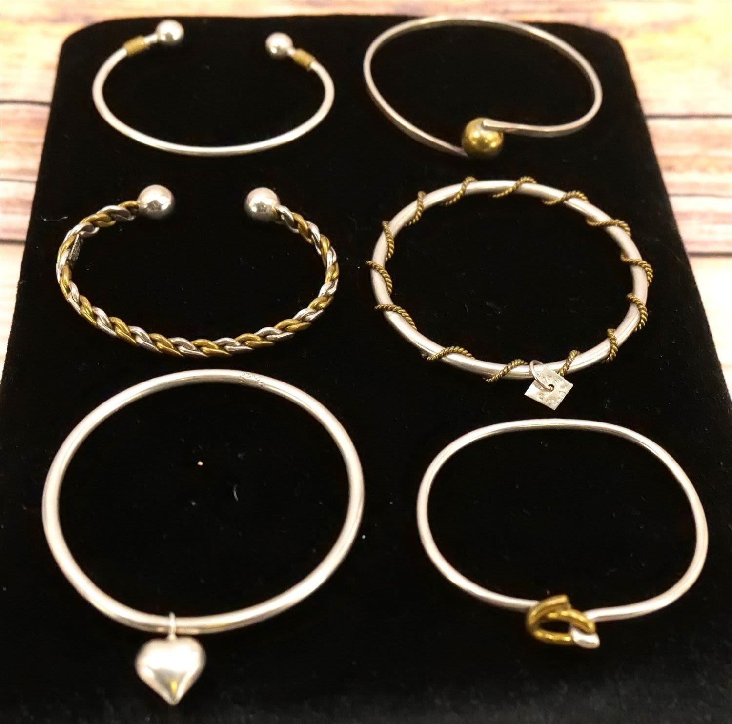Lot of Sterling Silver bangle and Cuff Bracelets. Most signed Mexico with Brass Tone Accents. All invoices must be paid within 24 hours of the sale. We offer multiple shipping options, please read the terms as they have changed. We also offer Pick-Ups Friday, Saturday, and Monday immediately following the sale. BY APPOINTMENT ONLY. PLEASE READ THE NEW TERMS!!!