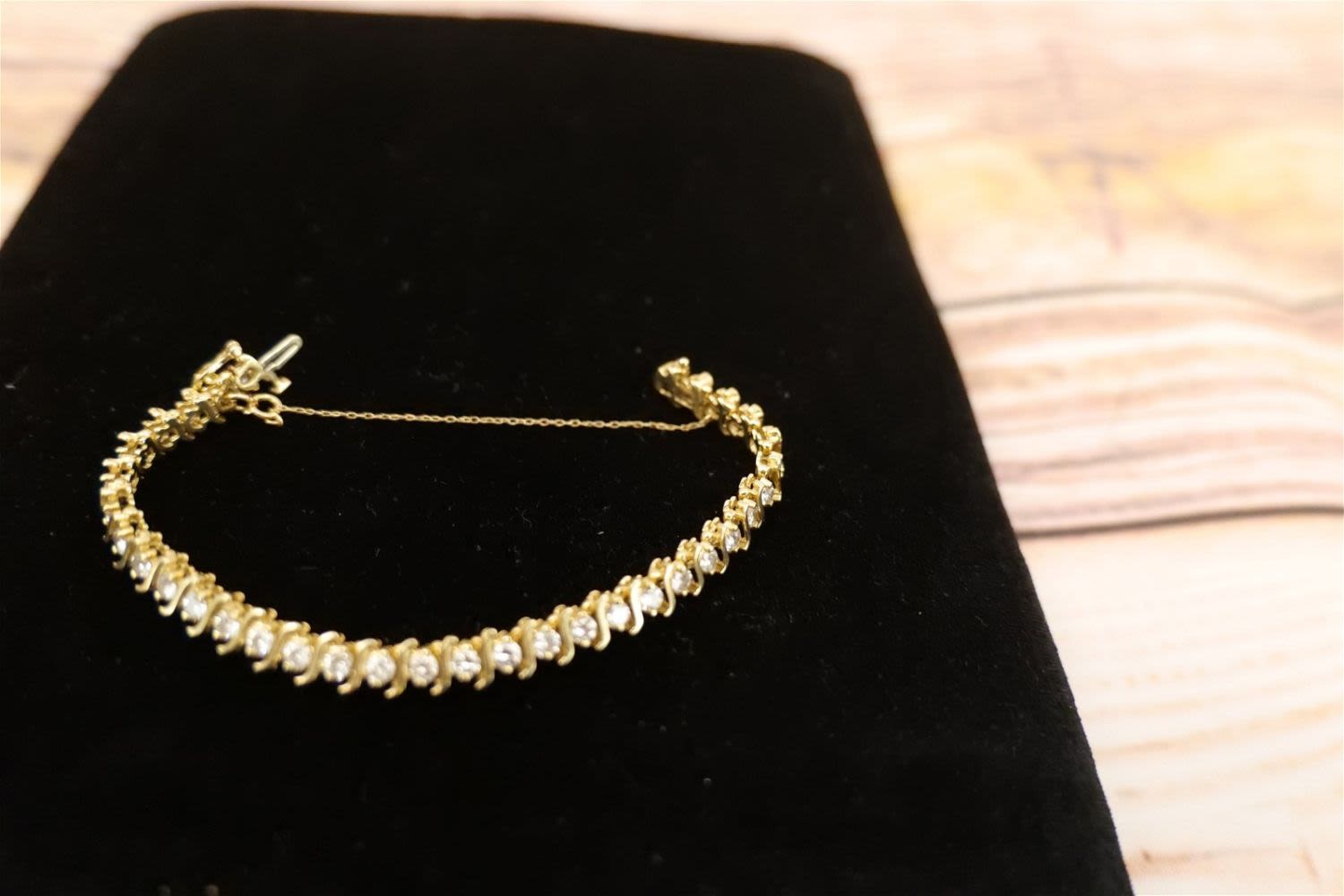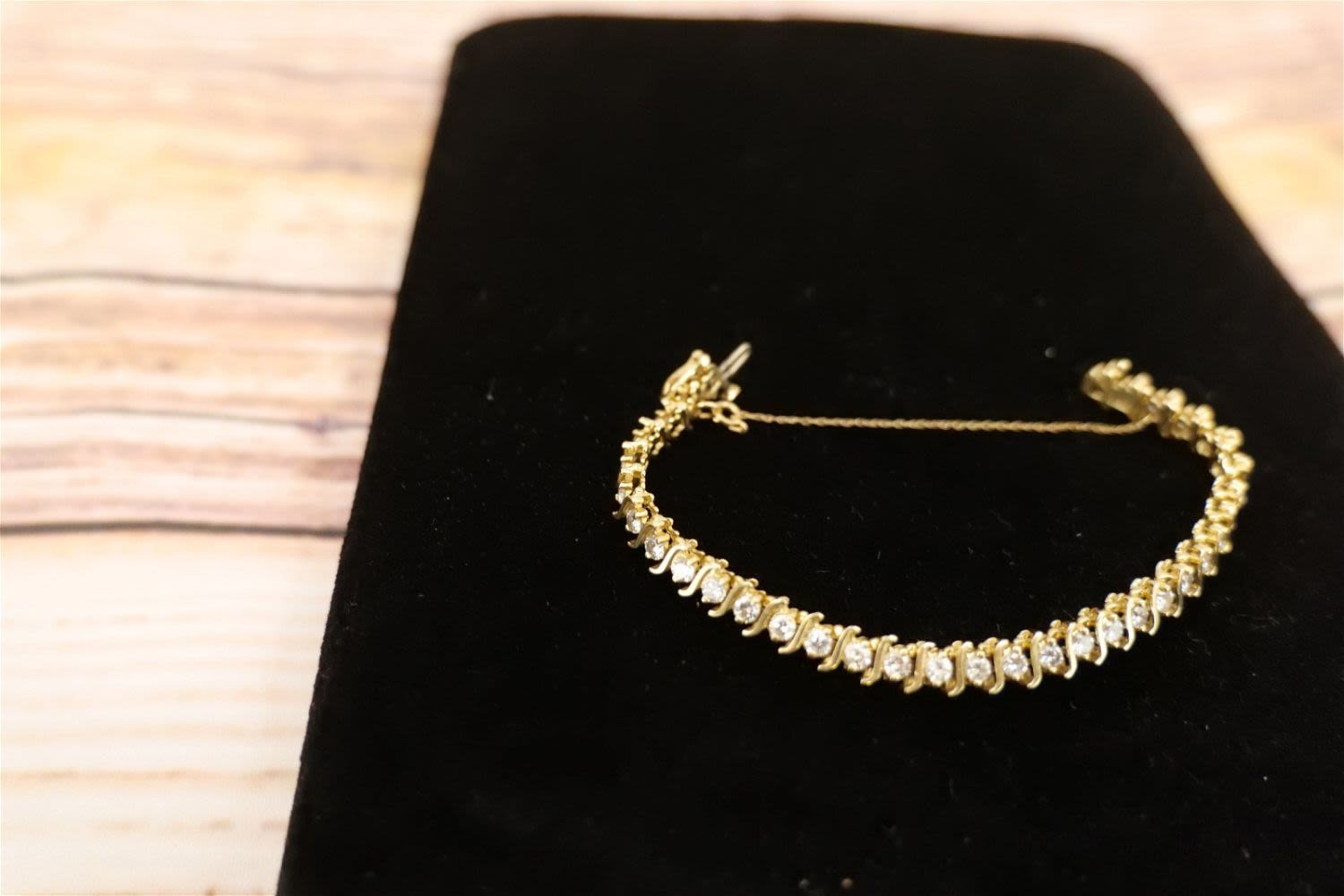 14k and Diamond Tennis Style Bracelet. Has 34 Round Cut Diamonds along the yellow gold bracelet. Measures approx. 7". Has safety clasp. All invoices must be paid within 24 hours of the sale. We offer multiple shipping options, please read the terms as they have changed. We also offer Pick-Ups Friday, Saturday, and Monday immediately following the sale. BY APPOINTMENT ONLY. PLEASE READ THE NEW TERMS!!!