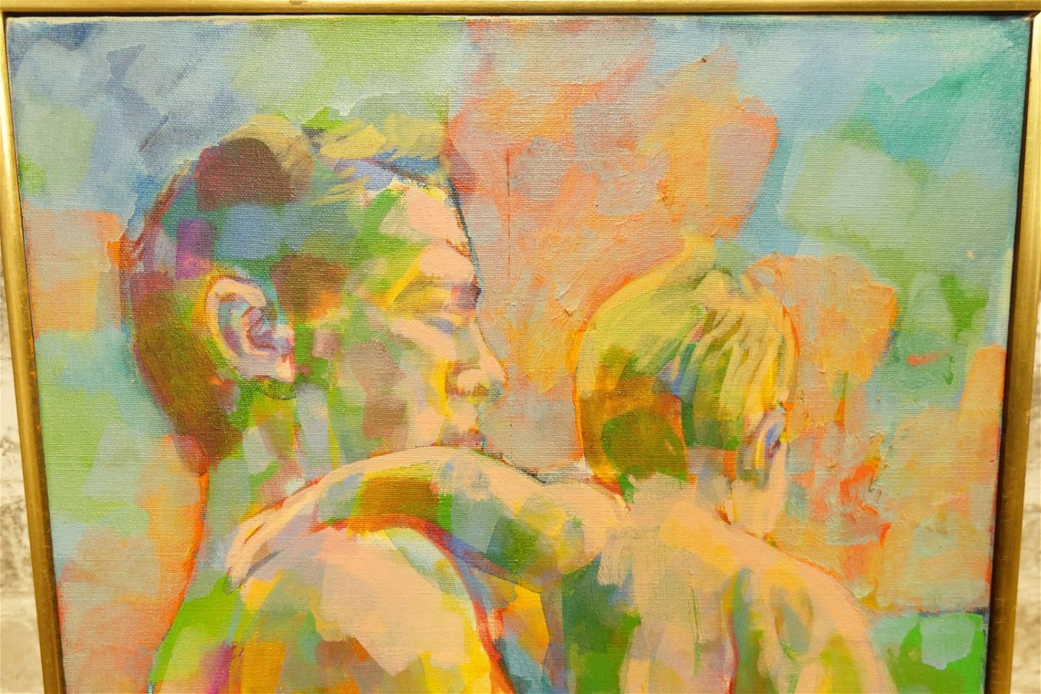 Oil on Canvas by Don Bloom (1932-2016). New Jersey Artist. Entitled "On The Beach". Depicting Father Holding Child. Framed. Measures 25" tall x 16.25" wide. Born in Roxbury, Massachusetts, Bloom received a BFA in 1953 from the Massachusetts College of Art, attended Art Students League of New York on tuition scholarships from 1953-57 and in 1957 attended Instituto Allende, Mexico on full scholarship where he received his MFA. His awards include a 1960 Guggenheim Fellowship and two Huntington Hartford Foundation Residence Fellowships, as well as numerous cash prizes in national, regional, and state exhibits. He has received two national awards in editorial cartooning, a national second place award for "first day covers", and an award from Kean College, Jersey City State College. All invoices must be paid within 24 hours of the sale. We offer multiple shipping options, please read the terms as they have changed. We also offer Pick-Ups Thursday, Friday, Saturday, and Monday immediately following the sale. BY APPOINTMENT ONLY. PLEASE READ THE NEW TERMS!!!