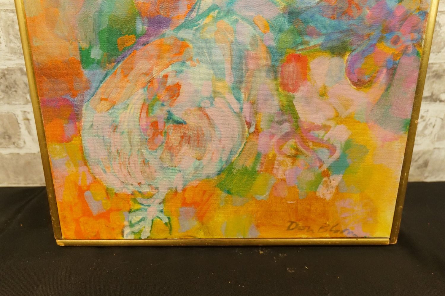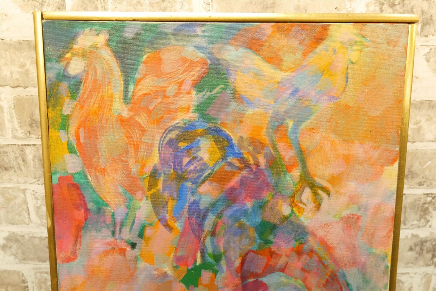 Abstract Oil on Canvas by Don Bloom (1932-2016). Depicting Roosters. Signed Lower Right. Framed. Measures 24.75" tall x 16.5" wide. Born in Roxbury, Massachusetts, Bloom received a BFA in 1953 from the Massachusetts College of Art, attended Art Students League of New York on tuition scholarships from 1953-57 and in 1957 attended Instituto Allende, Mexico on full scholarship where he received his MFA. His awards include a 1960 Guggenheim Fellowship and two Huntington Hartford Foundation Residence Fellowships, as well as numerous cash prizes in national, regional, and state exhibits. He has received two national awards in editorial cartooning, a national second place award for "first day covers", and an award from Kean College, Jersey City State College. All invoices must be paid within 24 hours of the sale. We offer multiple shipping options, please read the terms as they have changed. We also offer Pick-Ups Thursday, Friday, Saturday, and Monday immediately following the sale. BY APPOINTMENT ONLY. PLEASE READ THE NEW TERMS!!!