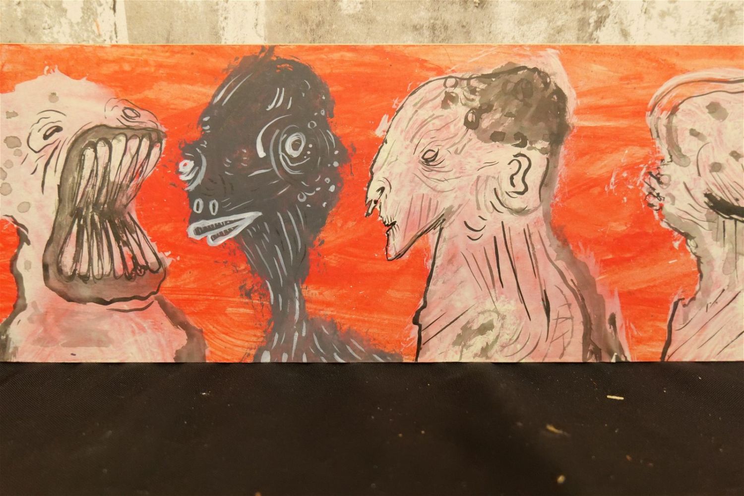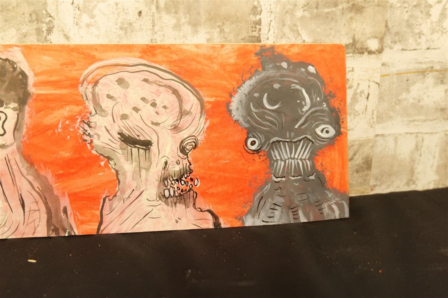 Original Mixed Media Cartoon Monsters by Gus Fink. Signed on left. Measures 6" tall x 29.5" wide. Gus was born and raised in the mountains of Pennsylvania where he started his art career in 1999 by painting on an old dictionary. He pulled from a dumpster. By turning nothing into something Gus adapted his own unique style that mixes nightmares, emotions and creative ideas. He has since turned his artwork into multiple toy lines, fashion, video games, jewelry and more. In 2016 Gus started writing and directing short films. The starting point for his work is to pull new ideas out from the universe and place them onto the canvas of choice. His goal is to innovate all aspects of the arts and entertainment industries so that there can be a global shift of not accepting mediocrity. All invoices must be paid within 24 hours of the sale. We offer multiple shipping options, please read the terms as they have changed. We also offer Pick-Ups Thursday, Friday, Saturday, and Monday immediately following the sale. BY APPOINTMENT ONLY. PLEASE READ THE NEW TERMS!!!