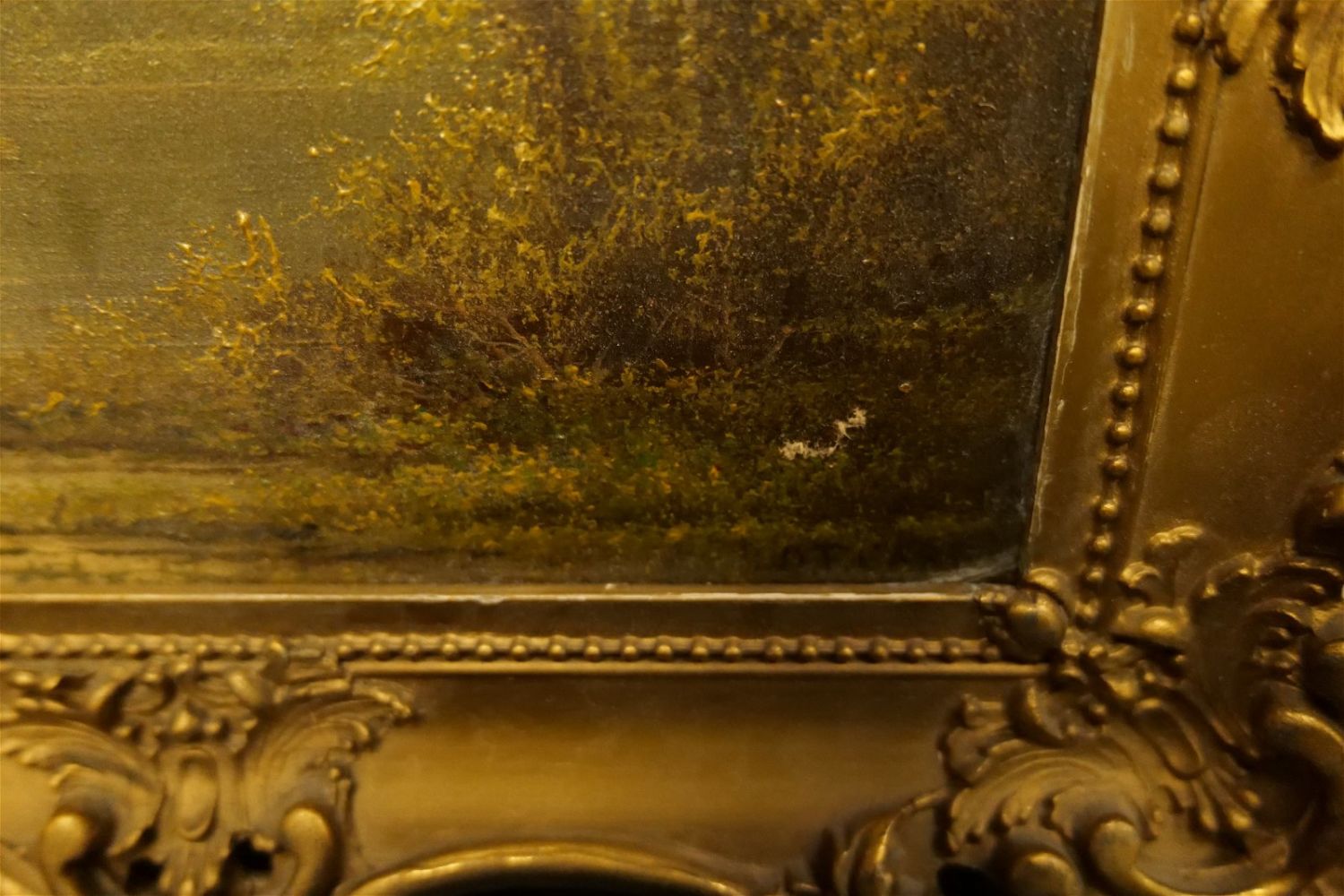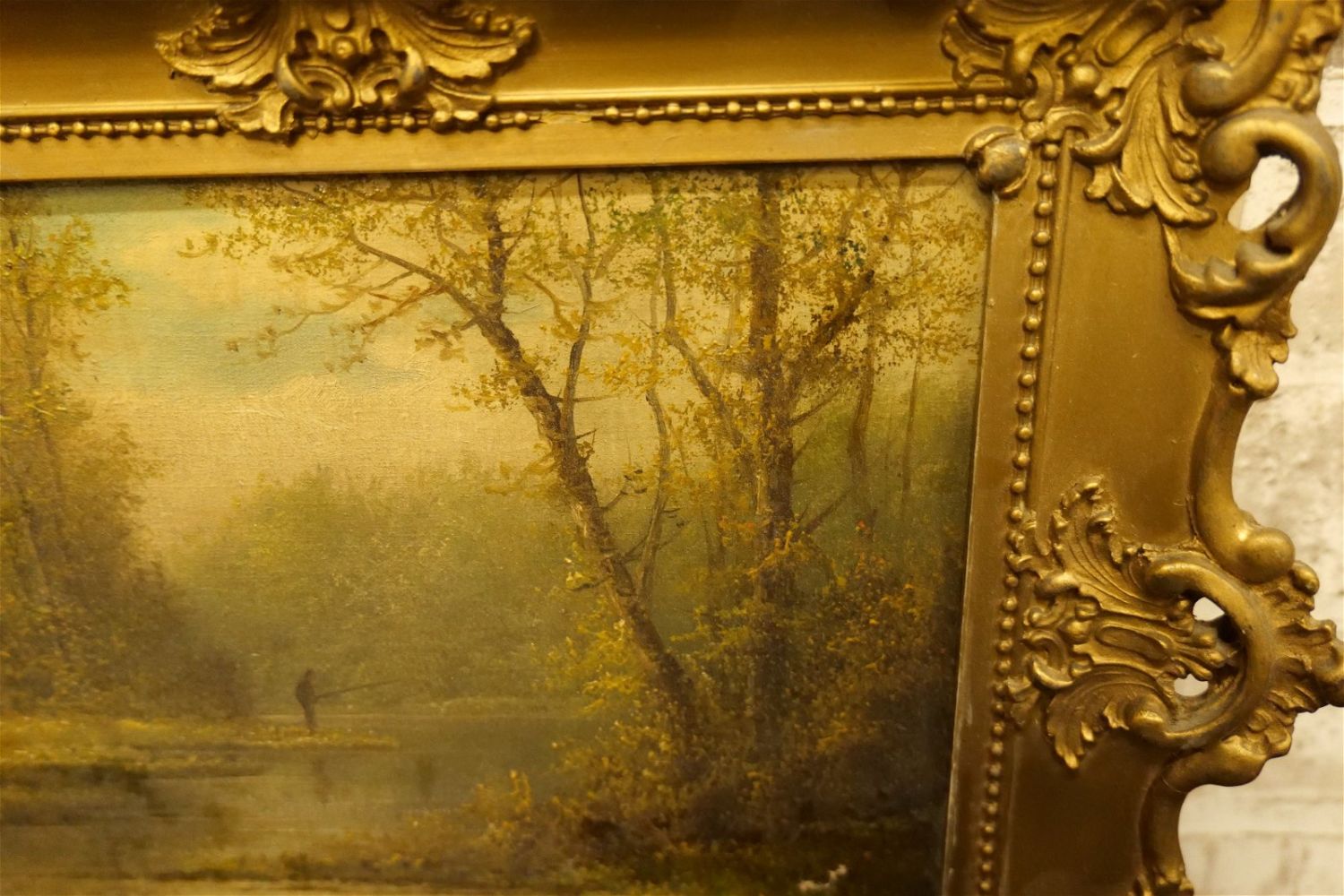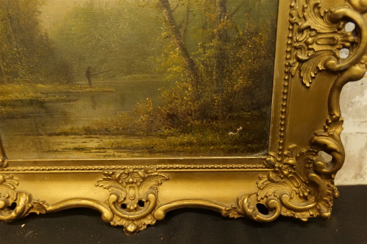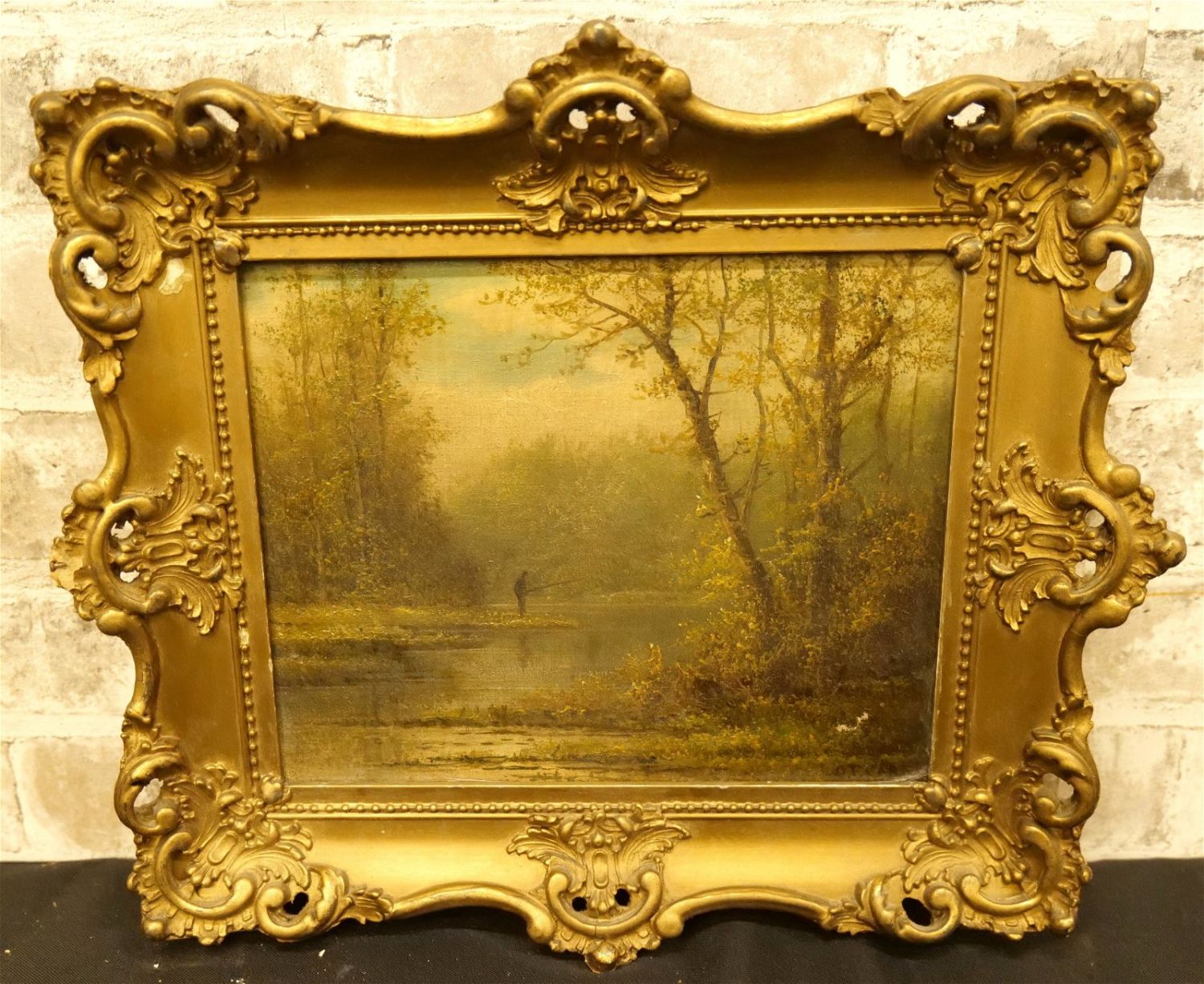 19th Century Oil on Canvas depicting a man fishing on a lake in the forest. Tearing towards lower right – does not go all the way through. Has minor paint loss. Signed lower right – Appears to be O.T. Carr. Frame has minor loss. Measures 13" tall x 15" wide. All invoices must be paid within 24 hours of the sale. We offer multiple shipping options, please read the terms as they have changed. We also offer Pick-Ups Thursday, Friday, Saturday, and Monday immediately following the sale. BY APPOINTMENT ONLY. PLEASE READ THE NEW TERMS!!!