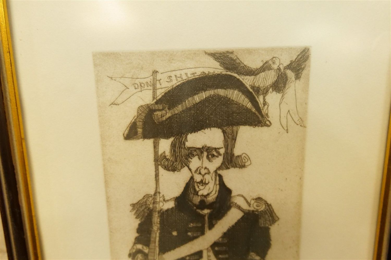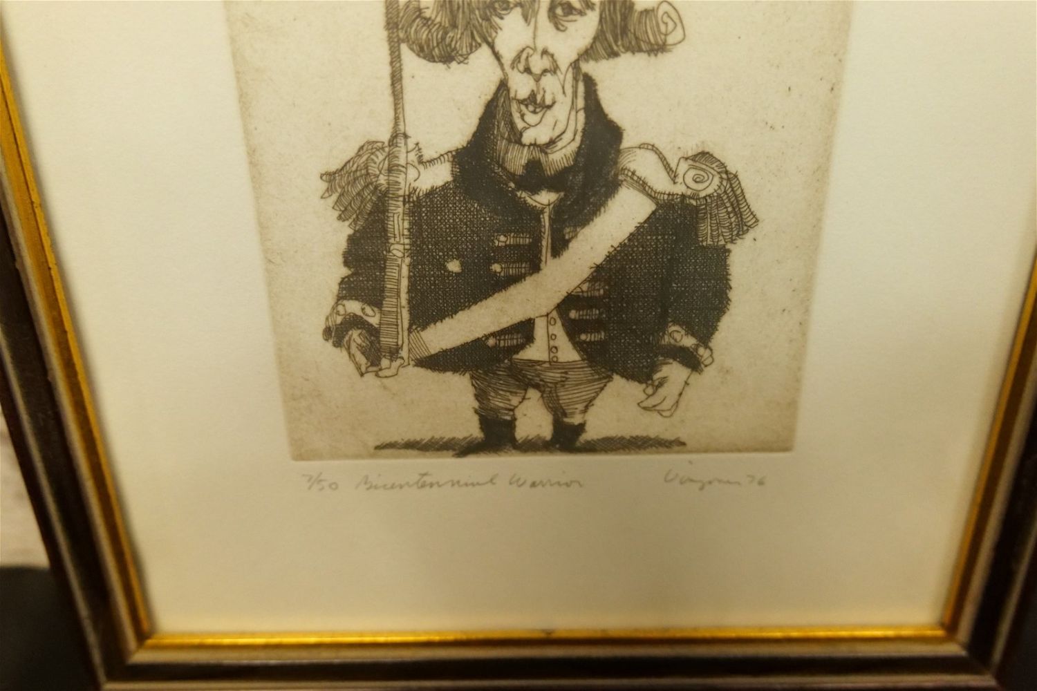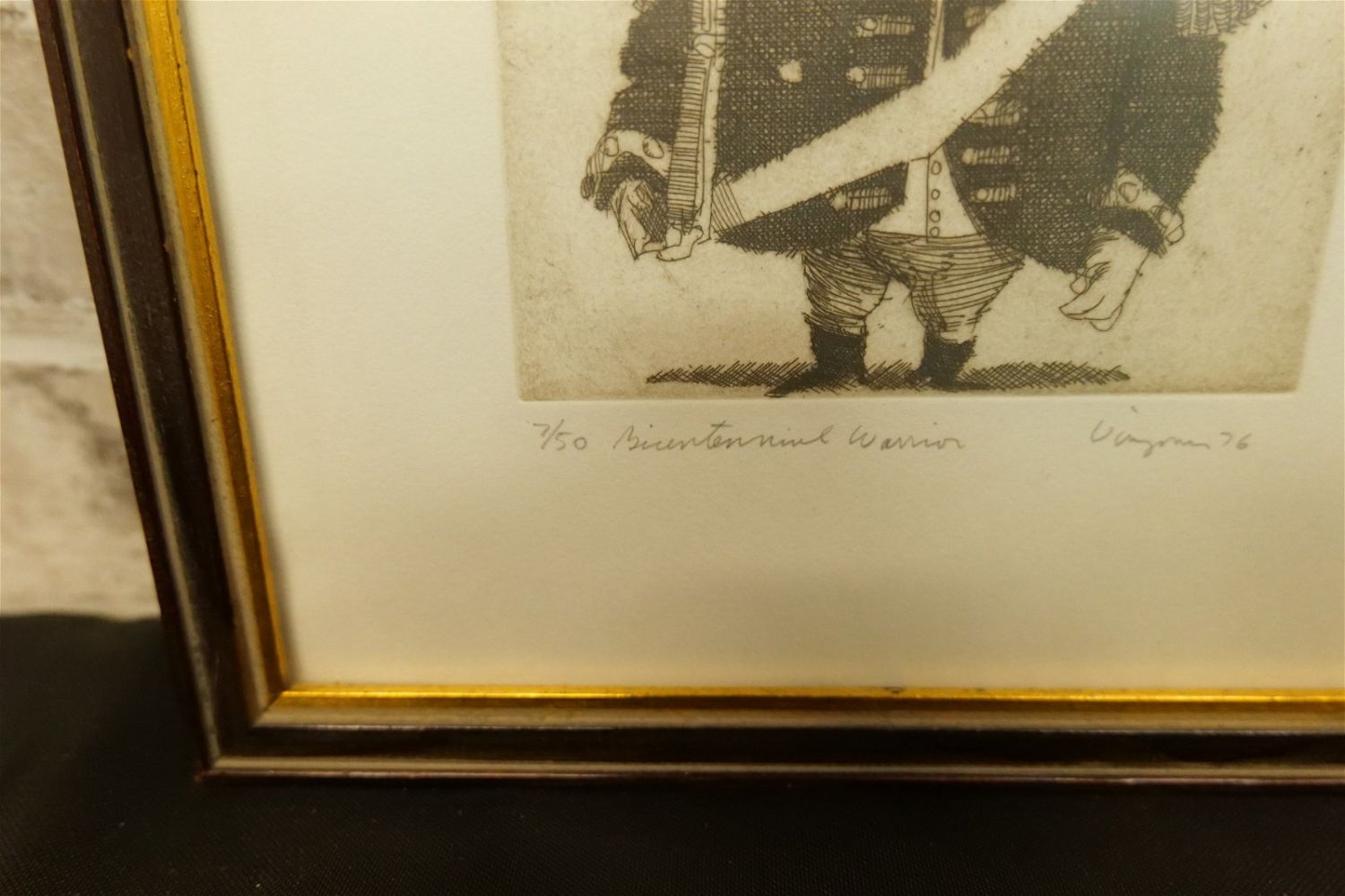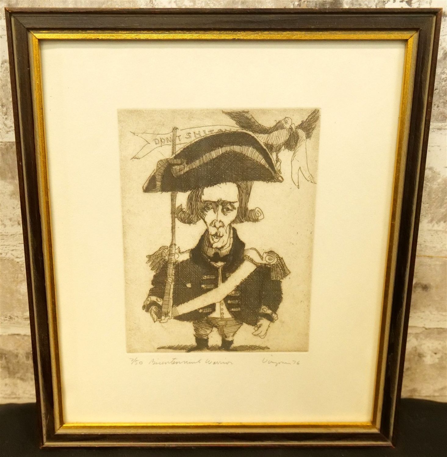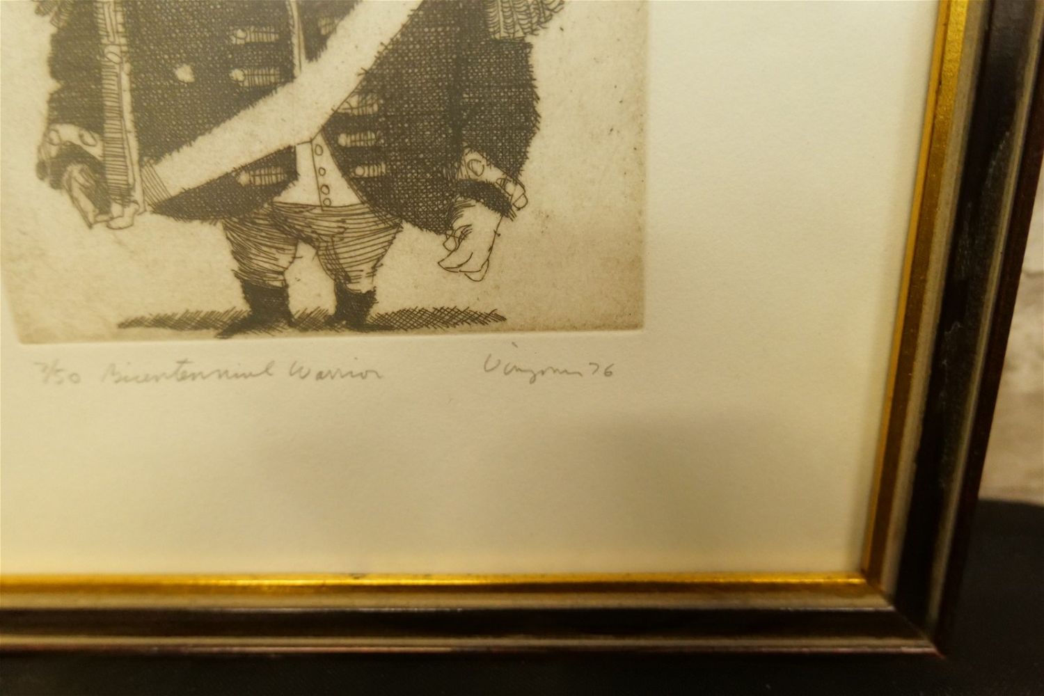 Etching by Hank Brigona (1929-2019). Entitled "Bicentennial Warrior". Signed lower right. Dated 1976. #7/50. Measures 11" tall x 9.5" wide. All invoices must be paid within 24 hours of the sale. We offer multiple shipping options, please read the terms as they have changed. We also offer Pick-Ups Thursday, Friday, Saturday, and Monday immediately following the sale. BY APPOINTMENT ONLY. PLEASE READ THE NEW TERMS!!!