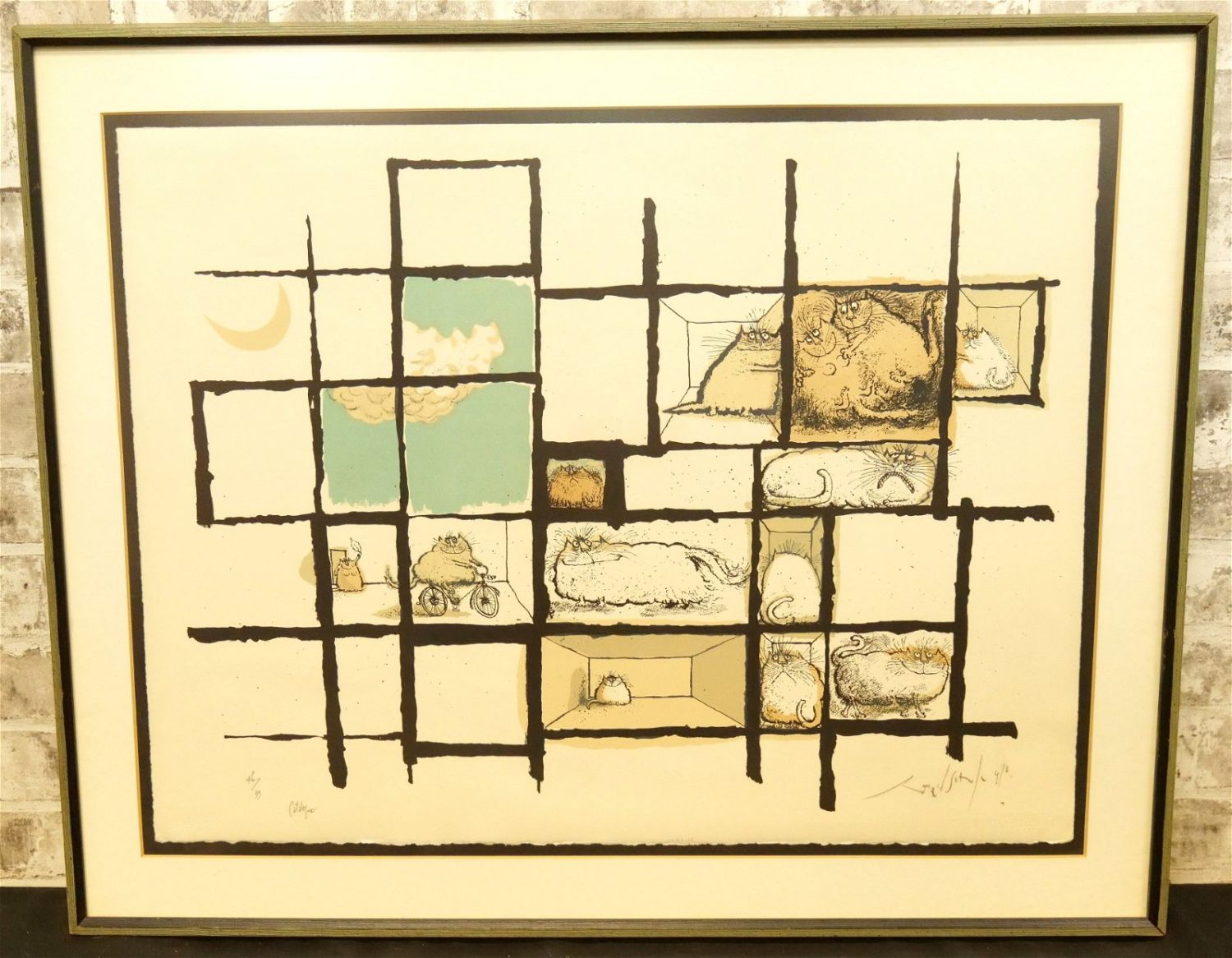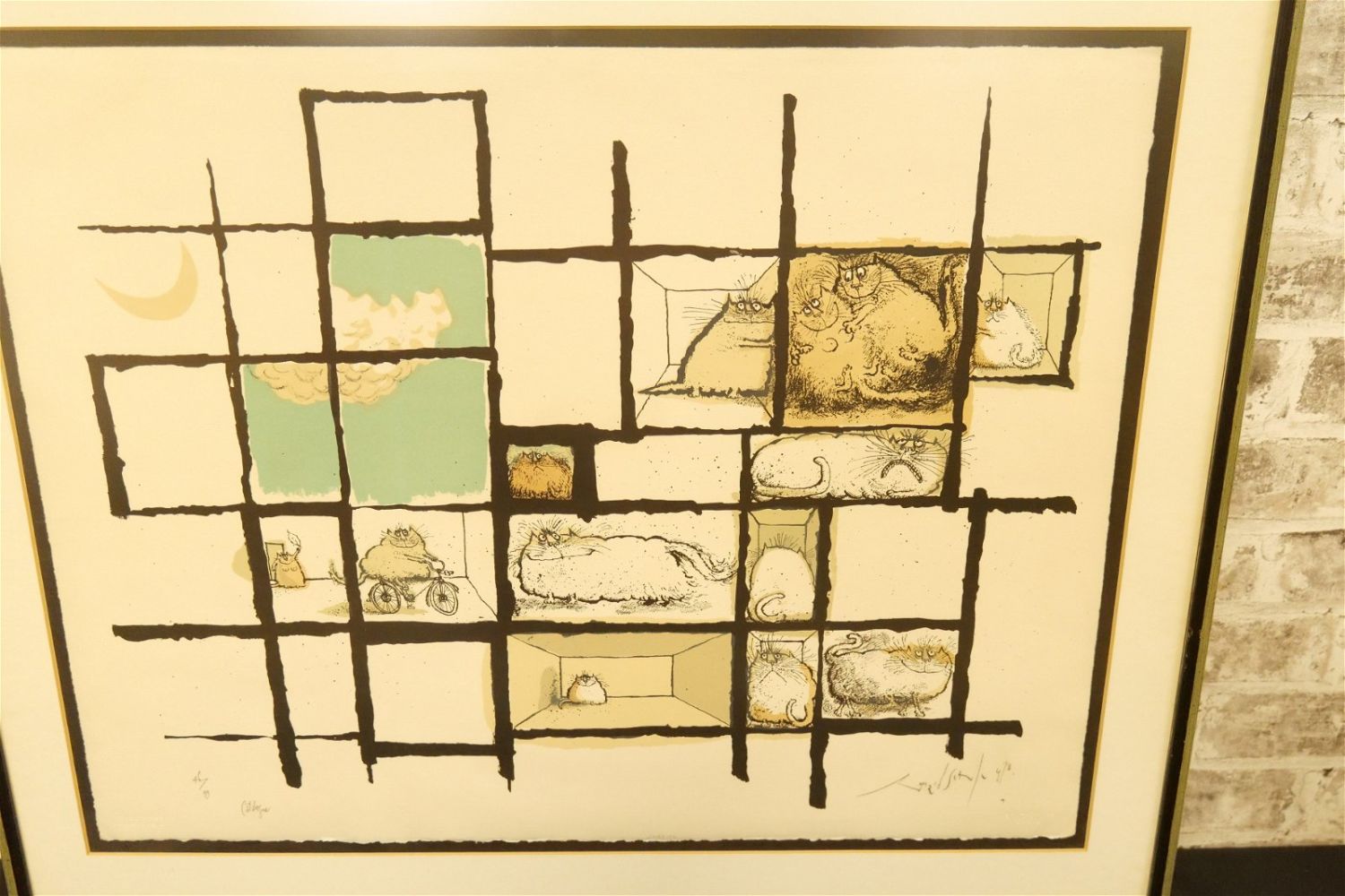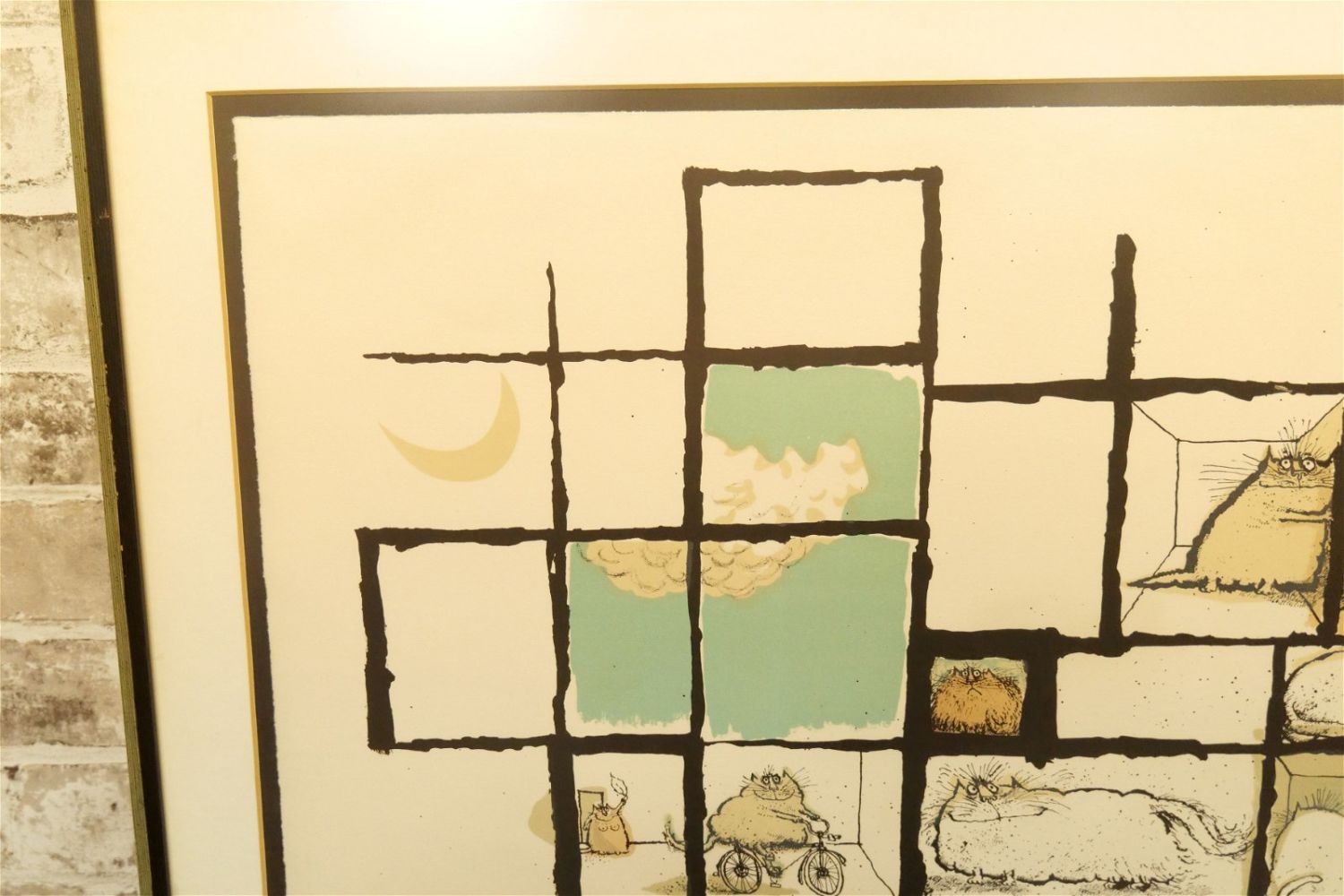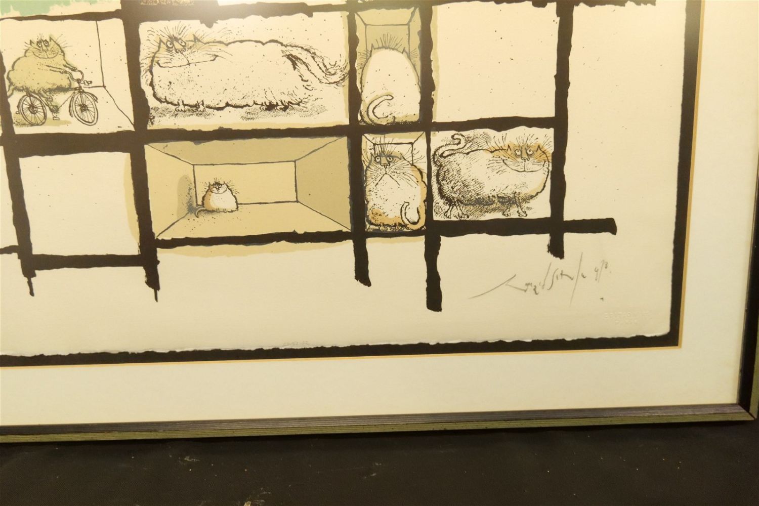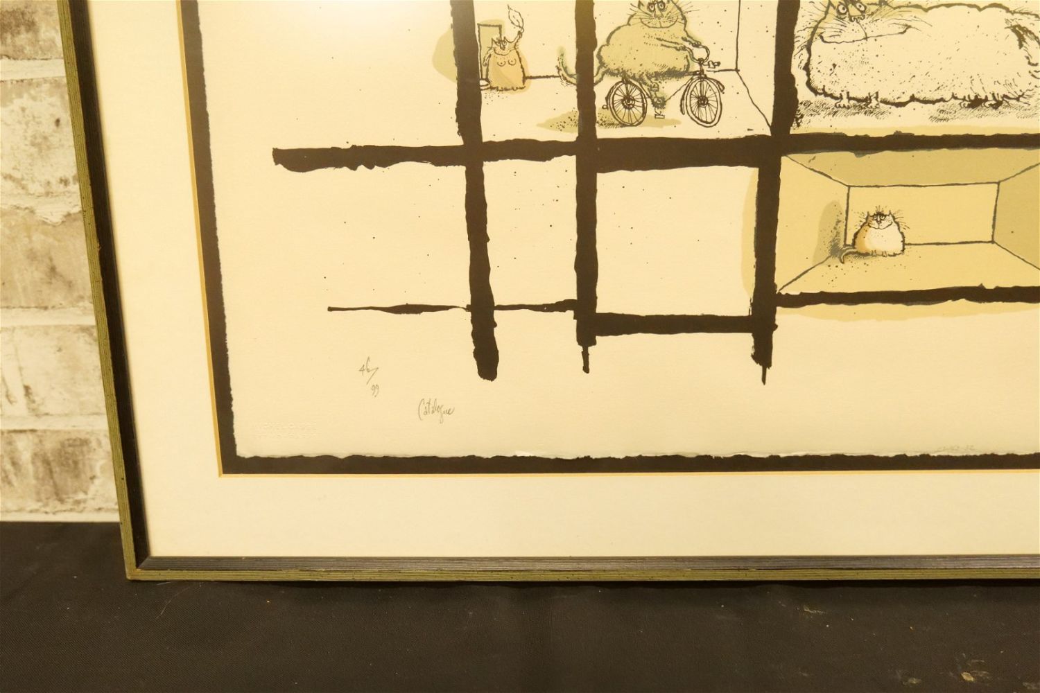 Framed Lithograph by Ronald Searle. Entitled "Catalogue". Depicting Cartoonish Cats in Windows. Signed lower right. Dated 1963. #46/99. Paper has raised seal. Marked Michael Casse Litho-Paris. Edition RS Paris. Measures 25.5" tall x 31" wide. All invoices must be paid within 24 hours of the sale. We offer multiple shipping options, please read the terms as they have changed. We also offer Pick-Ups Thursday, Friday, Saturday, and Monday immediately following the sale. BY APPOINTMENT ONLY. PLEASE READ THE NEW TERMS!!!