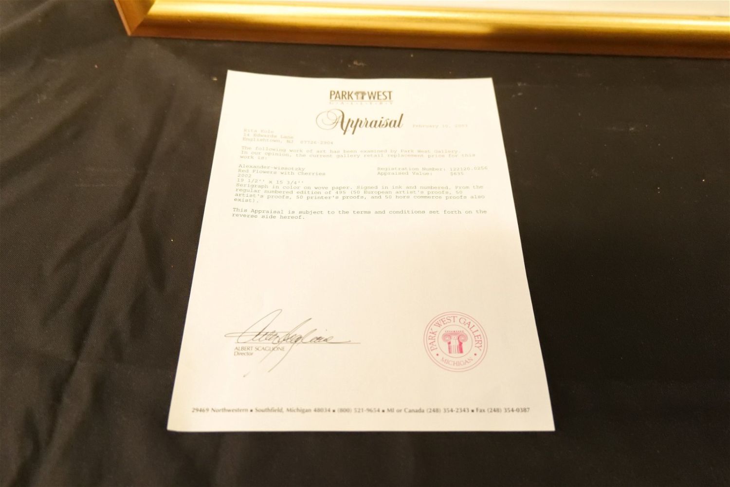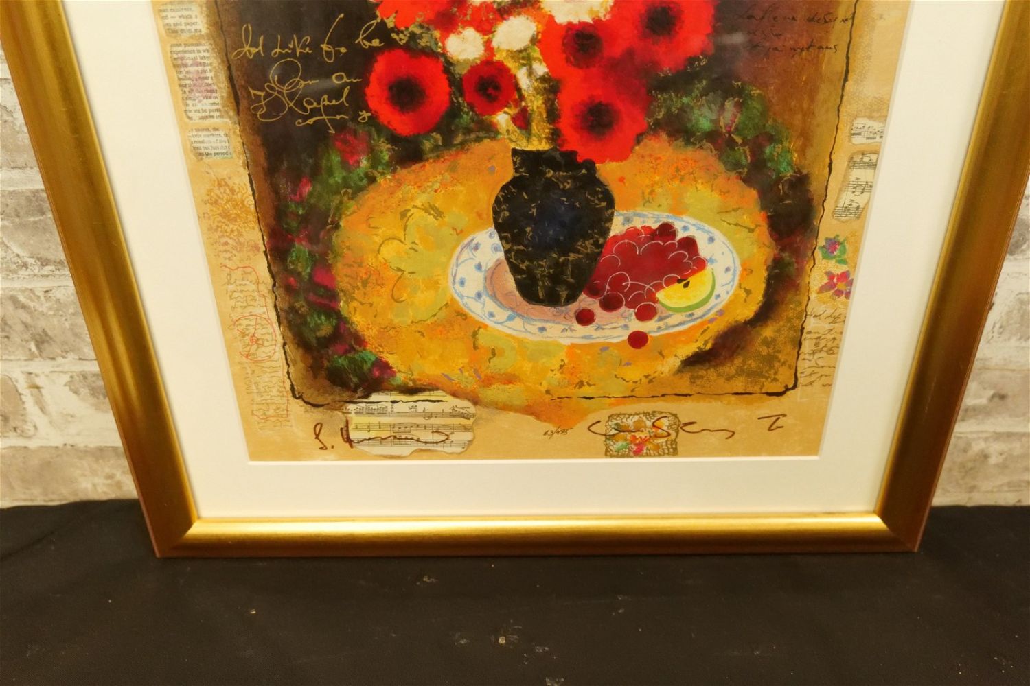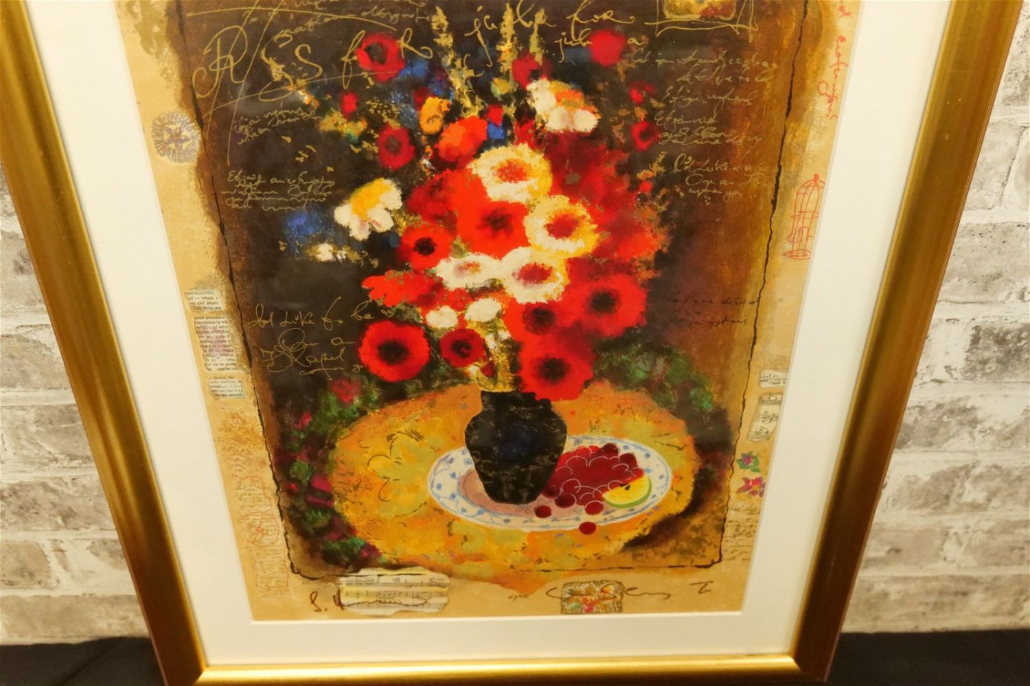 Serigraph on Wove Paper by Alexander-Wissotzky. Entitled "Red Flowers with Cherries". Double Signature. #63/495. Measures 26" tall x 22" wide. Comes with Appraisal from Park West. All invoices must be paid within 24 hours of the sale. We offer multiple shipping options, please read the terms as they have changed. We also offer Pick-Ups Thursday, Friday, Saturday, and Monday immediately following the sale. BY APPOINTMENT ONLY. PLEASE READ THE NEW TERMS!!!