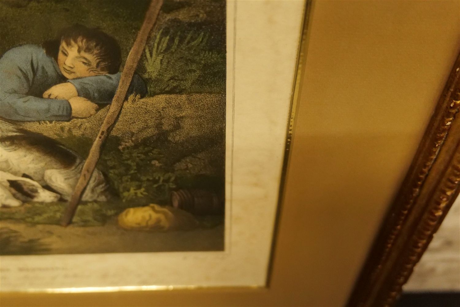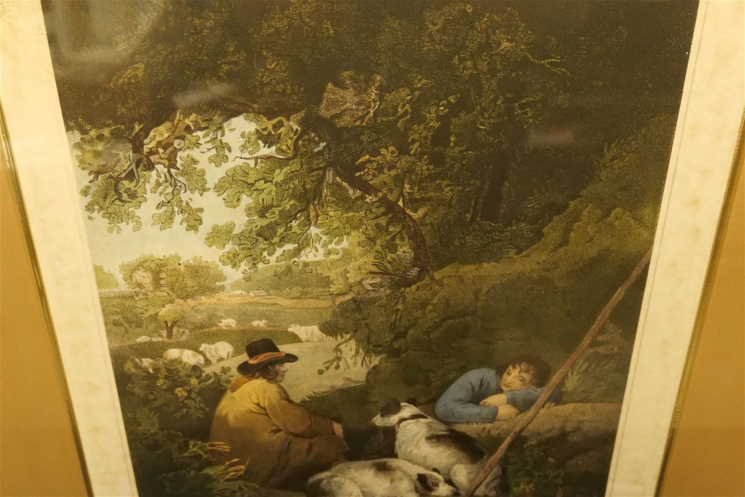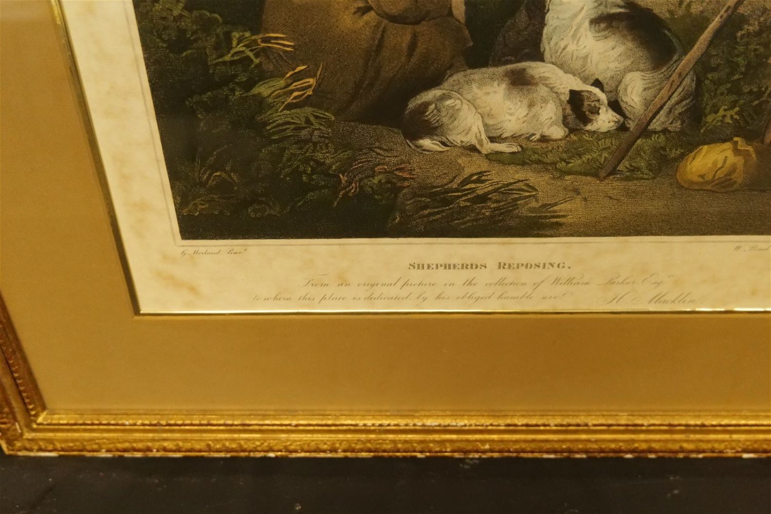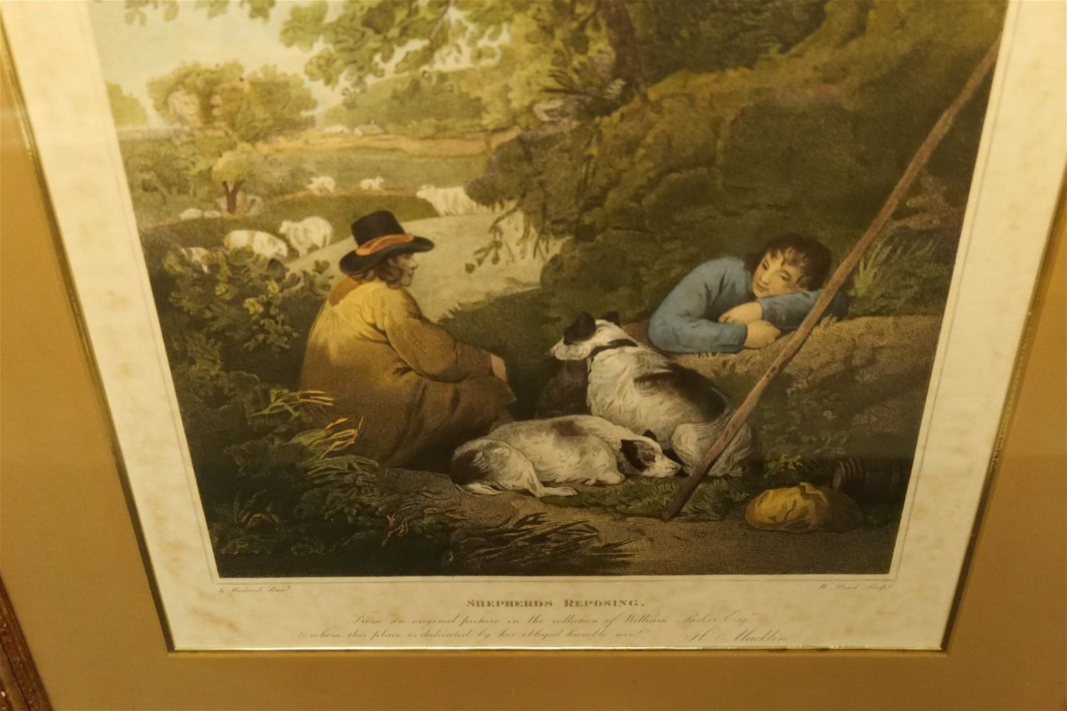 Hand Colored Engraving by Morland. Entitled "Shepherds Reposing". Heavy Staining on Border and Significant Mold on the top left. Needs to be cleaned. Measures 31" tall x 26" wide. All invoices must be paid within 24 hours of the sale. We offer multiple shipping options, please read the terms as they have changed. We also offer Pick-Ups Thursday, Friday, Saturday, and Monday immediately following the sale. BY APPOINTMENT ONLY. PLEASE READ THE NEW TERMS!!!
