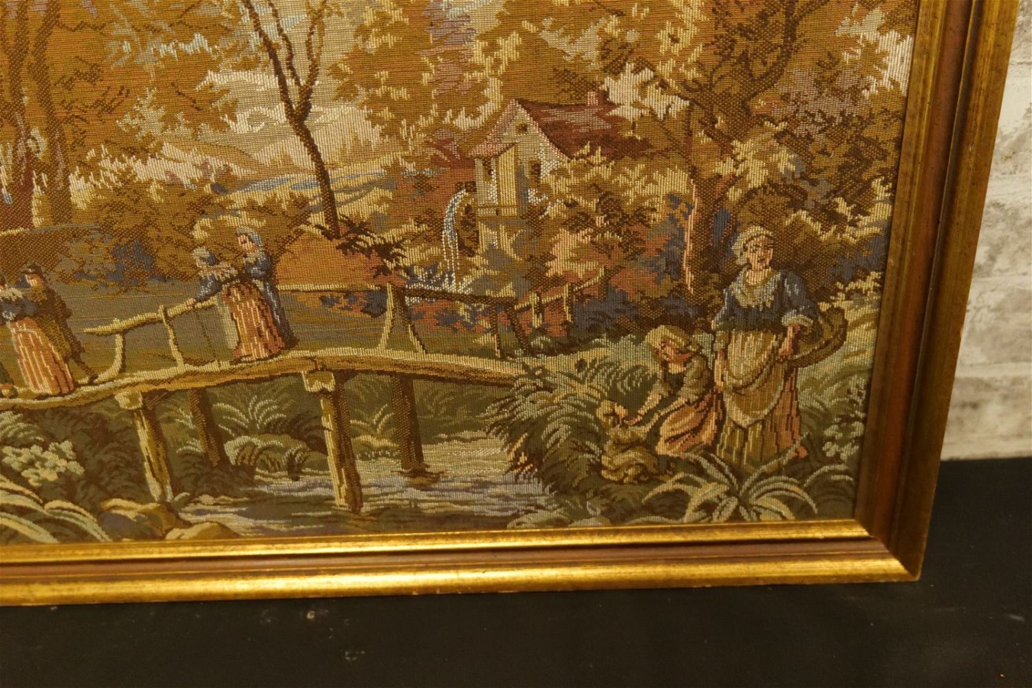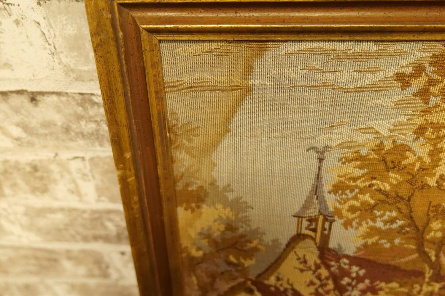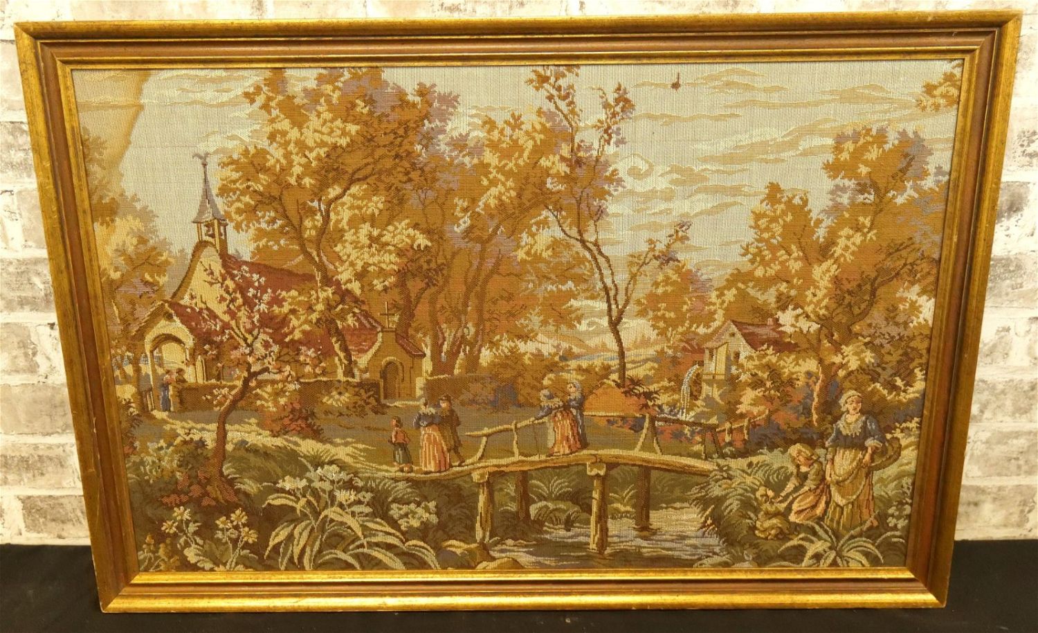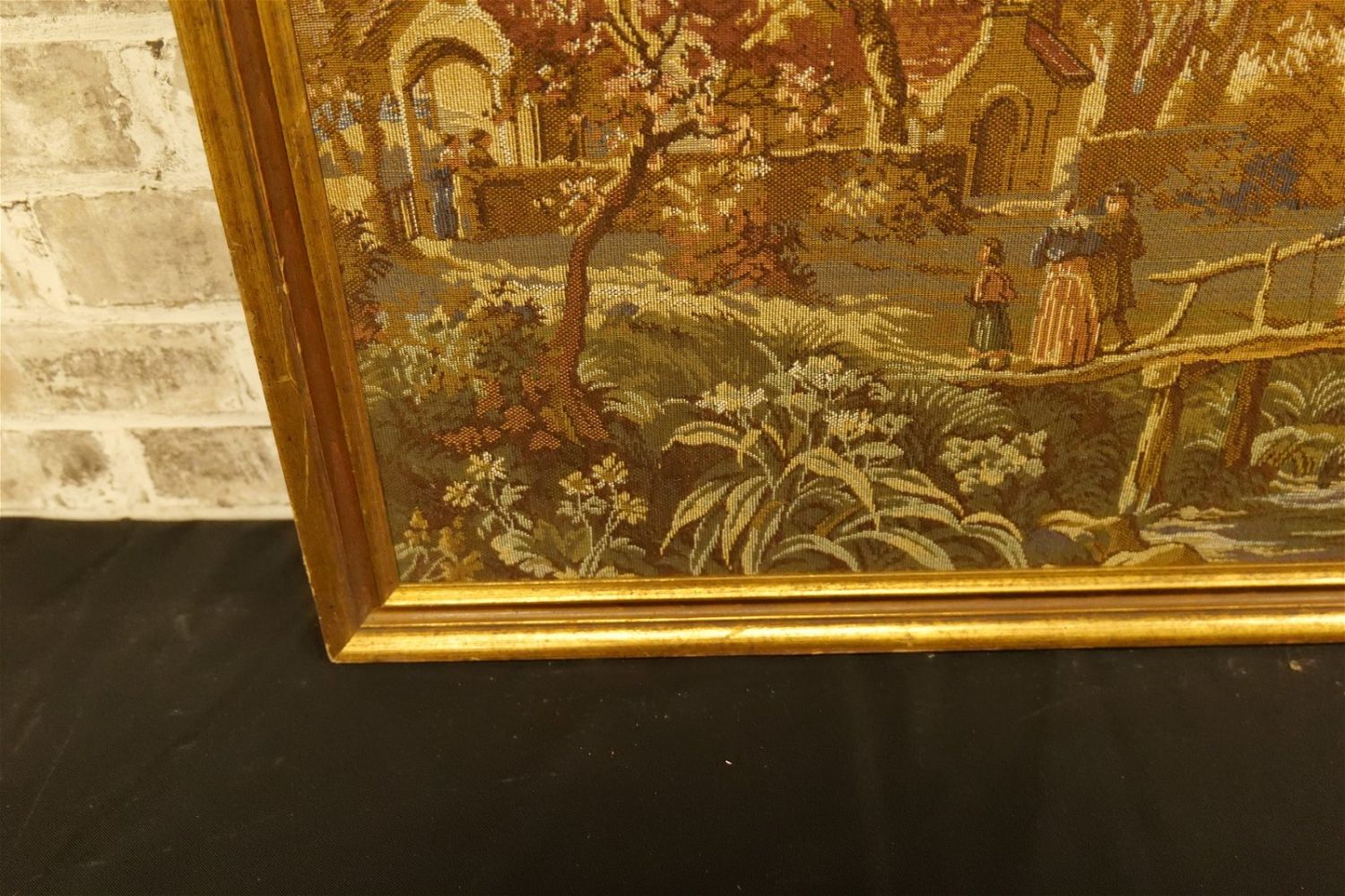 Framed Tapestry depicting people congregating to a church. Has water stain upper left corner. Measures 21.5" tall x 31.5" wide. All invoices must be paid within 24 hours of the sale. We offer multiple shipping options, please read the terms as they have changed. We also offer Pick-Ups Thursday, Friday, Saturday, and Monday immediately following the sale. BY APPOINTMENT ONLY. PLEASE READ THE NEW TERMS!!!