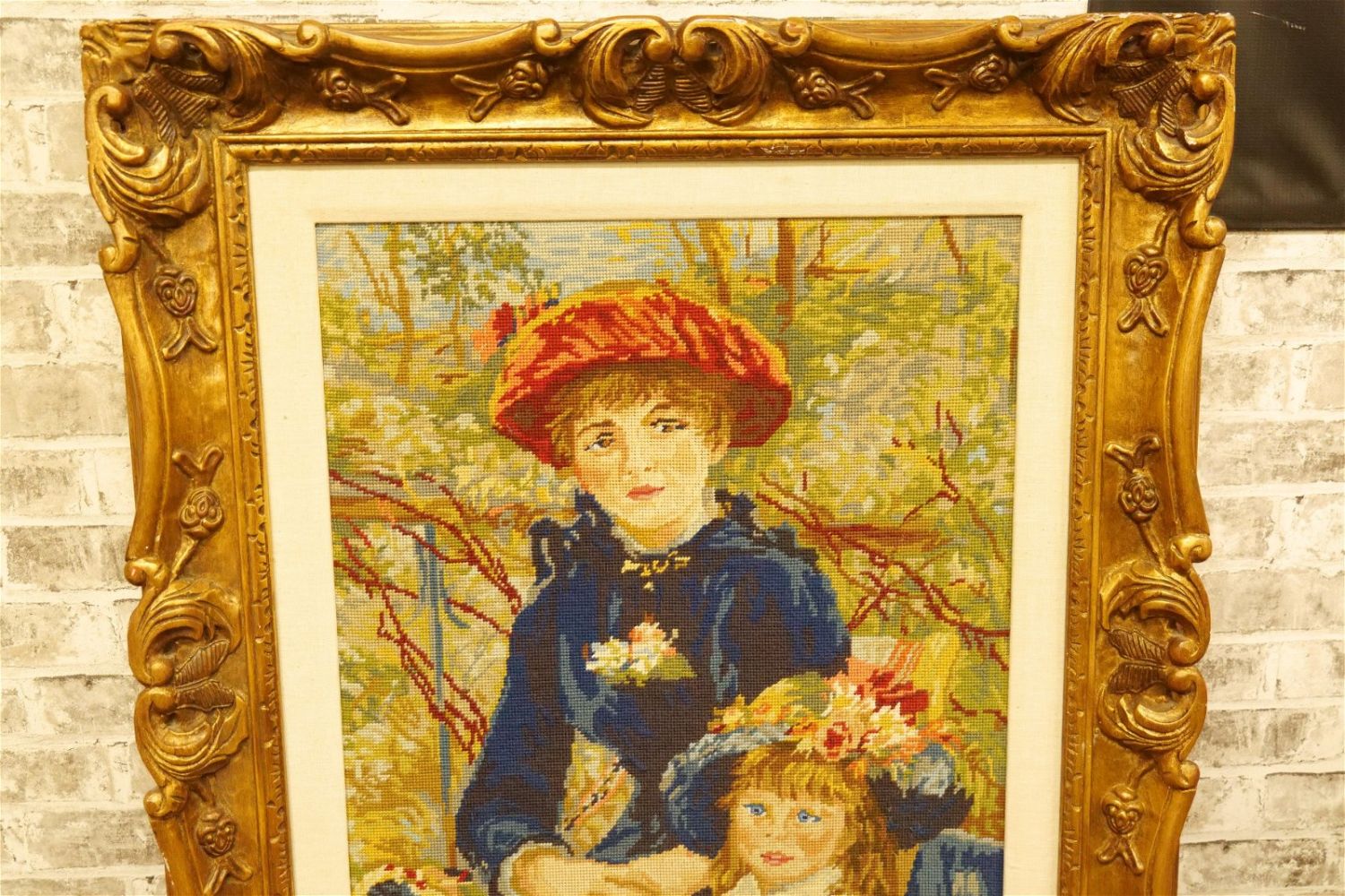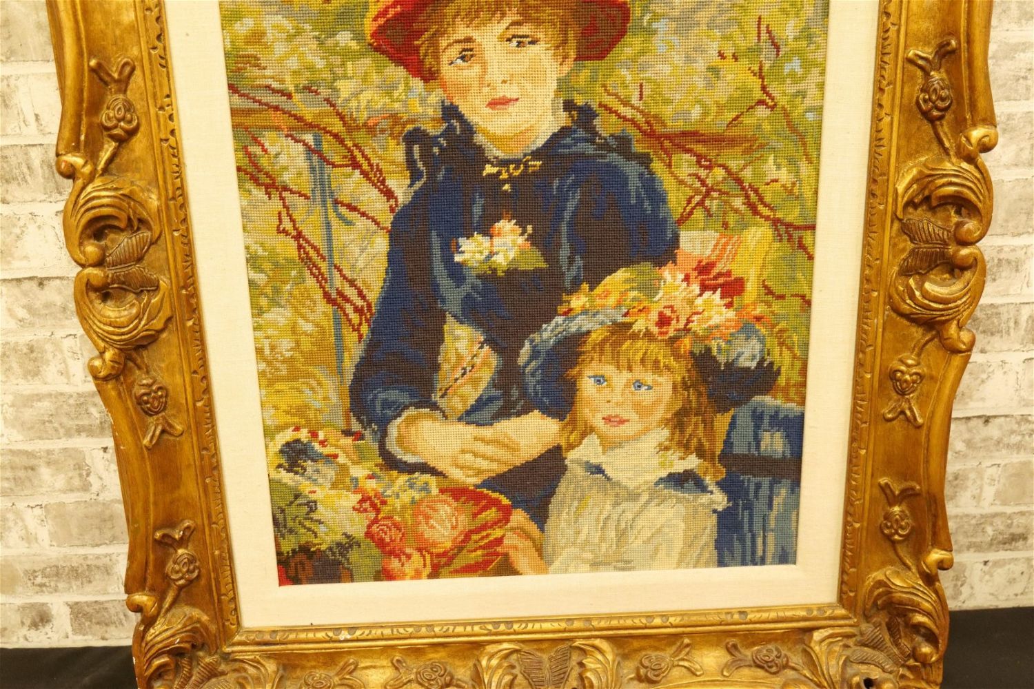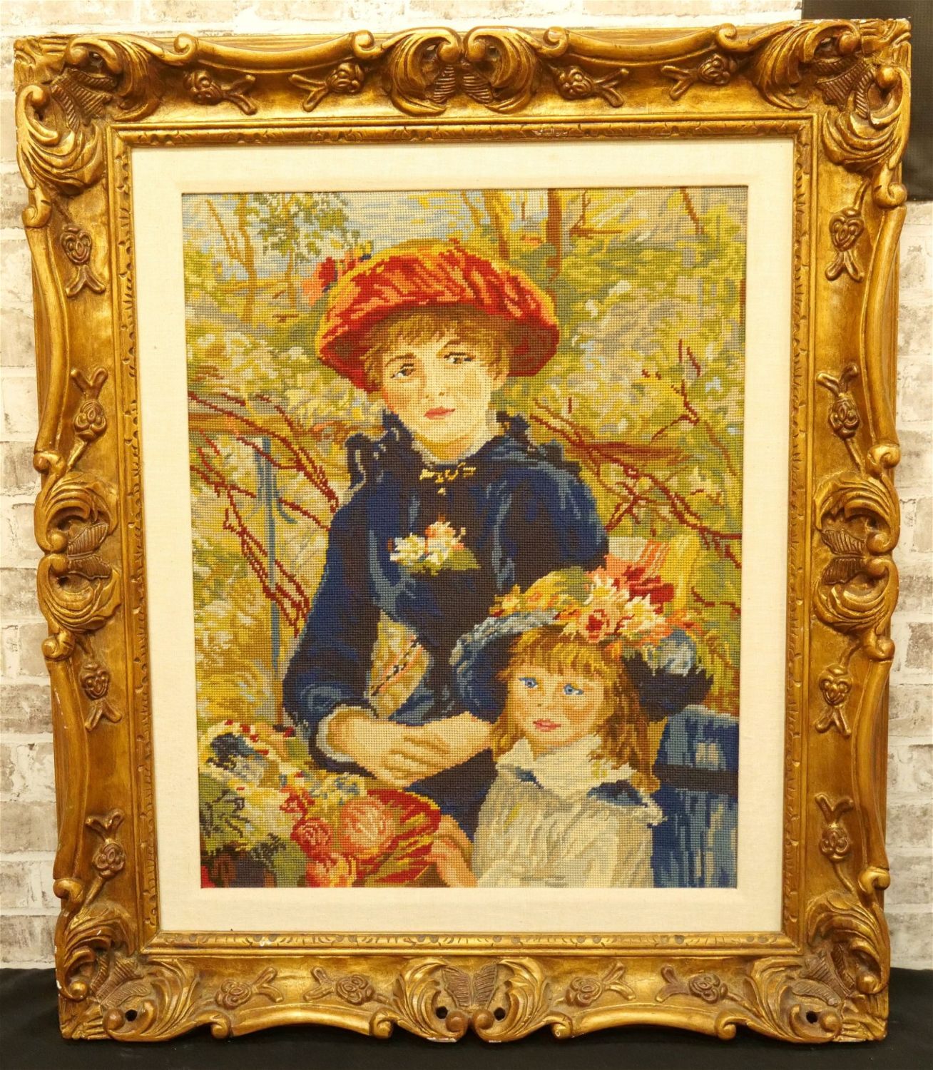 Framed Needlepoint depicting Mother with Child. Measures 39.5" tall x 34" wide. All invoices must be paid within 24 hours of the sale. We offer multiple shipping options, please read the terms as they have changed. We also offer Pick-Ups Thursday, Friday, Saturday, and Monday immediately following the sale. BY APPOINTMENT ONLY. PLEASE READ THE NEW TERMS!!!