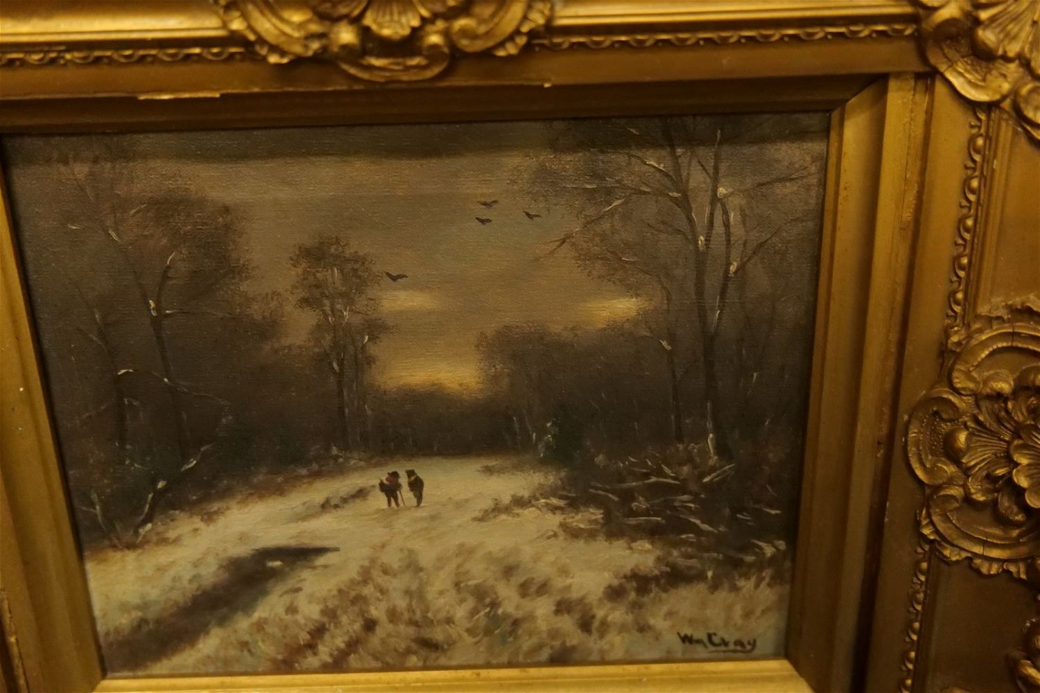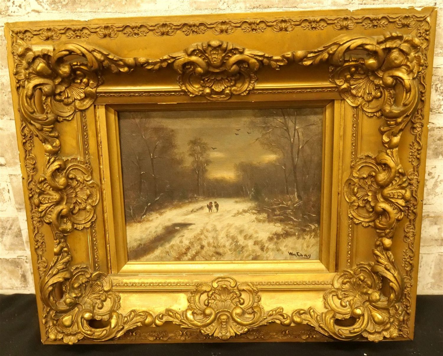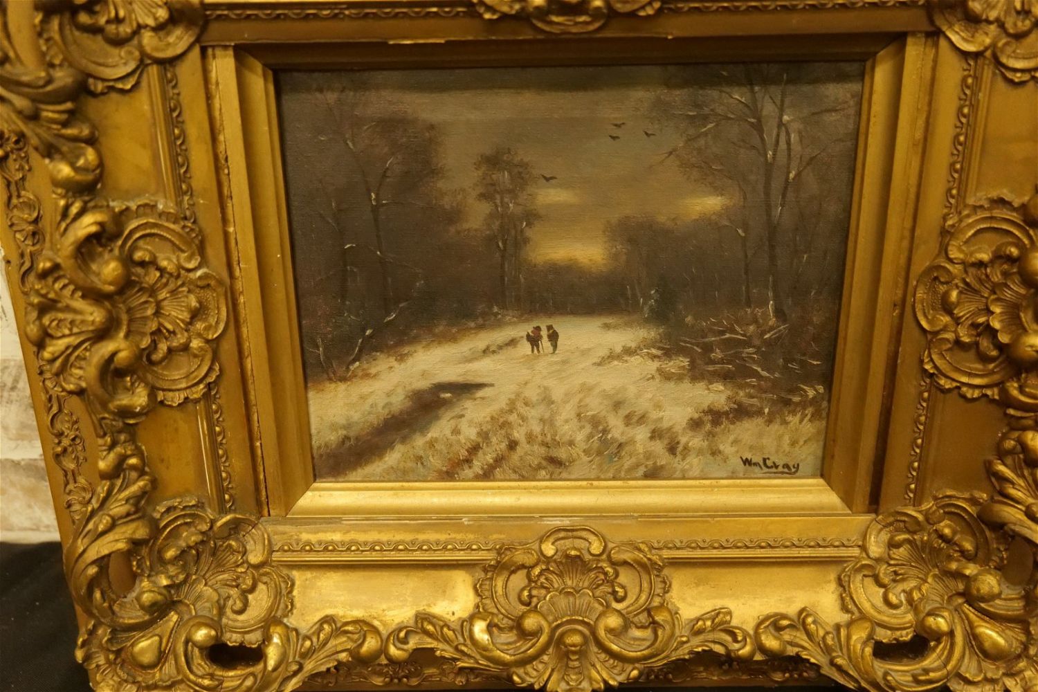 Oil on canvas landscape depicting two men on a trail with a winter scene. Signed lower right – Appears to be Wm Clay. Has minor loss to frame. Measures 17" tall x 19" long. All invoices must be paid within 24 hours of the sale. We offer multiple shipping options, please read the terms as they have changed. We also offer Pick-Ups Thursday, Friday, Saturday, and Monday immediately following the sale. BY APPOINTMENT ONLY. PLEASE READ THE NEW TERMS!!!