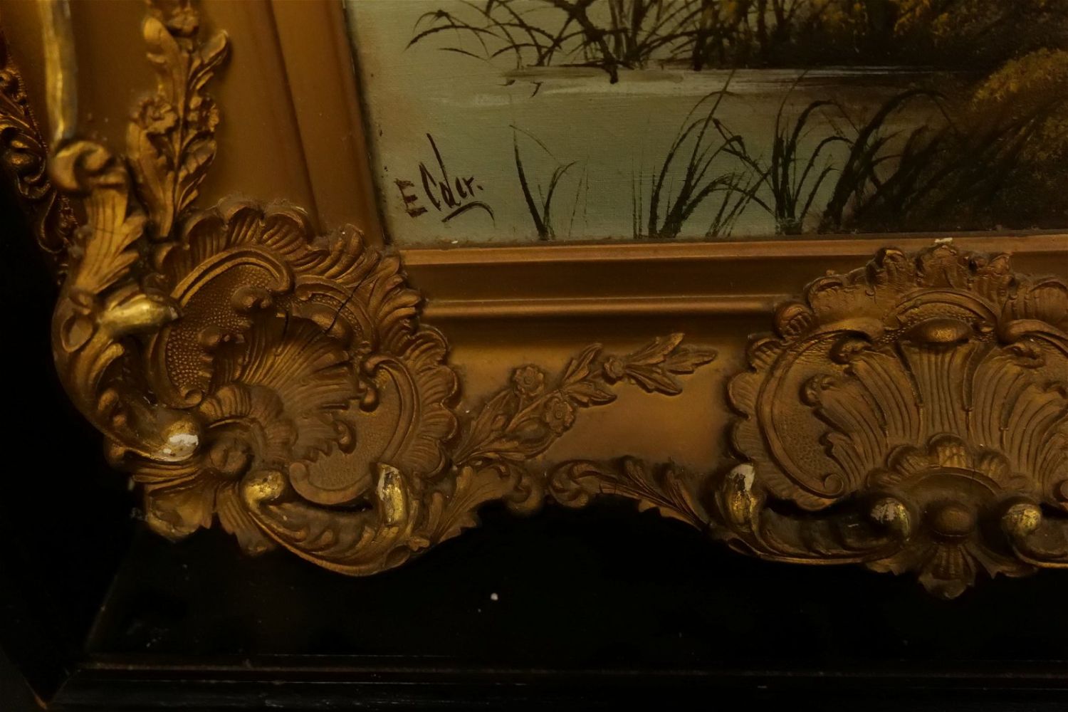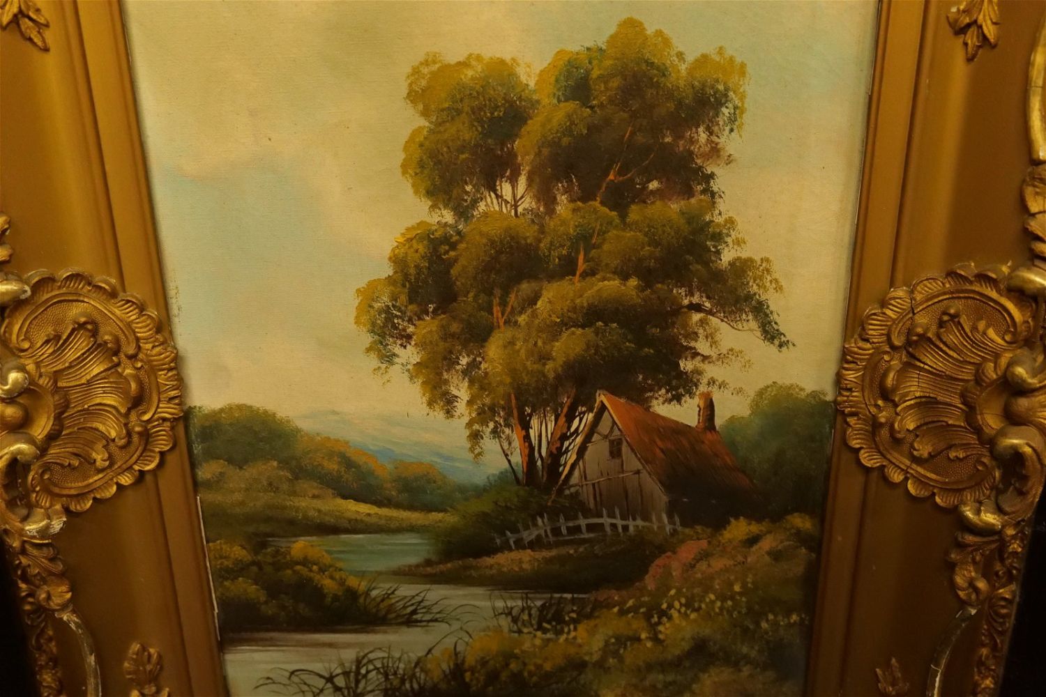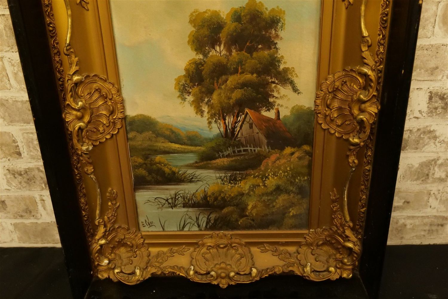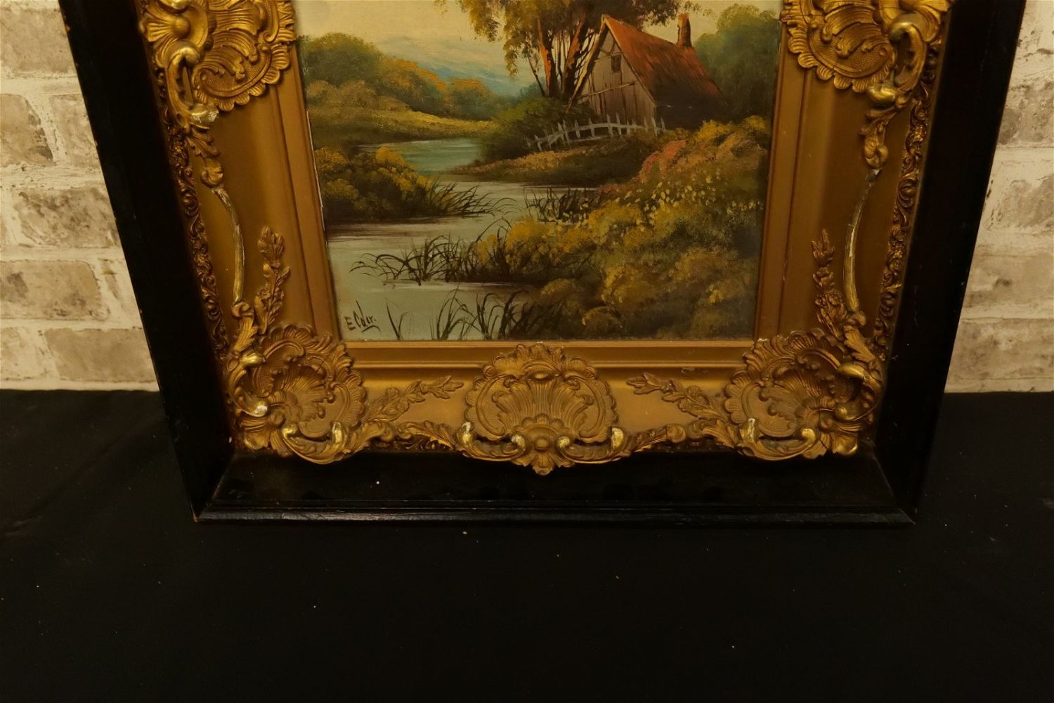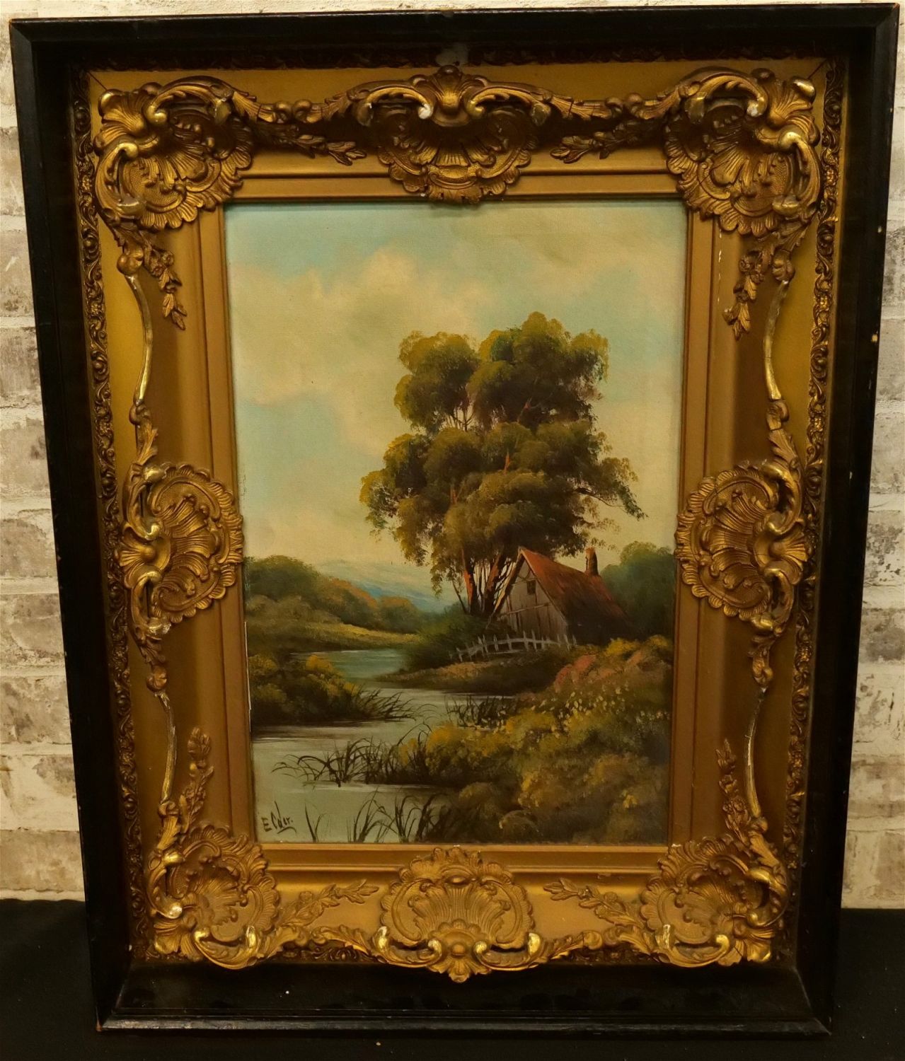 Oil on canvas landscape depicting a cottage on a stream. Signed lower left – Appears to be E. Color. Comes in a shadow box frame with no glass front and minor loss on gilded frame. Measures 26" tall x 20" long. All invoices must be paid within 24 hours of the sale. We offer multiple shipping options, please read the terms as they have changed. We also offer Pick-Ups Thursday, Friday, Saturday, and Monday immediately following the sale. BY APPOINTMENT ONLY. PLEASE READ THE NEW TERMS!!!