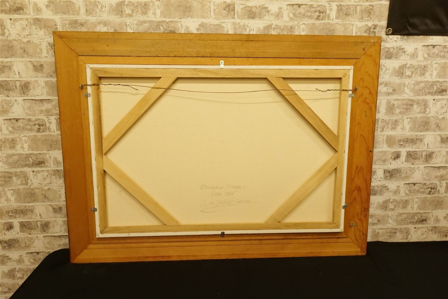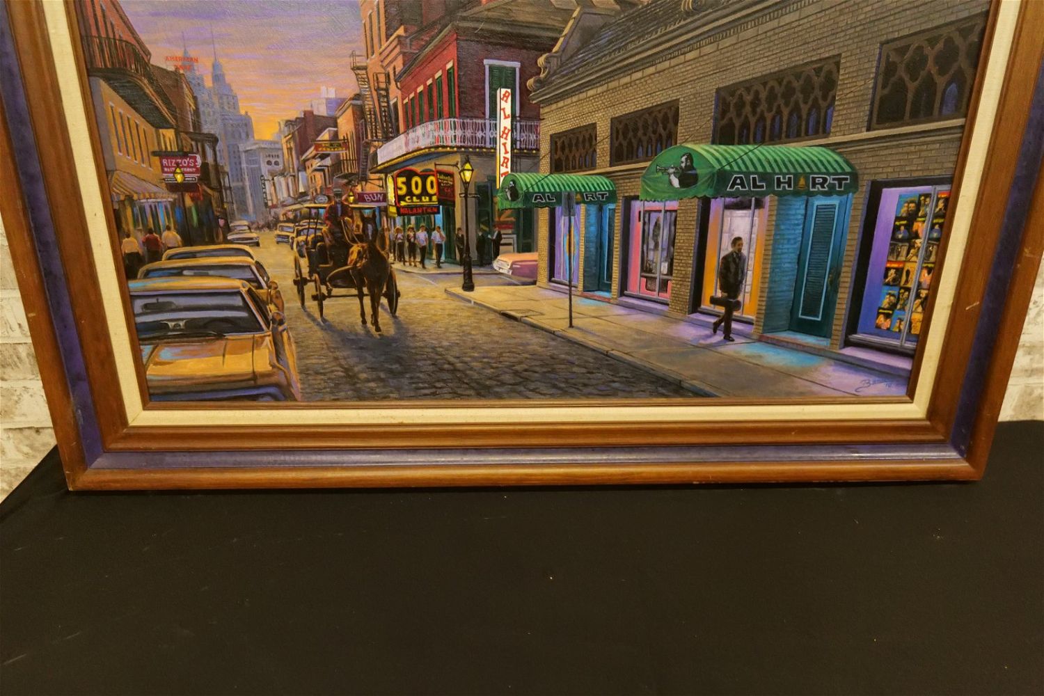 Original Oil on Canvas by Glen Fortune Banse (1948-2018) Entitled "Bourbon Street Circa 1964". Depicting New Orleans Street with 500 Club. Signed Lower Right. Dated ’10. Also signed and noted on back of canvas. Measures 32.5" tall x 44.5". wide. Framed. Glen Fortune Banse (1948-2018) (aka Banse, Wayne Howell, Etienne and many other names) was born in Camden, New Jersey in 1948. He attended Ottawa University, Kansas State and The New School For Social Research in New York City, and has been a professional artist for close to 50 years. He was a co-partner in 3 Art Publishing businesses which specialized in Fine Art Signed and Numbered Limited Edition Lithography, Etchings and other fine art mediums. While publishing his own work, he was also the Art Director of all three companies and had the pleasure of working with, directing, and instructing hundreds of great nationally and internationally known artists such as Peter Max, Will Moses, John Pitre, Sarah Churchill (Daughter of Winston Churchill), Gerald Lubeck, Yanni Posnikov, and the world-famous Mr. Blackwell of Hollywood’s 10 Worst Dressed List presented each year. Throughout the 1990’s Glen was Personal Assistant, Confidant and Agent to Television Pioneer and Legend "Buffalo Bob" Smith of Howdy Doody fame, spending many years crisscrossing America with the Iconic Duo. Glen more recently focused his energy on Oils, presenting a well diversified subject matter. His works and portraits have been commissioned by the state of New Jersey, with pieces on permanent display in various State Buildings throughout the Garden State. His Art can be found in museums, galleries, celebrity collections and other venues through out the world.Provenance: This piece was consigned from the estate of Glen Fortune BanseAll invoices must be paid within 24 hours of the sale. We offer multiple shipping options, please read the terms as they have changed. We also offer Pick-Ups Thursday, Friday, Saturday, and Monday immediately following the sale. BY APPOINTMENT ONLY. PLEASE READ THE NEW TERMS!!!