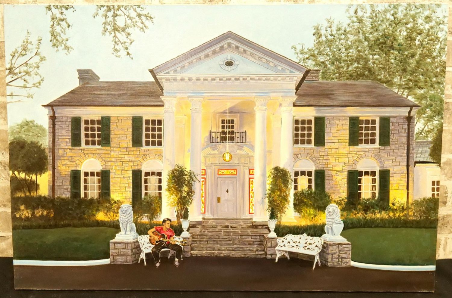 Original Oil on Canvas by Glen Fortune Banse (1948-2018) Entitled "A Memphis Summer Evening". Depicting Elvis at Graceland. Signed and noted on back of canvas. Dated 2017. Measures 24" tall x 36". wide. Unframed. Glen Fortune Banse (1948-2018) (aka Banse, Wayne Howell, Etienne and many other names) was born in Camden, New Jersey in 1948. He attended Ottawa University, Kansas State and The New School For Social Research in New York City, and has been a professional artist for close to 50 years. He was a co-partner in 3 Art Publishing businesses which specialized in Fine Art Signed and Numbered Limited Edition Lithography, Etchings and other fine art mediums. While publishing his own work, he was also the Art Director of all three companies and had the pleasure of working with, directing, and instructing hundreds of great nationally and internationally known artists such as Peter Max, Will Moses, John Pitre, Sarah Churchill (Daughter of Winston Churchill), Gerald Lubeck, Yanni Posnikov, and the world-famous Mr. Blackwell of Hollywood’s 10 Worst Dressed List presented each year. Throughout the 1990’s Glen was Personal Assistant, Confidant and Agent to Television Pioneer and Legend "Buffalo Bob" Smith of Howdy Doody fame, spending many years crisscrossing America with the Iconic Duo. Glen more recently focused his energy on Oils, presenting a well diversified subject matter. His works and portraits have been commissioned by the state of New Jersey, with pieces on permanent display in various State Buildings throughout the Garden State. His Art can be found in museums, galleries, celebrity collections and other venues through out the world.Provenance: This piece was consigned from the estate of Glen Fortune BanseAll invoices must be paid within 24 hours of the sale. We offer multiple shipping options, please read the terms as they have changed. We also offer Pick-Ups Thursday, Friday, Saturday, and Monday immediately following the sale. BY APPOINTMENT ONLY. PLEASE READ THE NEW TERMS!!!