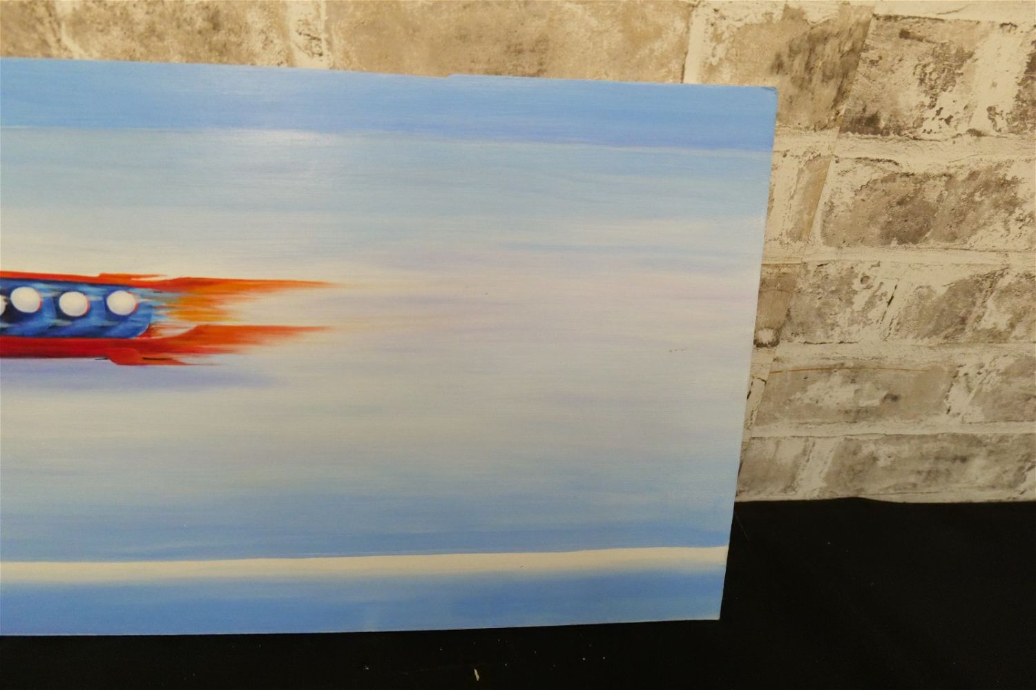 Original Oil on Board by Glen Fortune Banse (1948-2018). Depicting a Bobsled in Motion. Unsigned. Measures 12" tall x 24". wide. Unframed. Glen Fortune Banse (1948-2018) (aka Banse, Wayne Howell, Etienne and many other names) was born in Camden, New Jersey in 1948. He attended Ottawa University, Kansas State and The New School For Social Research in New York City, and has been a professional artist for close to 50 years. He was a co-partner in 3 Art Publishing businesses which specialized in Fine Art Signed and Numbered Limited Edition Lithography, Etchings and other fine art mediums. While publishing his own work, he was also the Art Director of all three companies and had the pleasure of working with, directing, and instructing hundreds of great nationally and internationally known artists such as Peter Max, Will Moses, John Pitre, Sarah Churchill (Daughter of Winston Churchill), Gerald Lubeck, Yanni Posnikov, and the world-famous Mr. Blackwell of Hollywood’s 10 Worst Dressed List presented each year. Throughout the 1990’s Glen was Personal Assistant, Confidant and Agent to Television Pioneer and Legend "Buffalo Bob" Smith of Howdy Doody fame, spending many years crisscrossing America with the Iconic Duo. Glen more recently focused his energy on Oils, presenting a well diversified subject matter. His works and portraits have been commissioned by the state of New Jersey, with pieces on permanent display in various State Buildings throughout the Garden State. His Art can be found in museums, galleries, celebrity collections and other venues through out the world.Provenance: This piece was consigned from the estate of Glen Fortune BanseAll invoices must be paid within 24 hours of the sale. We offer multiple shipping options, please read the terms as they have changed. We also offer Pick-Ups Thursday, Friday, Saturday, and Monday immediately following the sale. BY APPOINTMENT ONLY. PLEASE READ THE NEW TERMS!!!