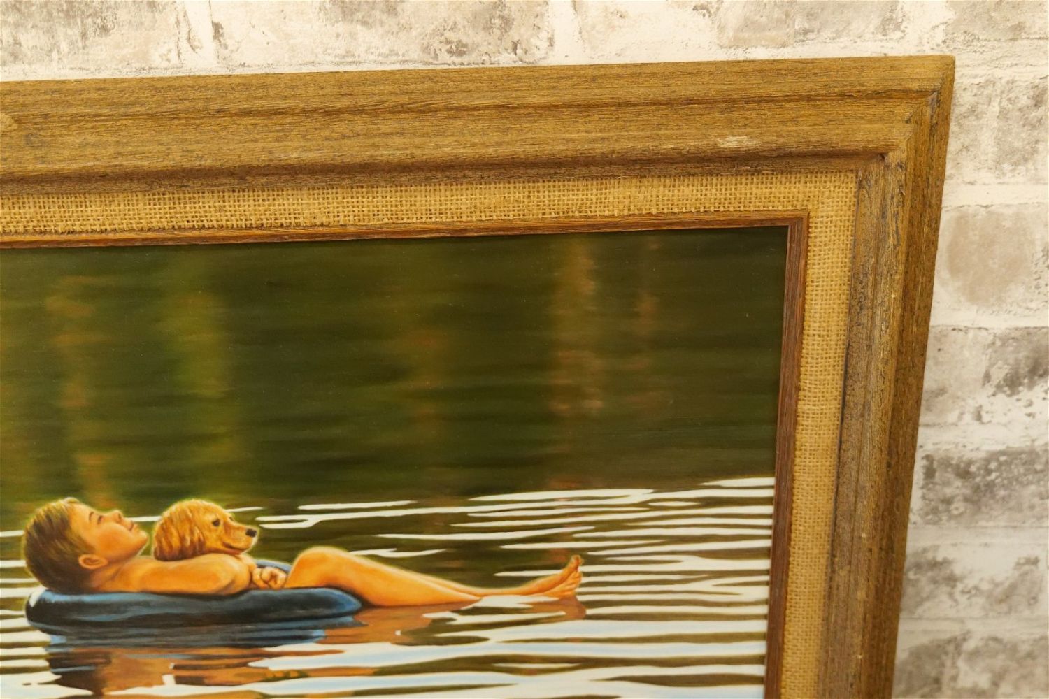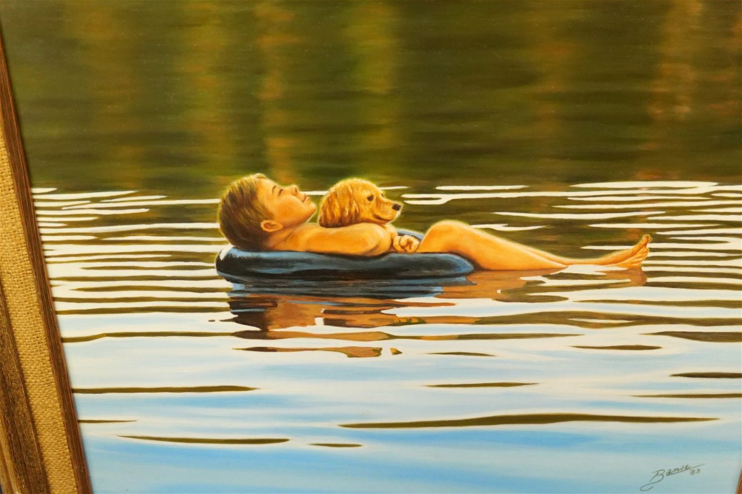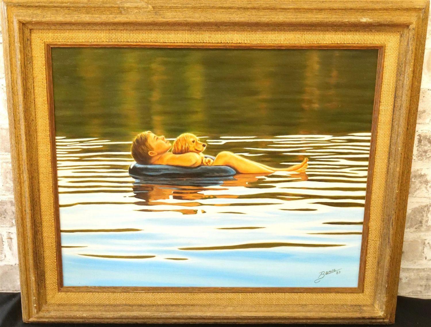 Original Oil on Board by Glen Fortune Banse (1948-2018). Depicting a Boy in a Tube in a Lake with a Dog. Signed Lower Right. Dated ’83. Measures 21" tall x 25". wide. Framed. Glen Fortune Banse (1948-2018) (aka Banse, Wayne Howell, Etienne and many other names) was born in Camden, New Jersey in 1948. He attended Ottawa University, Kansas State and The New School For Social Research in New York City, and has been a professional artist for close to 50 years. He was a co-partner in 3 Art Publishing businesses which specialized in Fine Art Signed and Numbered Limited Edition Lithography, Etchings and other fine art mediums. While publishing his own work, he was also the Art Director of all three companies and had the pleasure of working with, directing, and instructing hundreds of great nationally and internationally known artists such as Peter Max, Will Moses, John Pitre, Sarah Churchill (Daughter of Winston Churchill), Gerald Lubeck, Yanni Posnikov, and the world-famous Mr. Blackwell of Hollywood’s 10 Worst Dressed List presented each year. Throughout the 1990’s Glen was Personal Assistant, Confidant and Agent to Television Pioneer and Legend "Buffalo Bob" Smith of Howdy Doody fame, spending many years crisscrossing America with the Iconic Duo. Glen more recently focused his energy on Oils, presenting a well diversified subject matter. His works and portraits have been commissioned by the state of New Jersey, with pieces on permanent display in various State Buildings throughout the Garden State. His Art can be found in museums, galleries, celebrity collections and other venues through out the world.Provenance: This piece was consigned from the estate of Glen Fortune BanseAll invoices must be paid within 24 hours of the sale. We offer multiple shipping options, please read the terms as they have changed. We also offer Pick-Ups Thursday, Friday, Saturday, and Monday immediately following the sale. BY APPOINTMENT ONLY. PLEASE READ THE NEW TERMS!!!