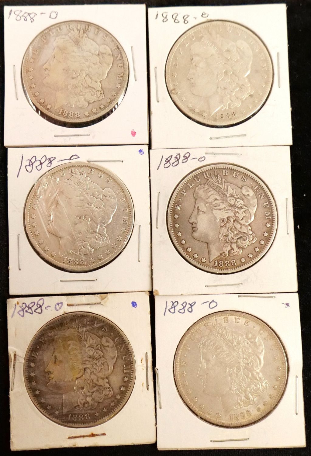 Lot of 6 1888-O Morgan Silver Dollars. Bodnar’s Auction is not grading any coins in this sale, nor are we making any representation of the grade or condition of any of the coins. Please see the Photos for condition and ask any and all questions Prior to bidding. We will be happy to send over more Photos if requested. All invoices must be Paid within 24 hours of the sale. We offer multiple shipping options, Please read the terms as they have changed. We also offer Pick-Ups Thursday, Friday, Saturday, and Monday immediately following the sale. BY APPOINTMENT ONLY. PLEASE READ THE NEW TERMS!!!