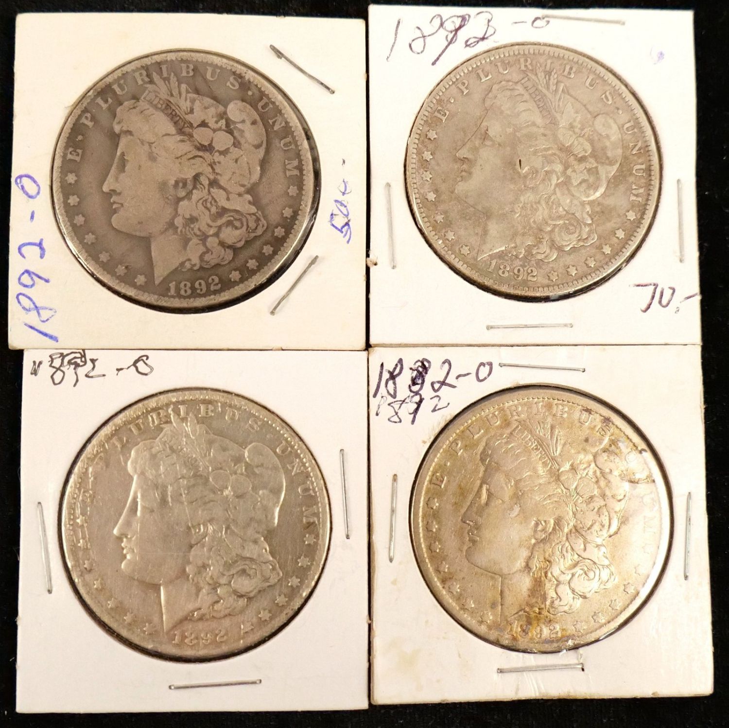 Lot of 4 1892-O Morgan Silver Dollars. Bodnar’s Auction is not grading any coins in this sale, nor are we making any representation of the grade or condition of any of the coins. Please see the Photos for condition and ask any and all questions Prior to bidding. We will be happy to send over more Photos if requested. All invoices must be Paid within 24 hours of the sale. We offer multiple shipping options, Please read the terms as they have changed. We also offer Pick-Ups Thursday, Friday, Saturday, and Monday immediately following the sale. BY APPOINTMENT ONLY. PLEASE READ THE NEW TERMS!!!