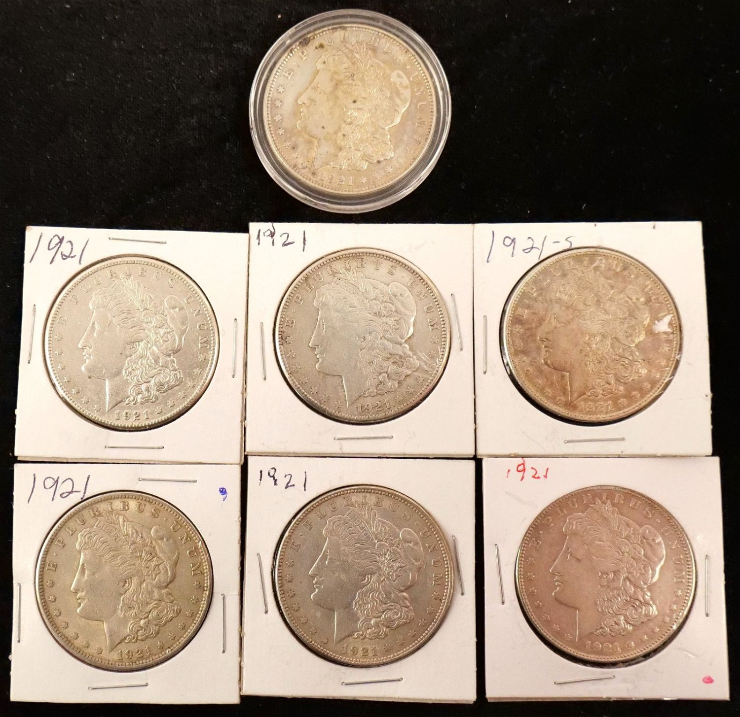 Lot of 7 1921-P Morgan Silver Dollars. Bodnar’s Auction is not grading any coins in this sale, nor are we making any representation of the grade or condition of any of the coins. Please see the Photos for condition and ask any and all questions Prior to bidding. We will be happy to send over more Photos if requested. All invoices must be Paid within 24 hours of the sale. We offer multiple shipping options, Please read the terms as they have changed. We also offer Pick-Ups Thursday, Friday, Saturday, and Monday immediately following the sale. BY APPOINTMENT ONLY. PLEASE READ THE NEW TERMS!!!