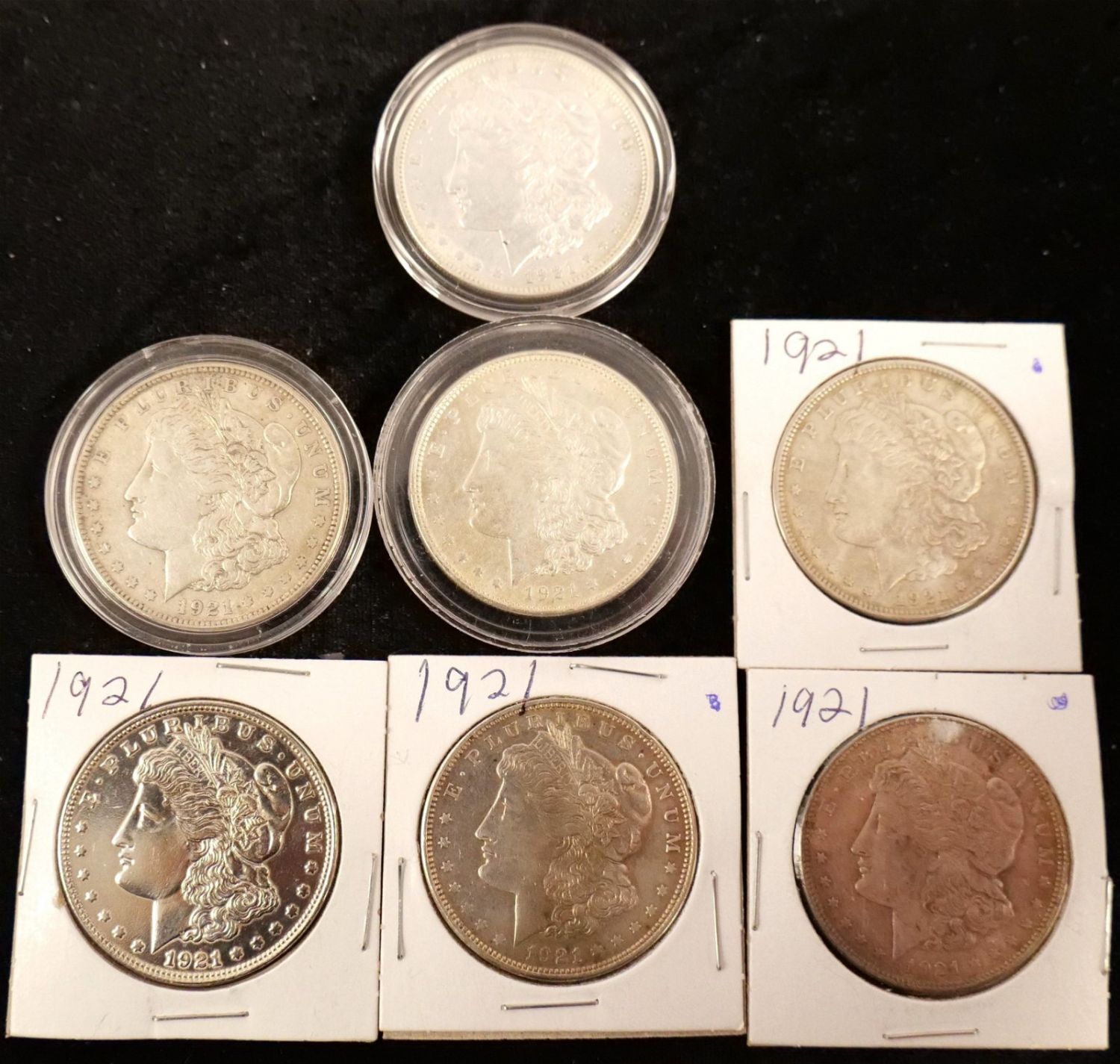 Lot of 7 1921-P Morgan Silver Dollars. Bodnar’s Auction is not grading any coins in this sale, nor are we making any representation of the grade or condition of any of the coins. Please see the Photos for condition and ask any and all questions Prior to bidding. We will be happy to send over more Photos if requested. All invoices must be Paid within 24 hours of the sale. We offer multiple shipping options, Please read the terms as they have changed. We also offer Pick-Ups Thursday, Friday, Saturday, and Monday immediately following the sale. BY APPOINTMENT ONLY. PLEASE READ THE NEW TERMS!!!