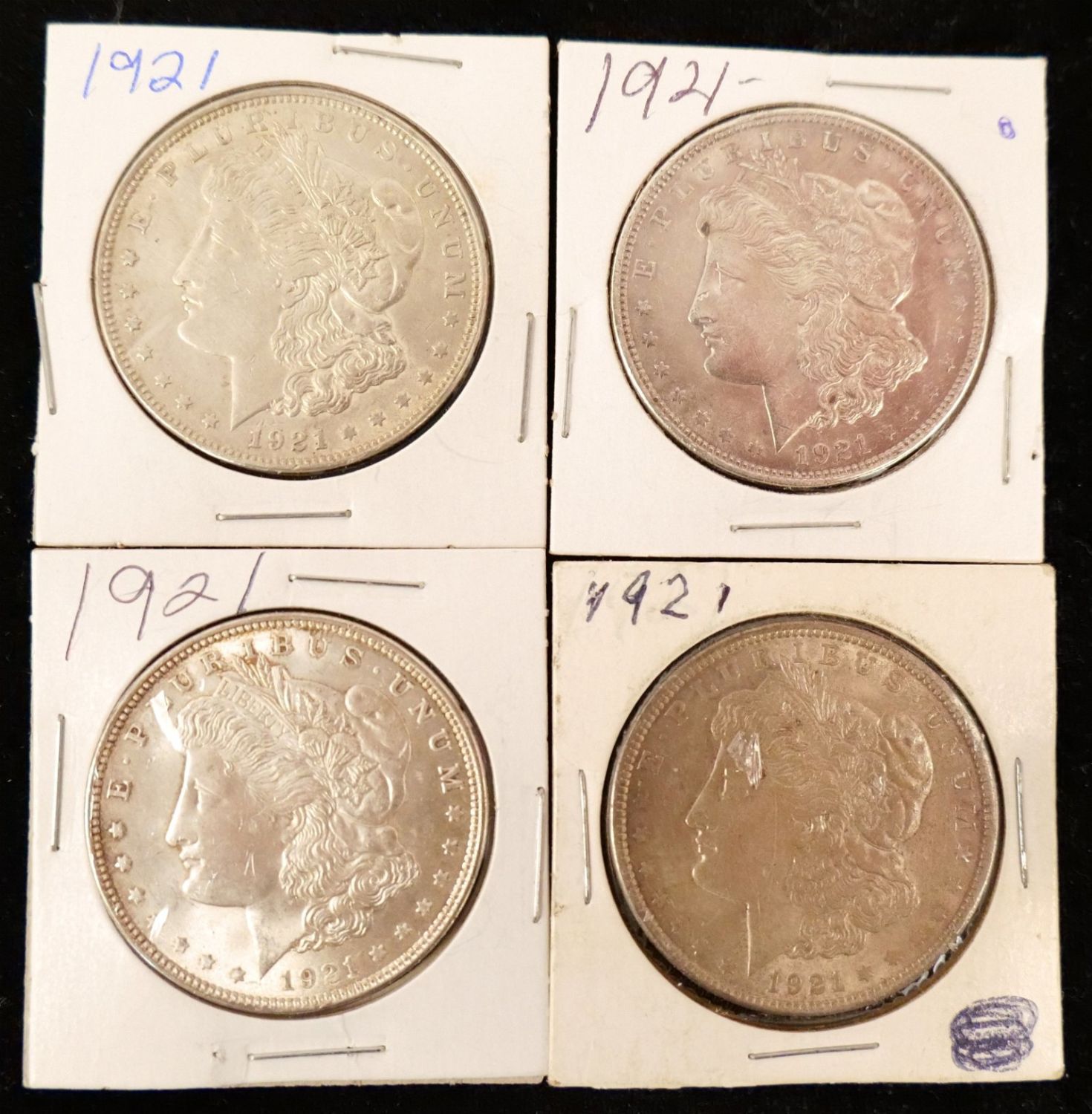 Lot of 4 1921-P Morgan Silver Dollars. Bodnar’s Auction is not grading any coins in this sale, nor are we making any representation of the grade or condition of any of the coins. Please see the Photos for condition and ask any and all questions Prior to bidding. We will be happy to send over more Photos if requested. All invoices must be Paid within 24 hours of the sale. We offer multiple shipping options, Please read the terms as they have changed. We also offer Pick-Ups Thursday, Friday, Saturday, and Monday immediately following the sale. BY APPOINTMENT ONLY. PLEASE READ THE NEW TERMS!!!