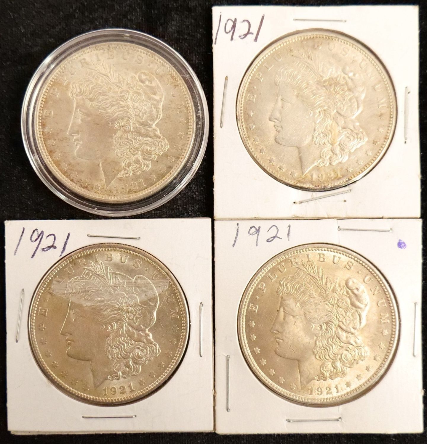 Lot of 4 1921-P Morgan Silver Dollars. Bodnar’s Auction is not grading any coins in this sale, nor are we making any representation of the grade or condition of any of the coins. Please see the Photos for condition and ask any and all questions Prior to bidding. We will be happy to send over more Photos if requested. All invoices must be Paid within 24 hours of the sale. We offer multiple shipping options, Please read the terms as they have changed. We also offer Pick-Ups Thursday, Friday, Saturday, and Monday immediately following the sale. BY APPOINTMENT ONLY. PLEASE READ THE NEW TERMS!!!