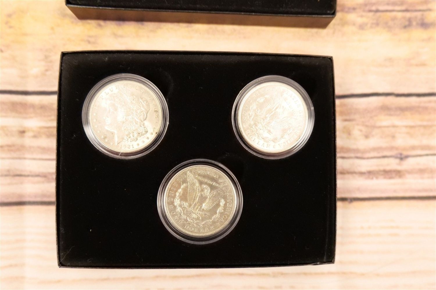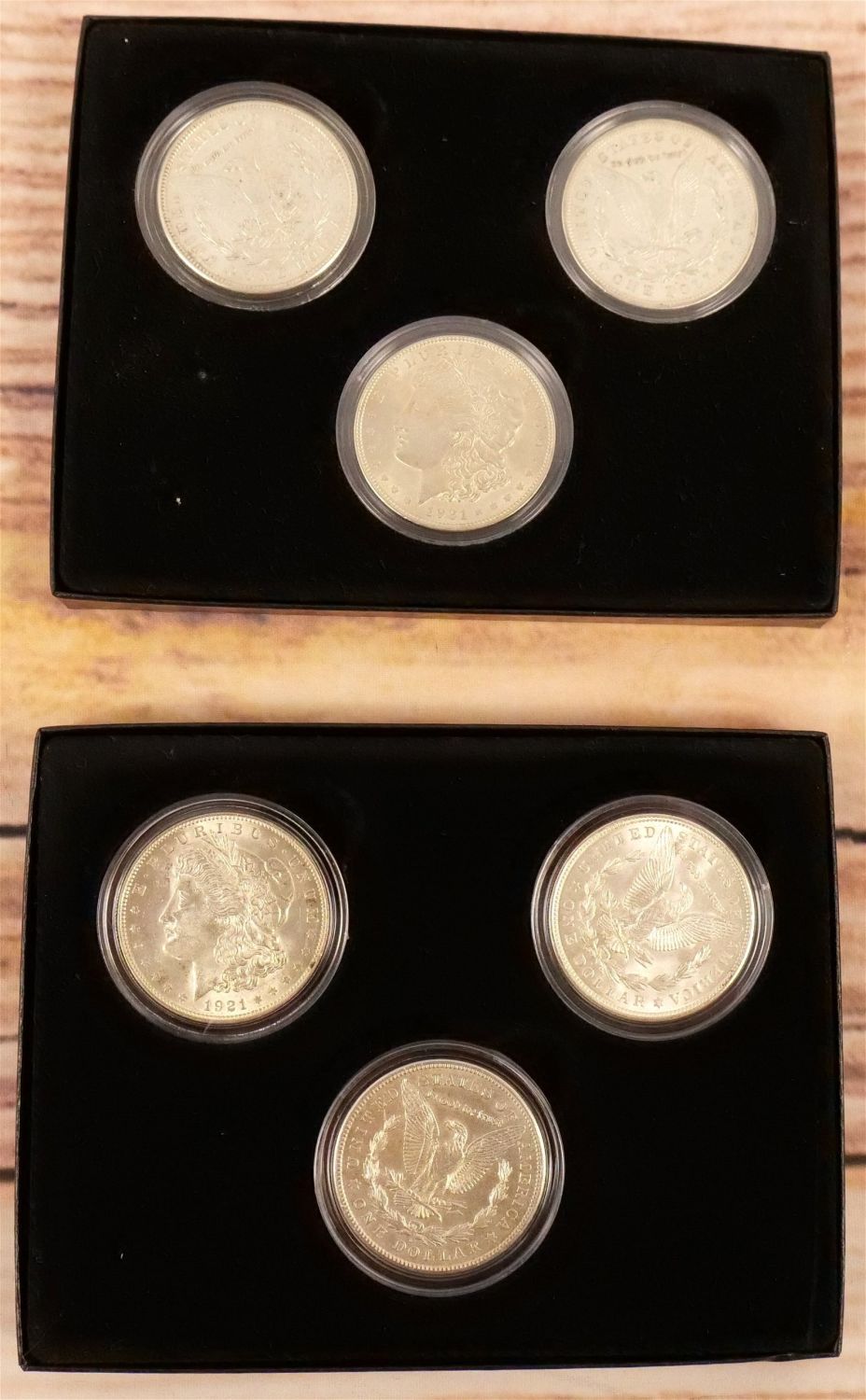 Lot of 6 Morgan Silver Dollars – 2 Box Sets Each containing 1921-P, 1921-D, and 1921-S. Bodnar’s Auction is not grading any coins in this sale, nor are we making any representation of the grade or condition of any of the coins. Please see the Photos for condition and ask any and all questions Prior to bidding. We will be happy to send over more Photos if requested. All invoices must be Paid within 24 hours of the sale. We offer multiple shipping options, Please read the terms as they have changed. We also offer Pick-Ups Thursday, Friday, Saturday, and Monday immediately following the sale. BY APPOINTMENT ONLY. PLEASE READ THE NEW TERMS!!!
