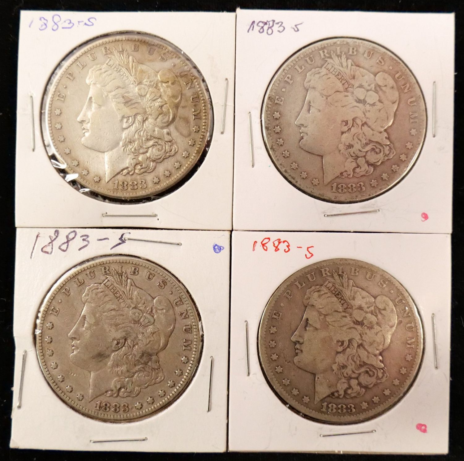 Lot of 4 1883-S Morgan Silver Dollars. Bodnar’s Auction is not grading any coins in this sale, nor are we making any representation of the grade or condition of any of the coins. Please see the Photos for condition and ask any and all questions Prior to bidding. We will be happy to send over more Photos if requested. All invoices must be Paid within 24 hours of the sale. We offer multiple shipping options, Please read the terms as they have changed. We also offer Pick-Ups Thursday, Friday, Saturday, and Monday immediately following the sale. BY APPOINTMENT ONLY. PLEASE READ THE NEW TERMS!!!