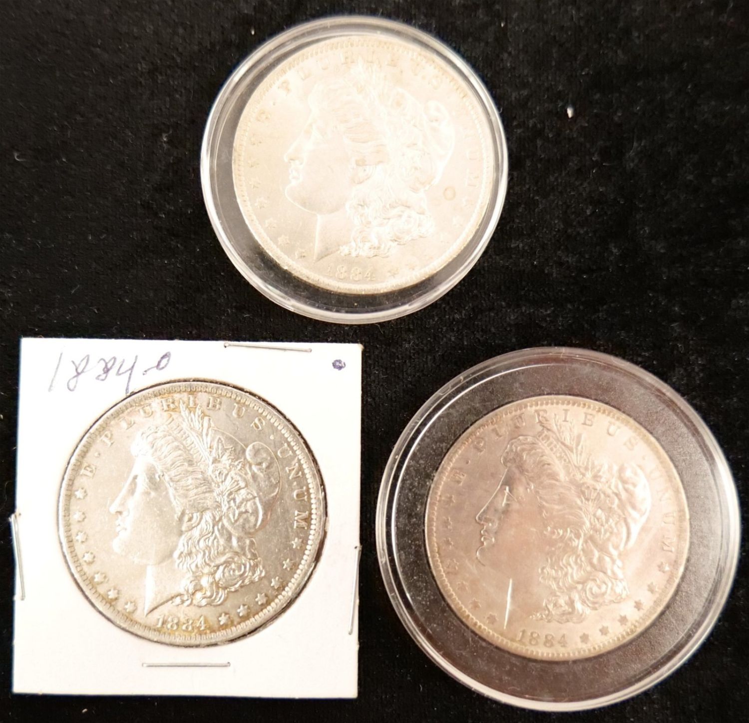 Lot of 3 1884-O Morgan Silver Dollars. Bodnar’s Auction is not grading any coins in this sale, nor are we making any representation of the grade or condition of any of the coins. Please see the Photos for condition and ask any and all questions Prior to bidding. We will be happy to send over more Photos if requested. All invoices must be Paid within 24 hours of the sale. We offer multiple shipping options, Please read the terms as they have changed. We also offer Pick-Ups Thursday, Friday, Saturday, and Monday immediately following the sale. BY APPOINTMENT ONLY. PLEASE READ THE NEW TERMS!!!