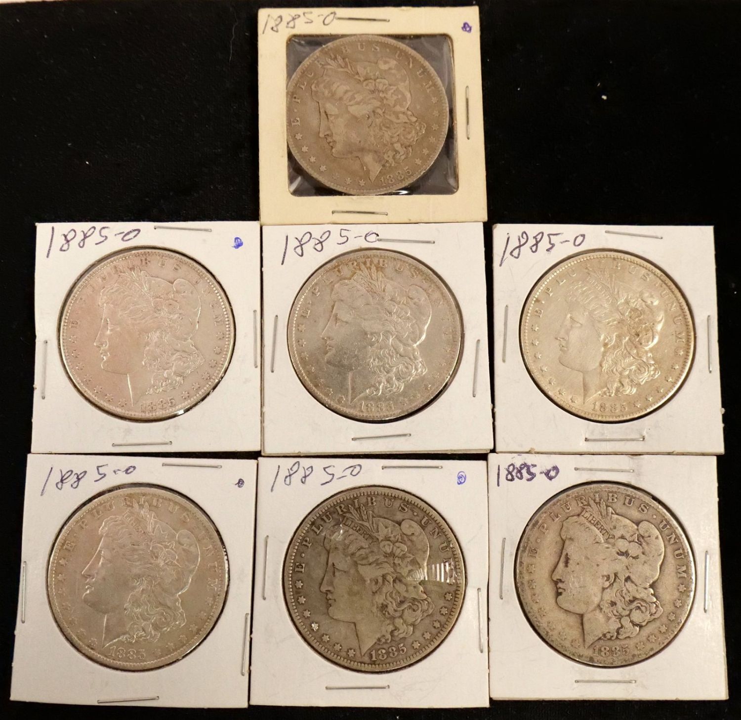 Lot of 7 1885-O Morgan Silver Dollars. Bodnar’s Auction is not grading any coins in this sale, nor are we making any representation of the grade or condition of any of the coins. Please see the Photos for condition and ask any and all questions Prior to bidding. We will be happy to send over more Photos if requested. All invoices must be Paid within 24 hours of the sale. We offer multiple shipping options, Please read the terms as they have changed. We also offer Pick-Ups Thursday, Friday, Saturday, and Monday immediately following the sale. BY APPOINTMENT ONLY. PLEASE READ THE NEW TERMS!!!