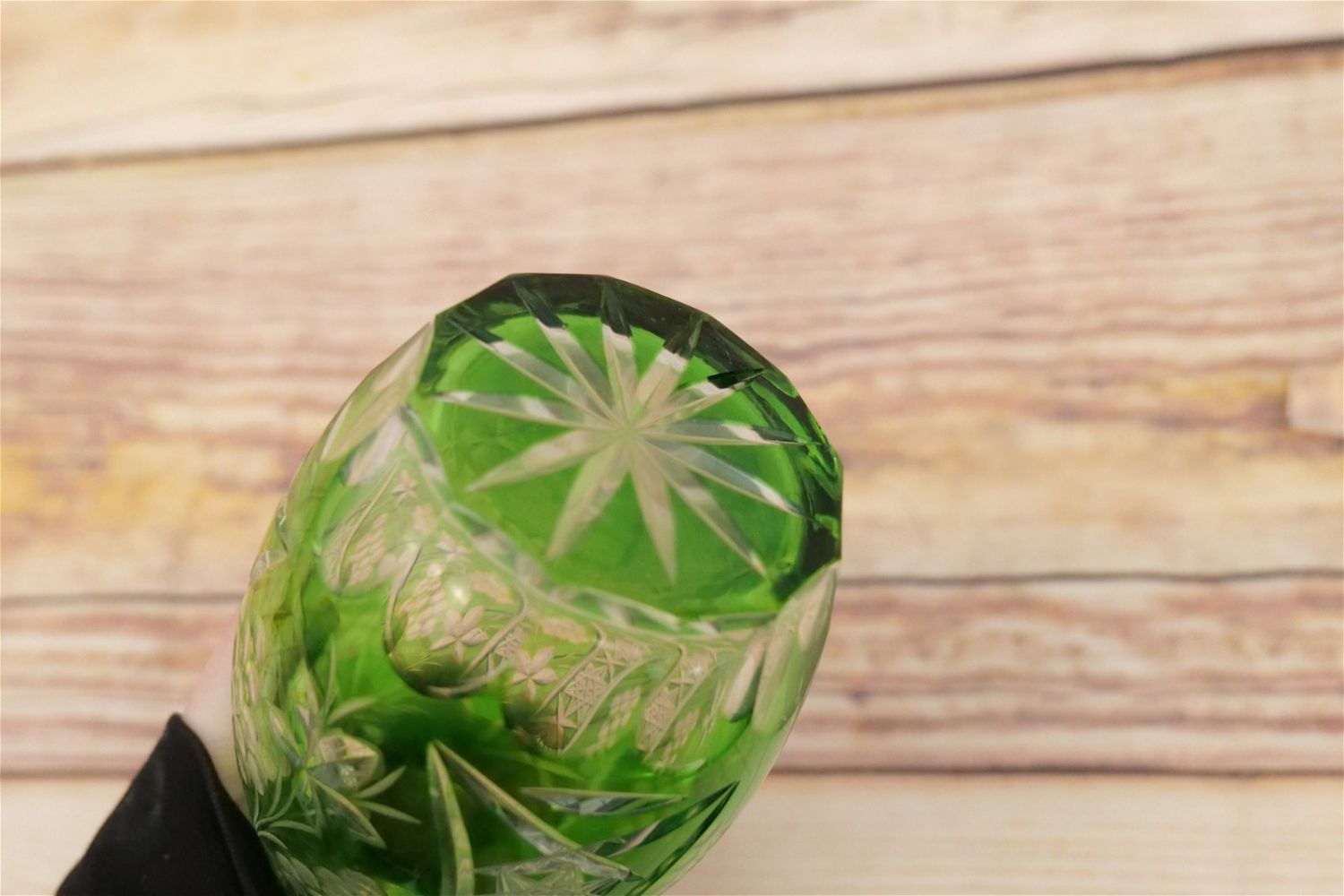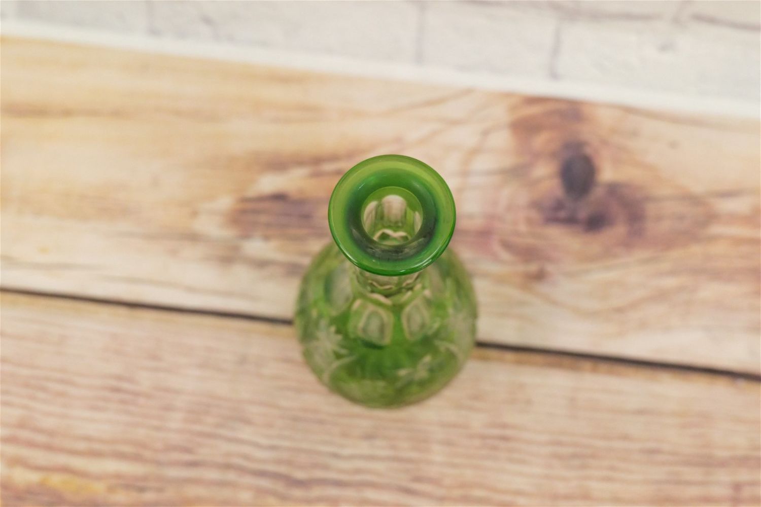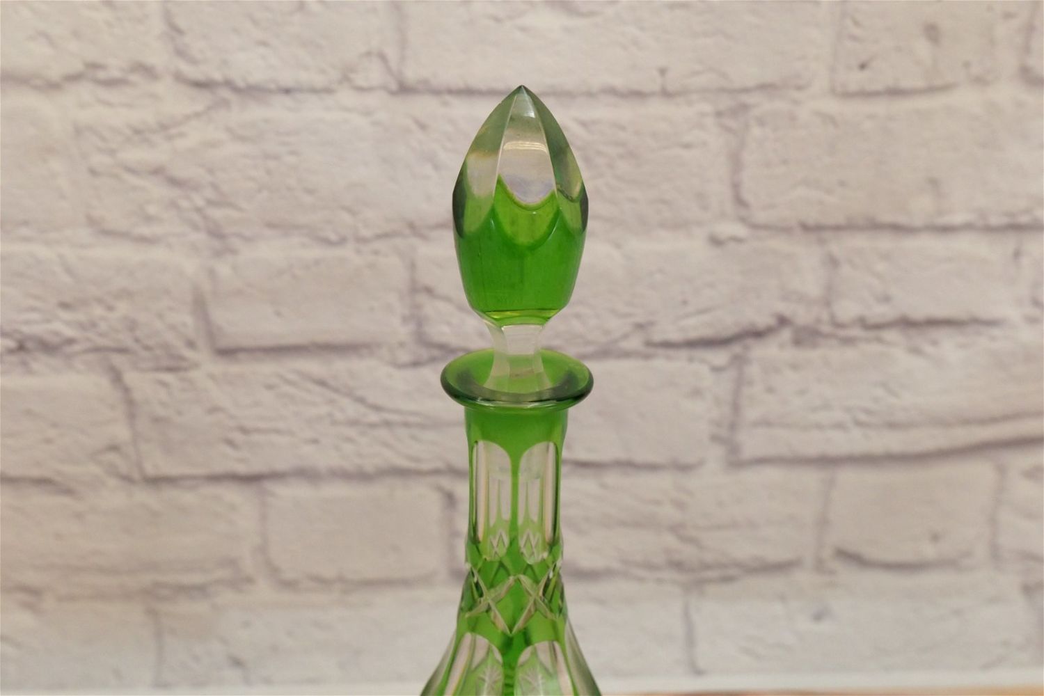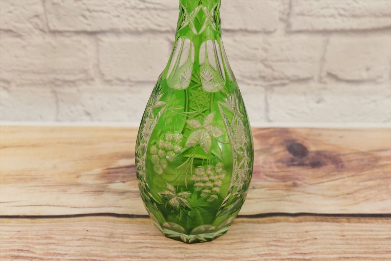 Green cut to clear decanter. Measures 14 1/2" tall x 4 1/2" wide. All invoices must be paid within 24 hours of the sale. We offer multiple shipping options, please read the terms as they have changed. We also offer Pick-Ups Thursday, Friday, Saturday, and Monday immediately following the sale. BY APPOINTMENT ONLY. PLEASE READ THE NEW TERMS!!!