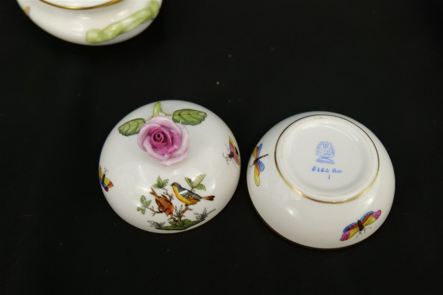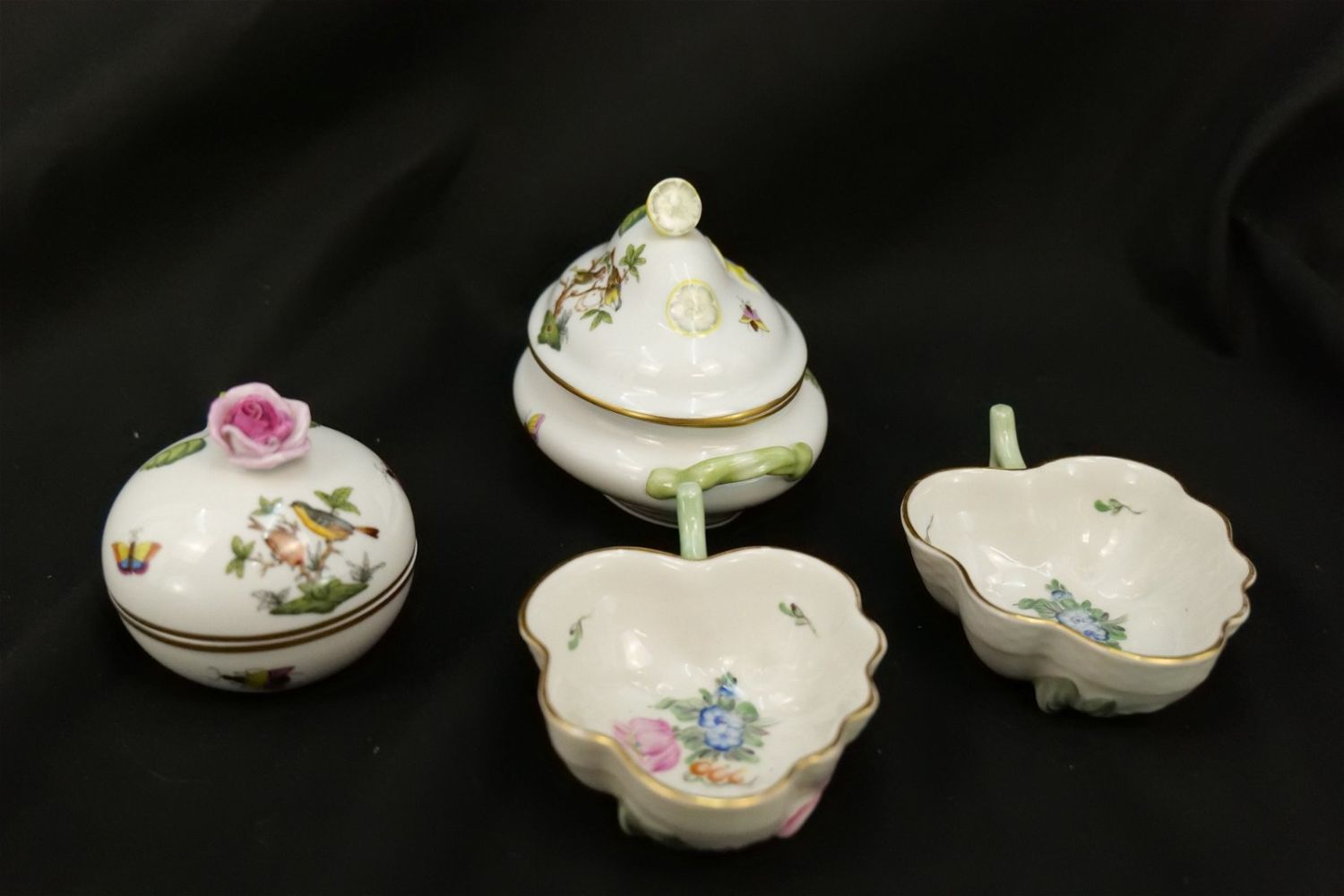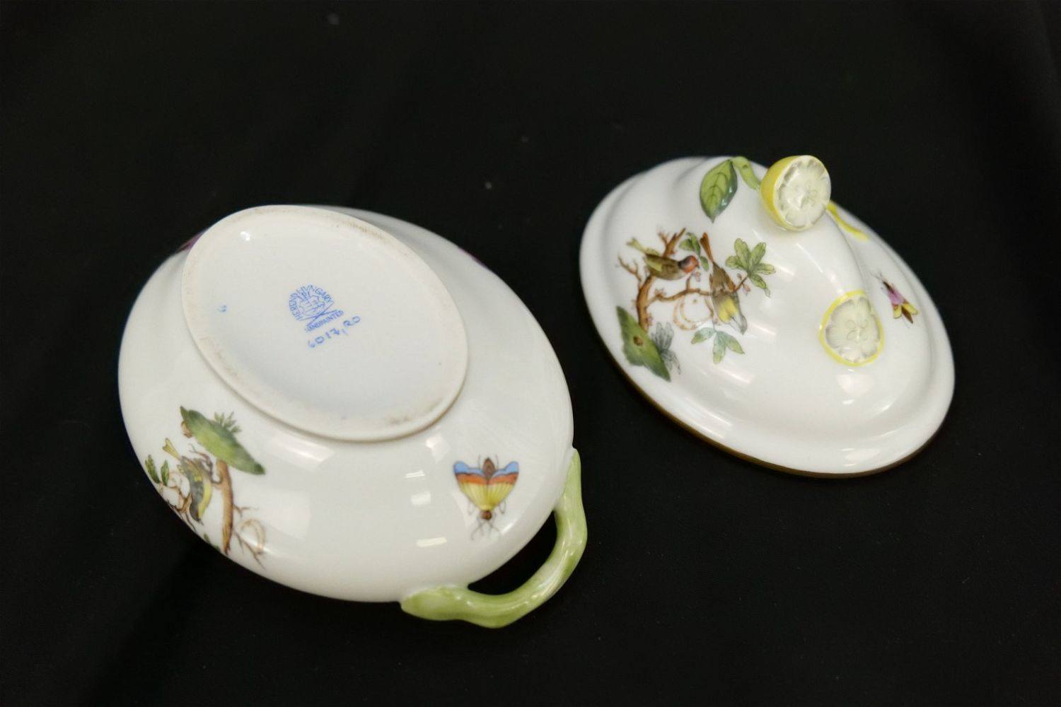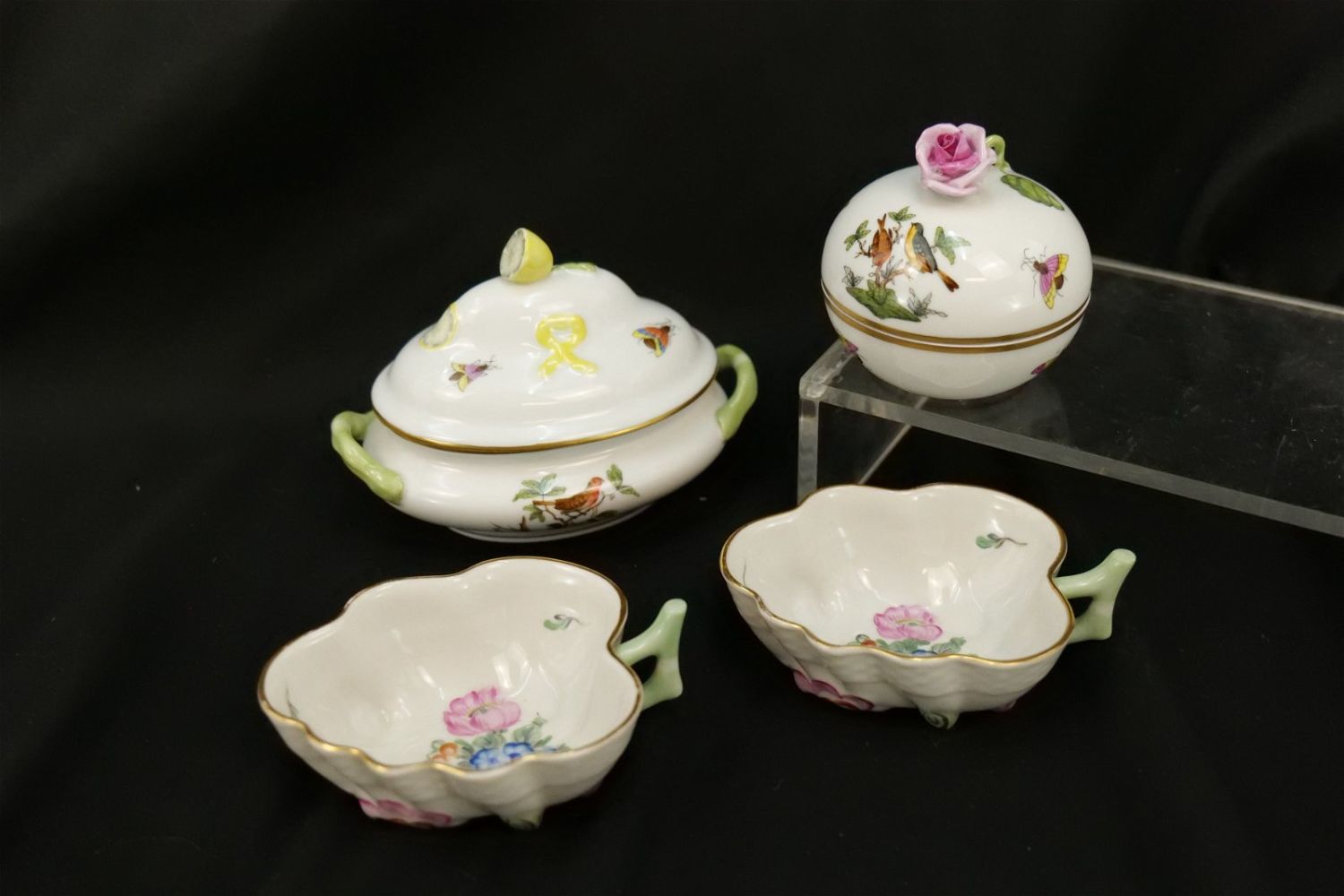 Group Lot of Herend including Rothchild Covered Sugar in the form of Miniature Tureen with Lemon Top, Rothchild Covered Dresser Box, and Pair of Leaf Dishes. Largest measures 4" tall. All invoices must be paid within 24 hours of the sale. We offer multiple shipping options, please read the terms as they have changed. We also offer Pick-Ups Thursday, Friday, Saturday, and Monday immediately following the sale. BY APPOINTMENT ONLY. PLEASE READ THE NEW TERMS!!!