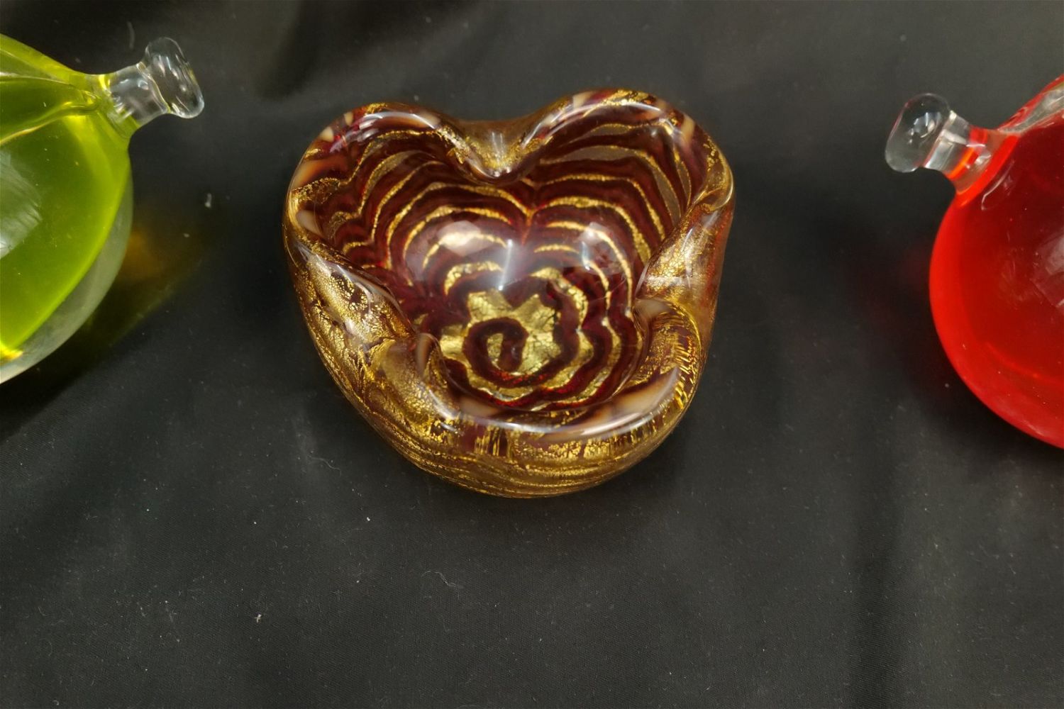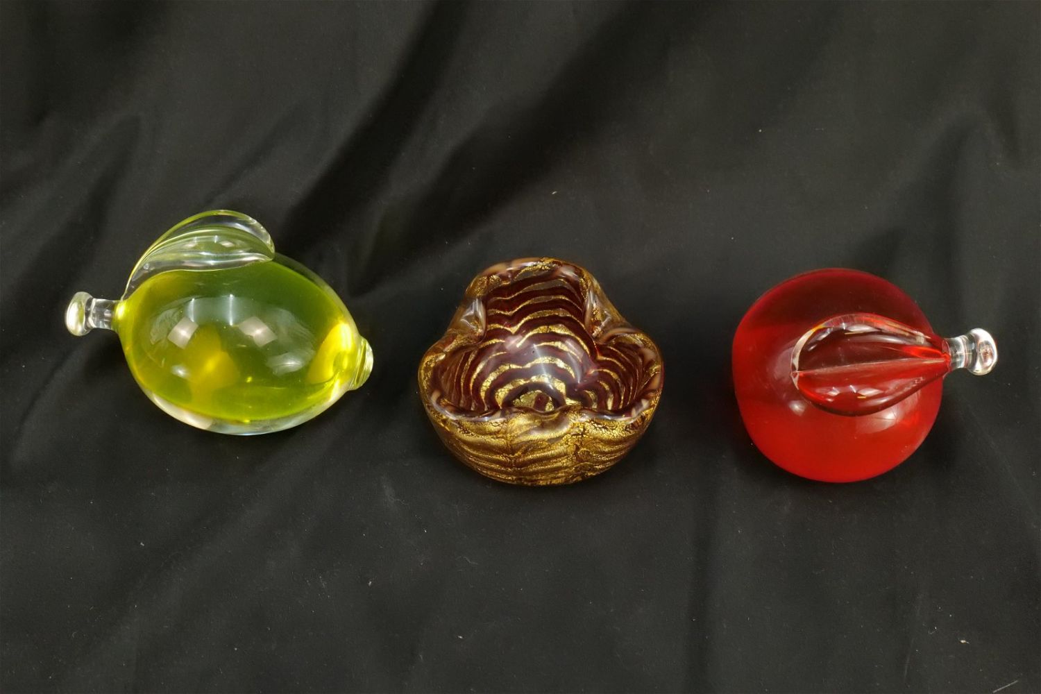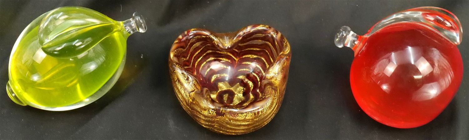 3 pieces Murano glass including a lemon, an orange (has minute chip) and a gold ashtray/ Largest measures 4" tall. All invoices must be paid within 24 hours of the sale. We offer multiple shipping options, please read the terms as they have changed. We also offer Pick-Ups Thursday, Friday, Saturday, and Monday immediately following the sale. BY APPOINTMENT ONLY. PLEASE READ THE NEW TERMS!!!