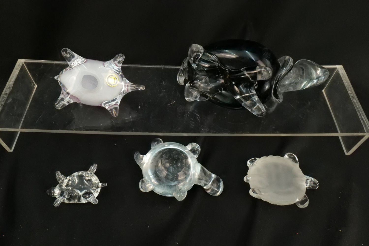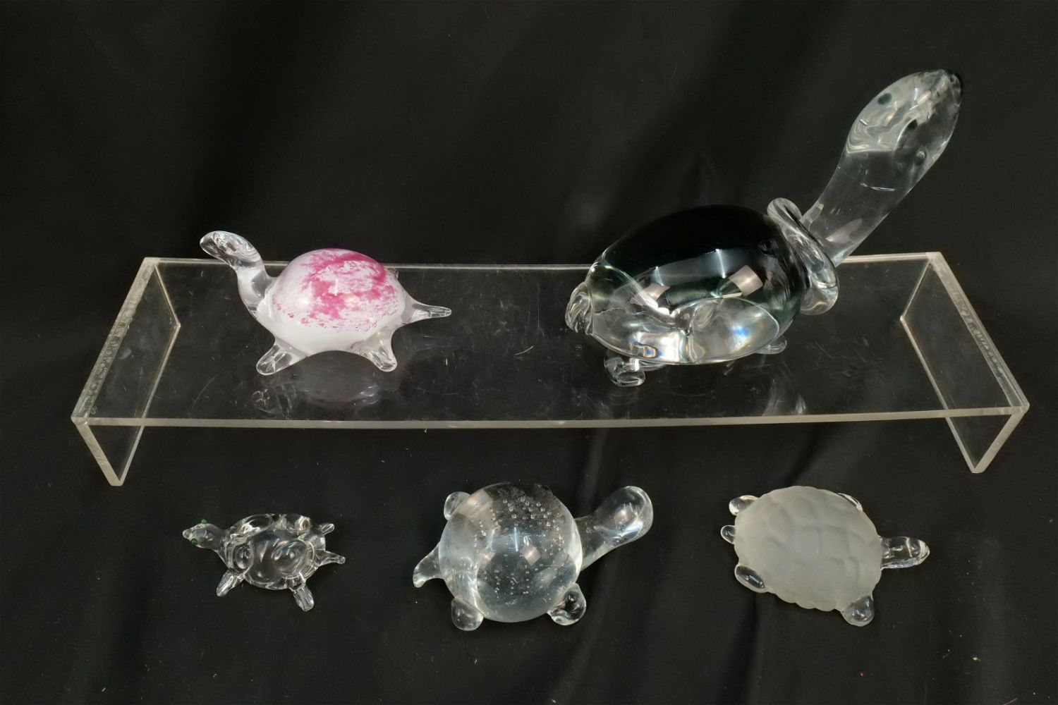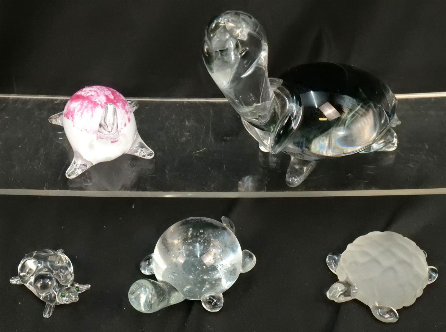 Group of 5 art glass turtles including a large Murano turtle, lead crystal Granna glass Swedish turtle, a frosted glass turtle in a Lalique style, a paperweight turtle with a bubble control shell and an art glass miniature turtle with green eyes. Largest measures 6" tall. All invoices must be paid within 24 hours of the sale. We offer multiple shipping options, please read the terms as they have changed. We also offer Pick-Ups Thursday, Friday, Saturday, and Monday immediately following the sale. BY APPOINTMENT ONLY. PLEASE READ THE NEW TERMS!!!